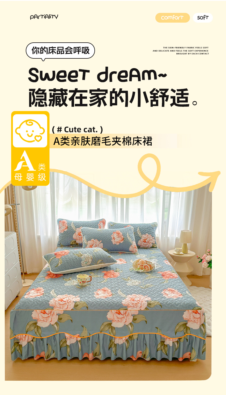 当前位置: 91家纺网 > 商品网购 > 床上用品 > 床裙 > 笠裙家纺 2025新款磨毛夹棉S边单件三件套韩版防滑床裙单床裙床裙单件 婉华