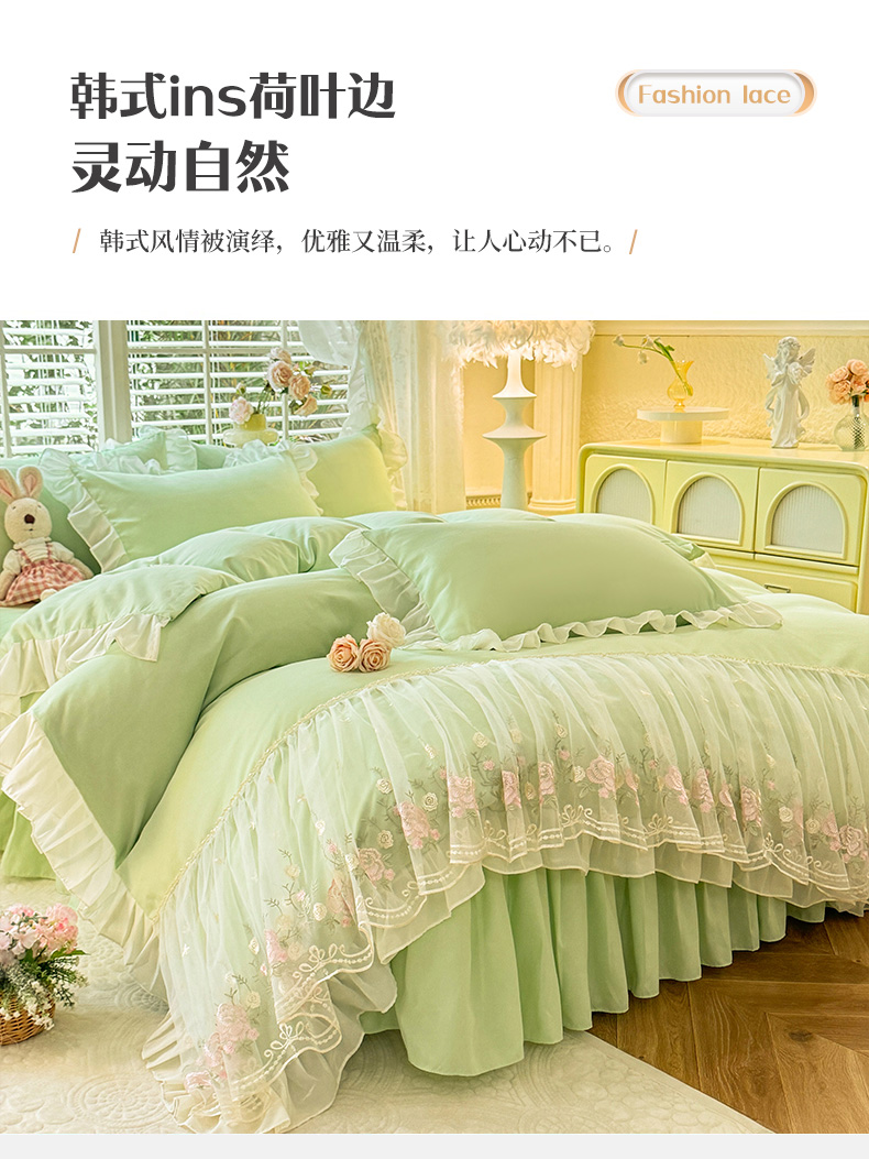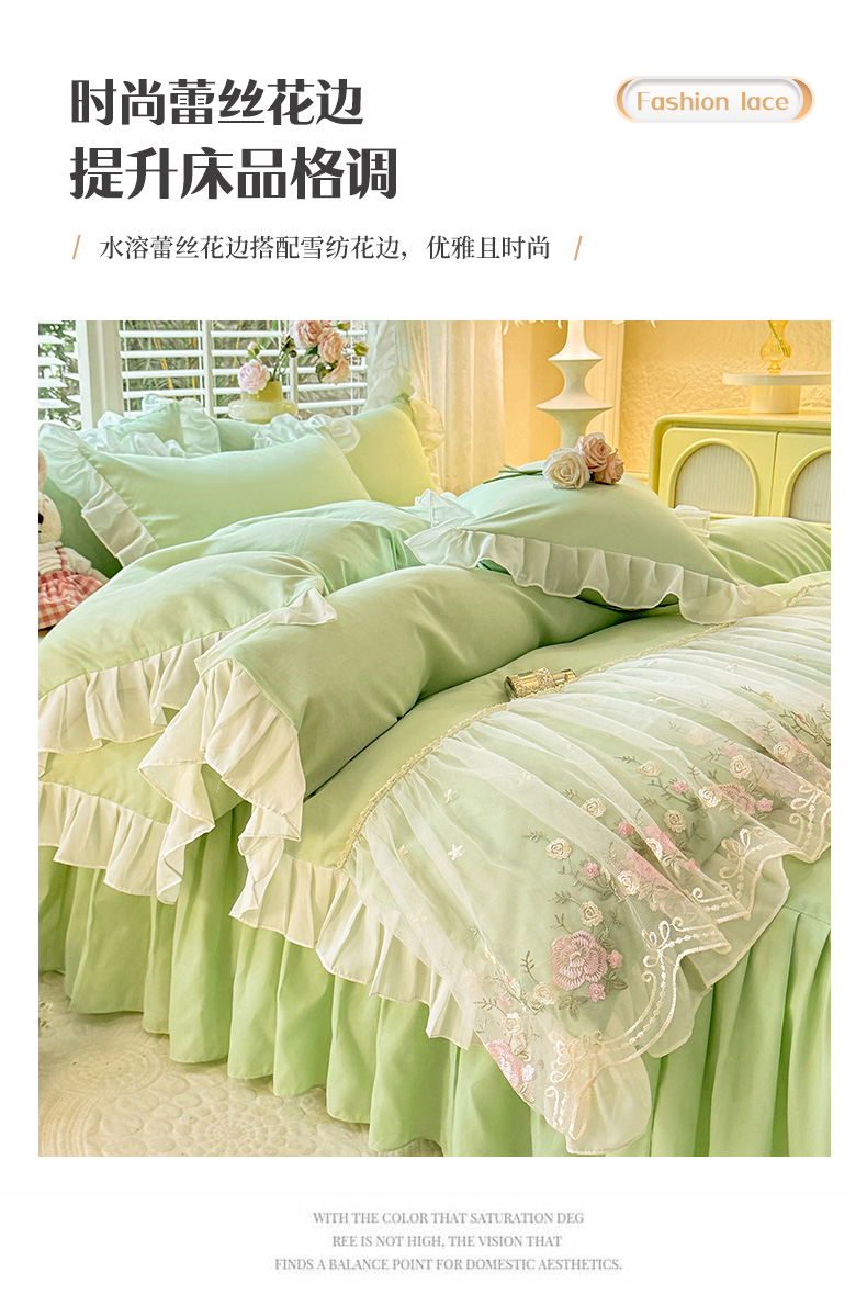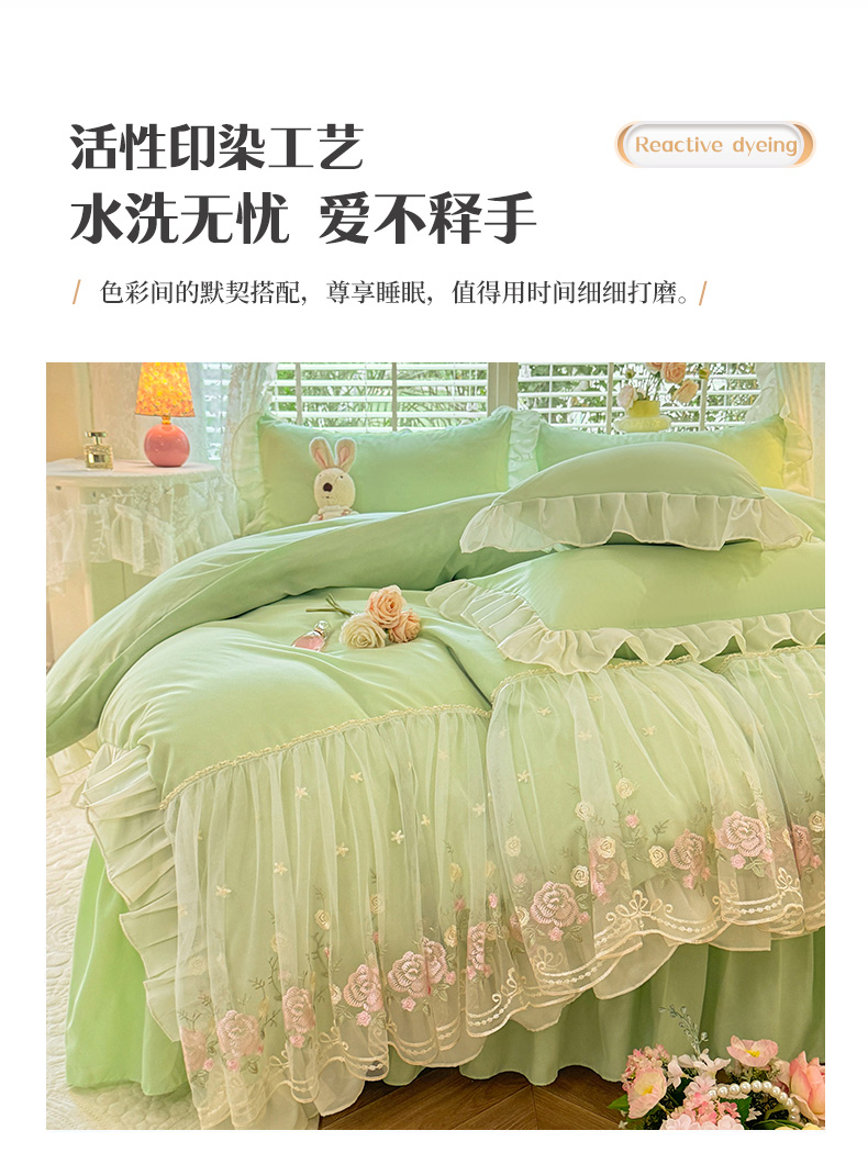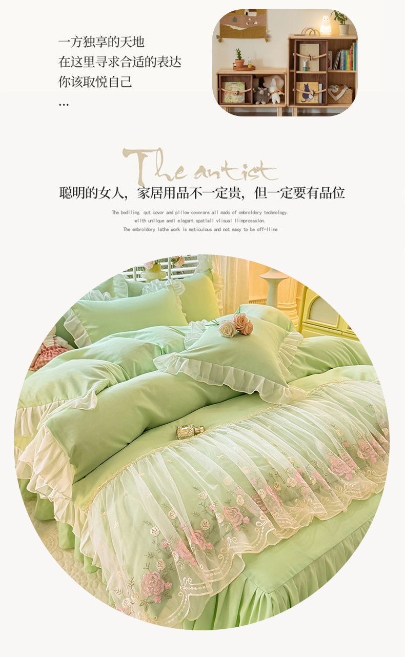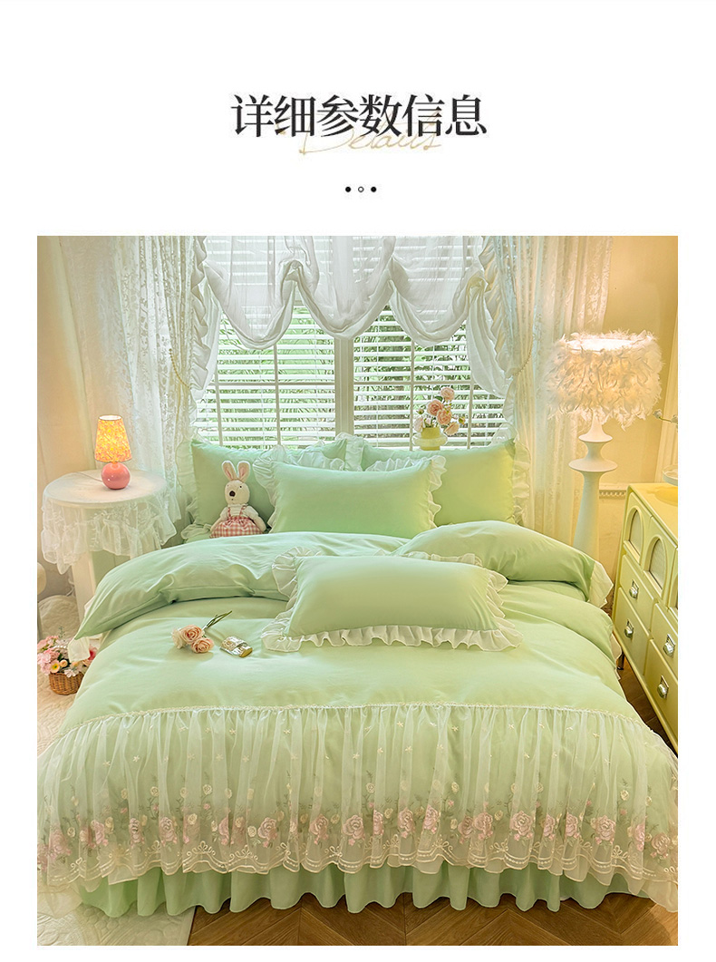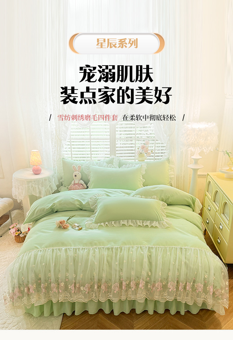 当前位置: 91家纺网 > 商品网购 > 床品套件 > 四件套 > 其它四件套 > 后庭寝室 2025新款韩版蕾丝床裙款四件套-星辰系列 星辰-嫩绿