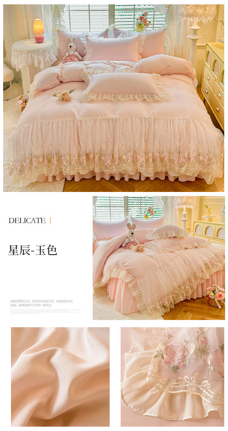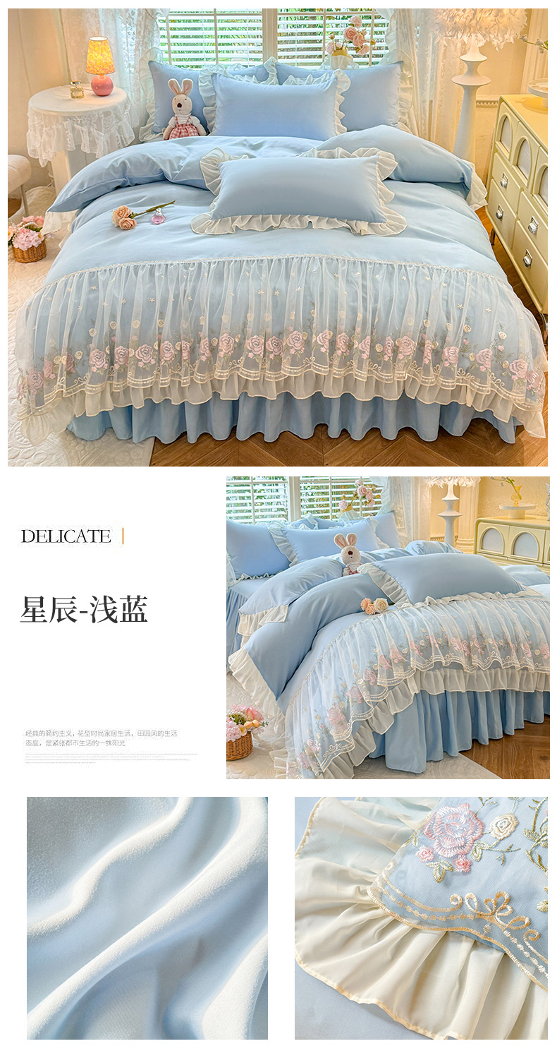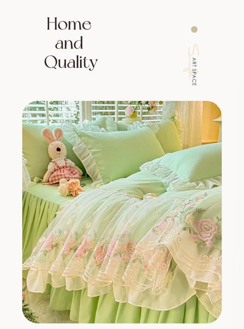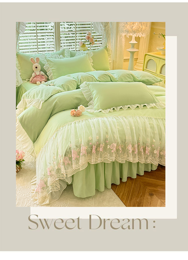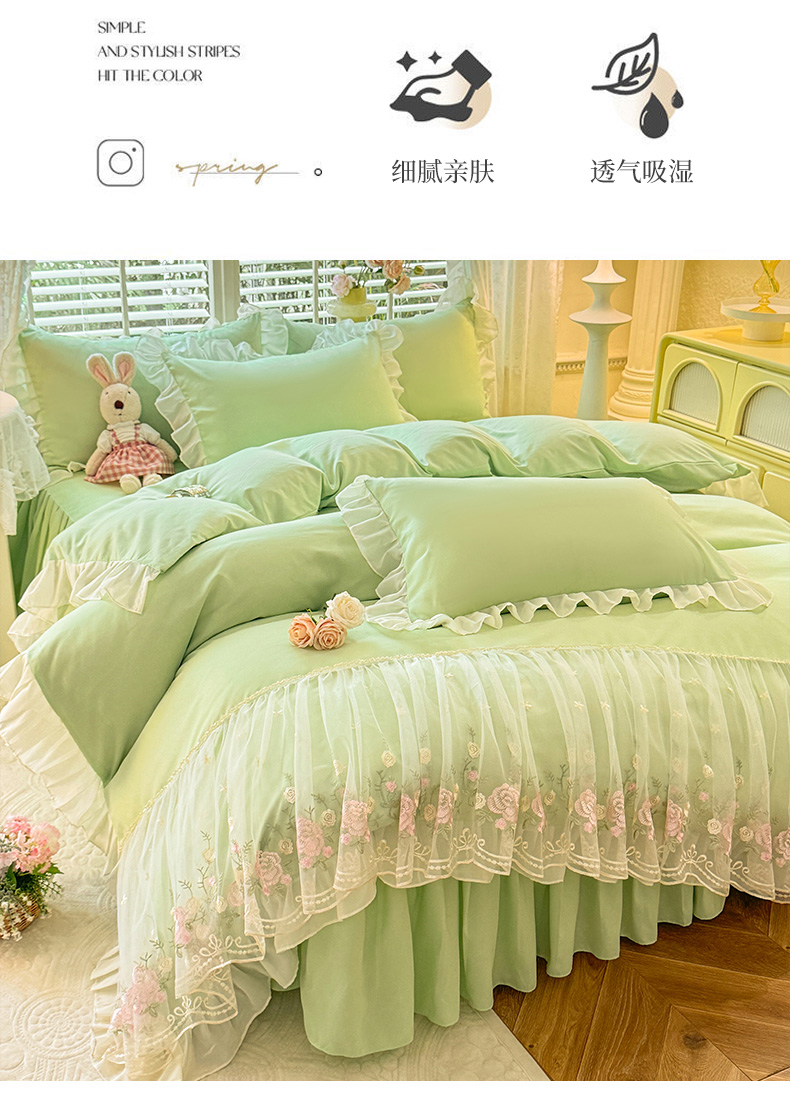 当前位置: 91家纺网 > 商品网购 > 床品套件 > 四件套 > 其它四件套 > 后庭寝室 2025新款韩版蕾丝床裙款四件套-星辰系列 星辰-嫩绿