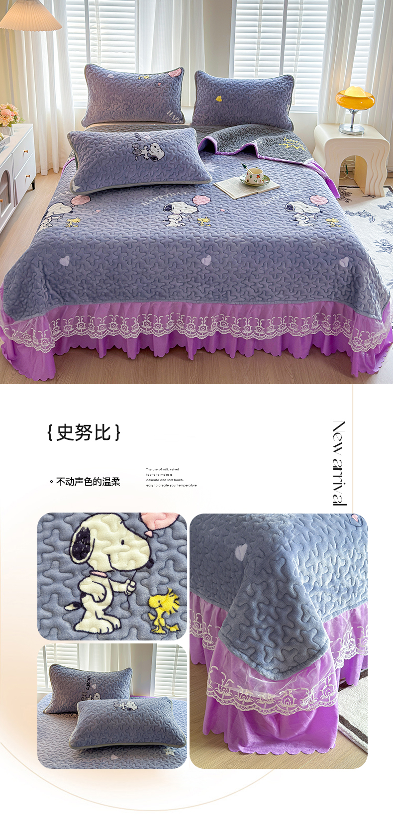 商品名称:梓依家纺 2025新款牛奶绒单床裙款蕾丝床盖三件套四件套 史努比