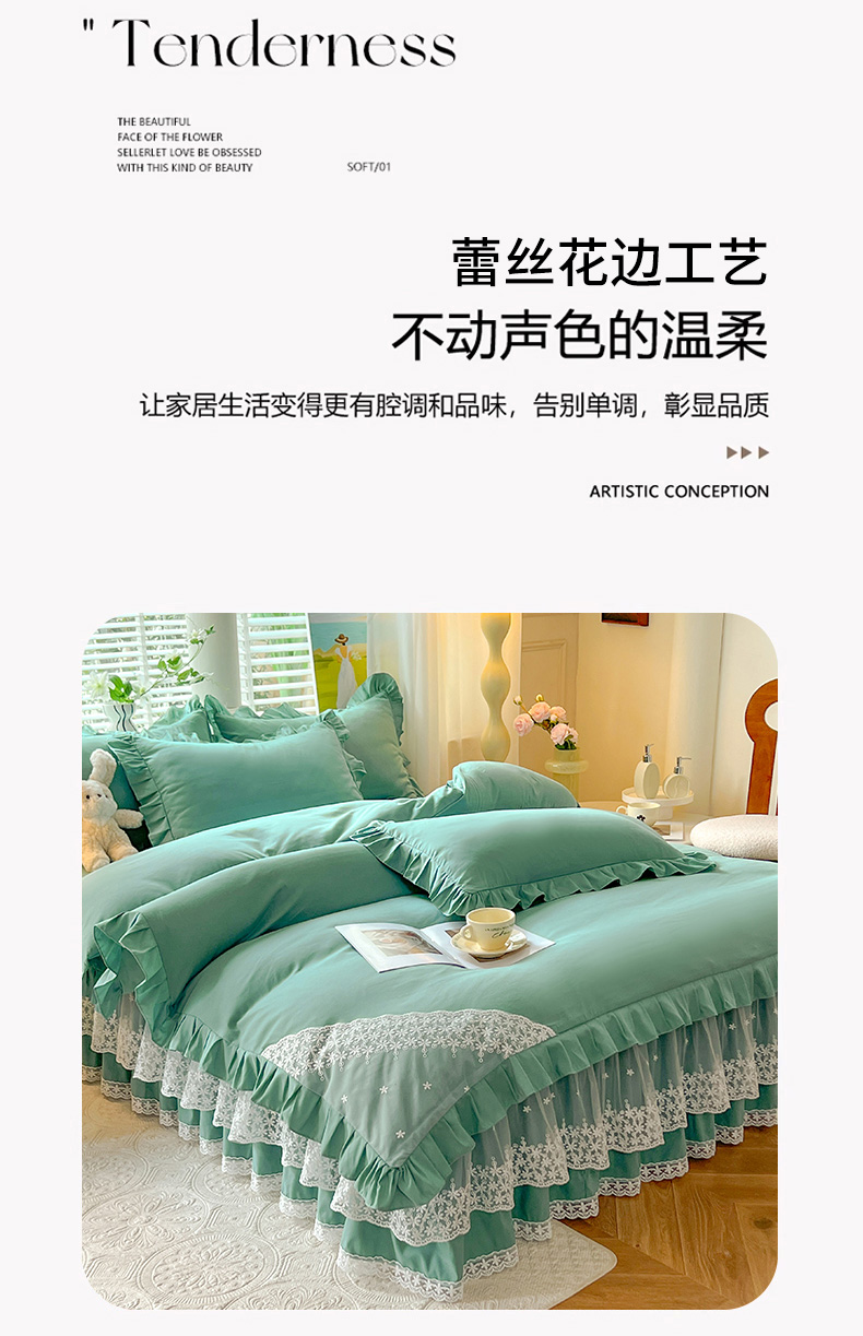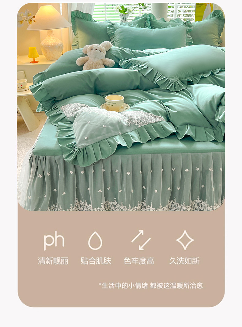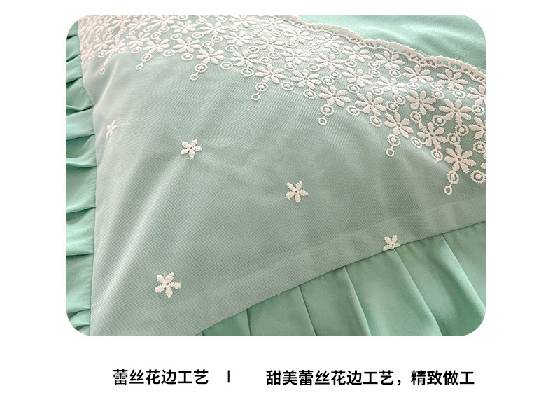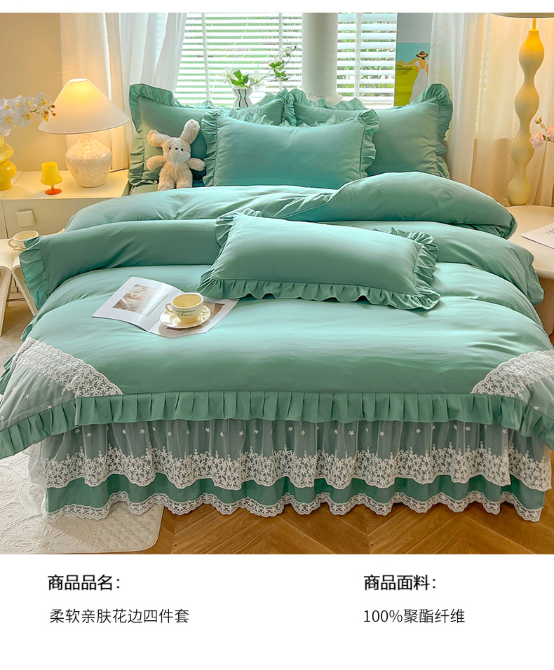 商品名称:后庭寝室 2025新款柔软亲肤花边蕾丝床裙四件套-花颜系列 花颜-绿色