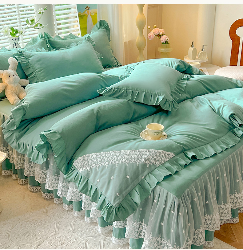 后庭寝室 2025新款柔软亲肤花边蕾丝床裙四件套-花颜系列 花颜-绿色