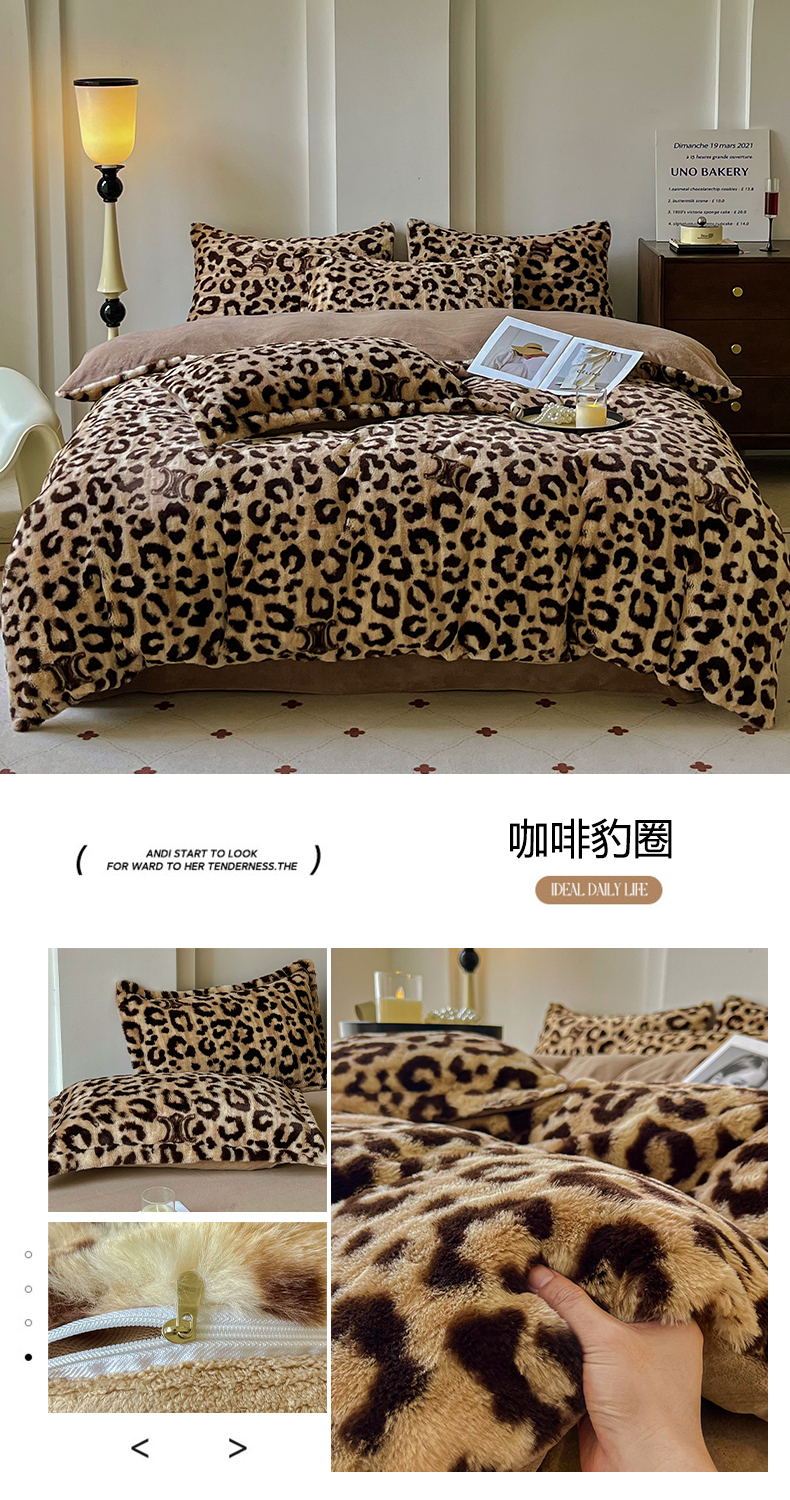 商品名称:梦纤绒 2025新款亲肤舒适兔毛印花牛奶绒保暖四件套一美拉德系 咖啡豹圈