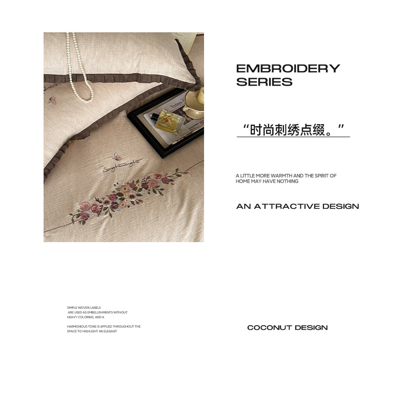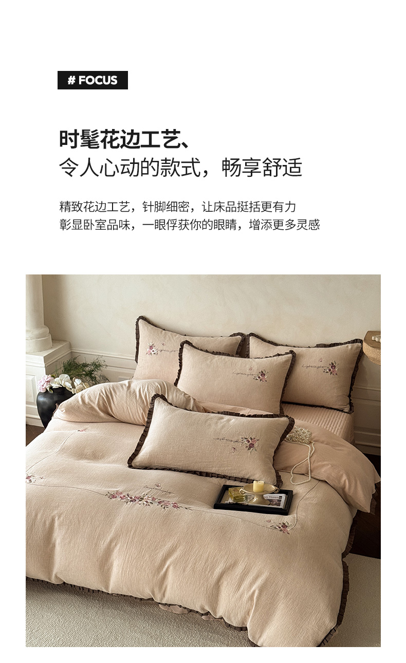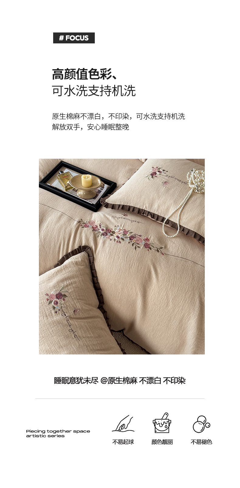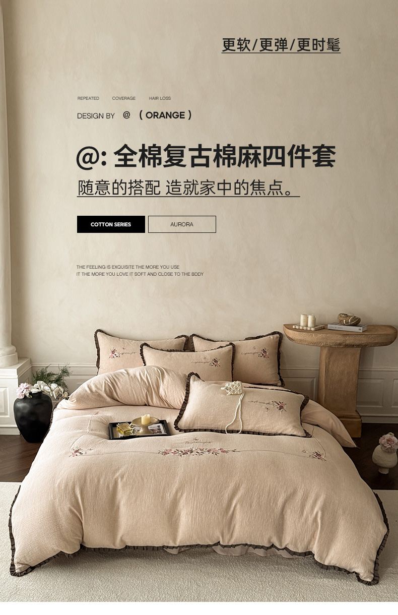(总)艾唯希家纺 2025新款全棉复古棉麻工艺四件套纯棉-晚风玫瑰系列,晚风玫瑰-淡粉,晚风玫瑰-原麻色