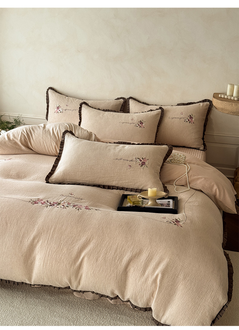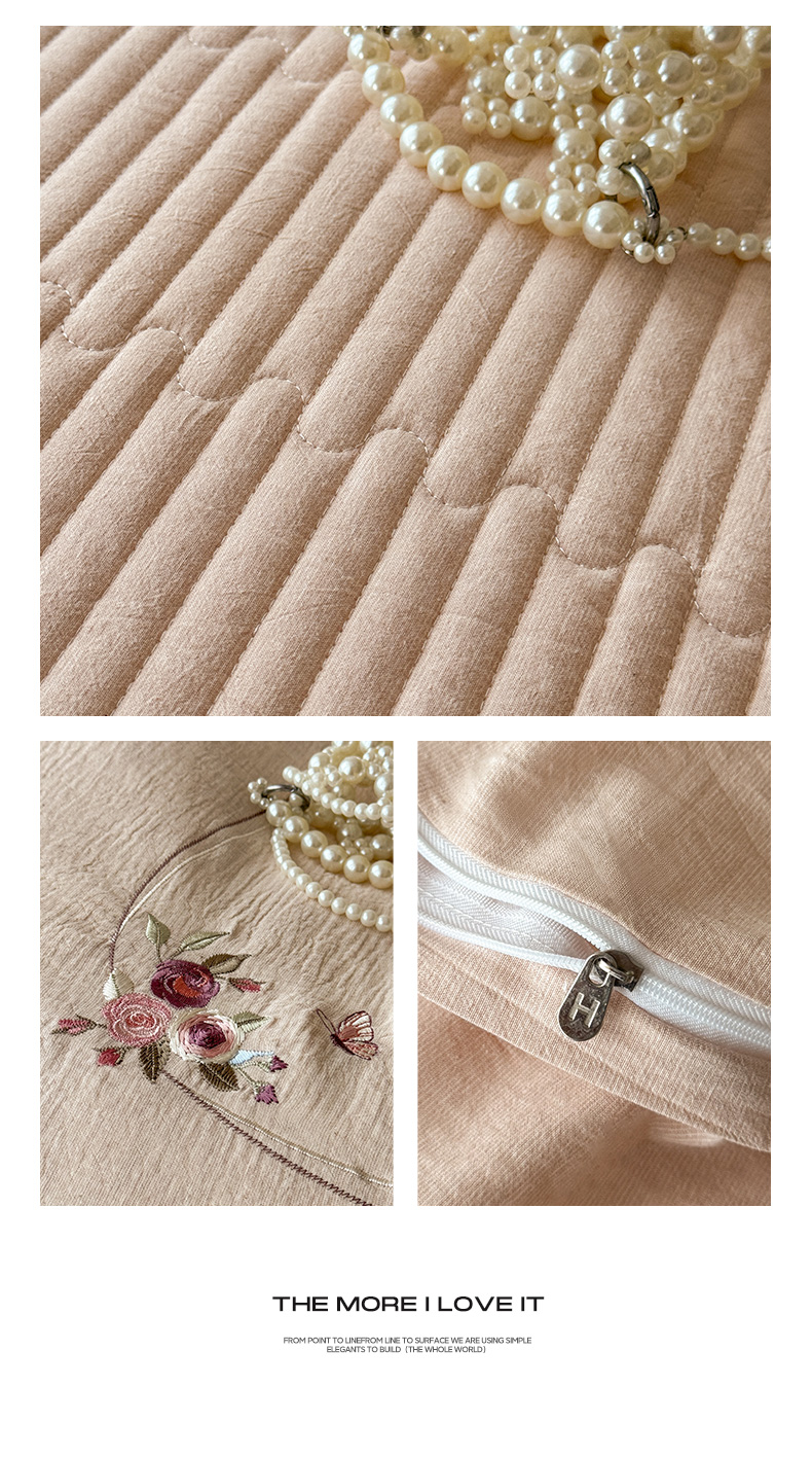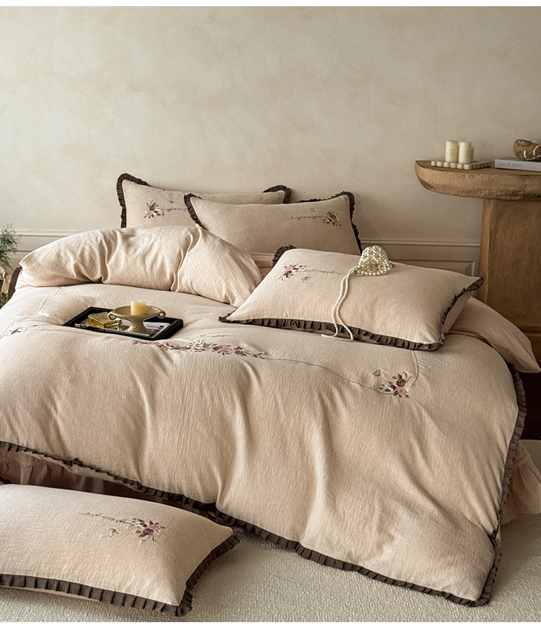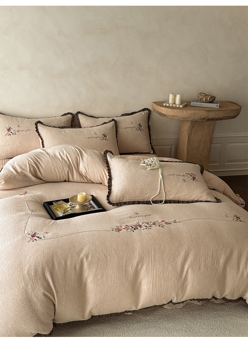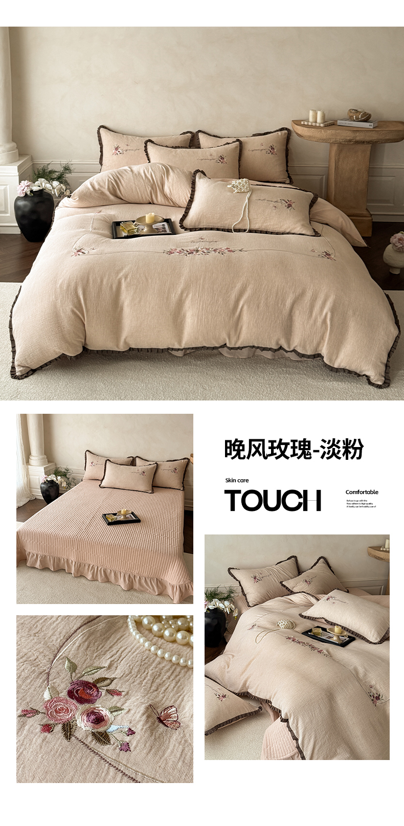 艾唯希家纺 2025新款全棉复古棉麻工艺四件套纯棉-晚风玫瑰系列 晚风玫瑰-淡粉