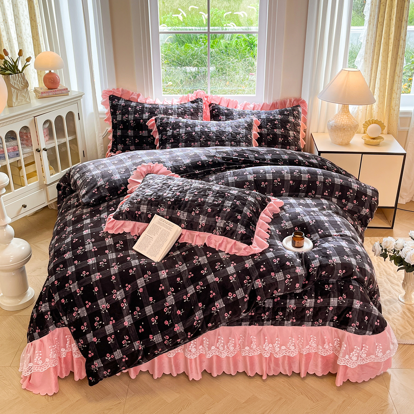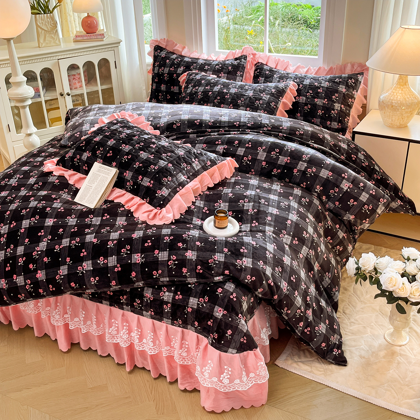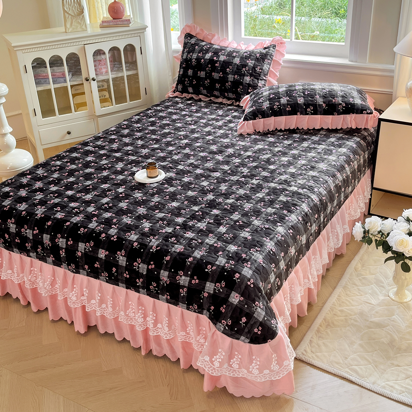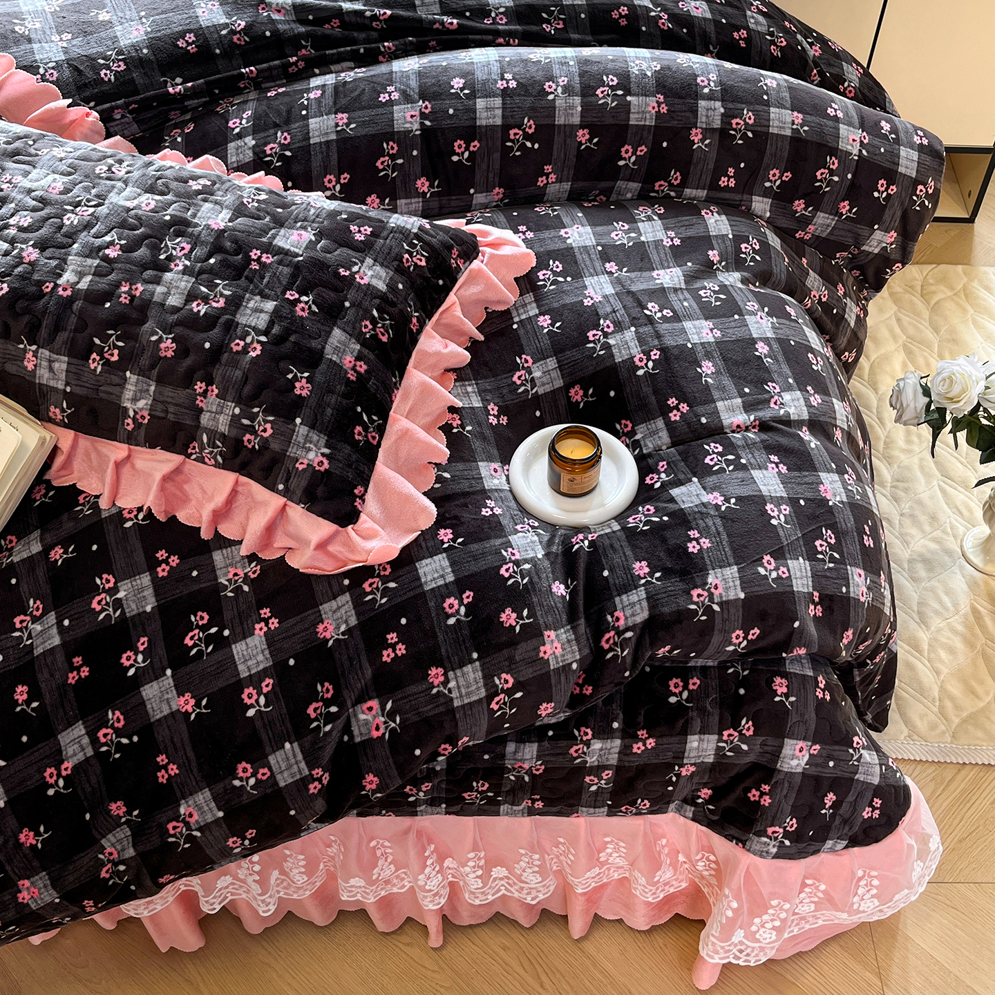 当前位置: 91家纺网 > 商品网购 > 床品套件 > 四件套 > 牛奶绒四件套 > 提花大世界 2025新款爆款高克重牛奶绒印花夹棉蕾丝花边床盖床三件四件套 黑茉香