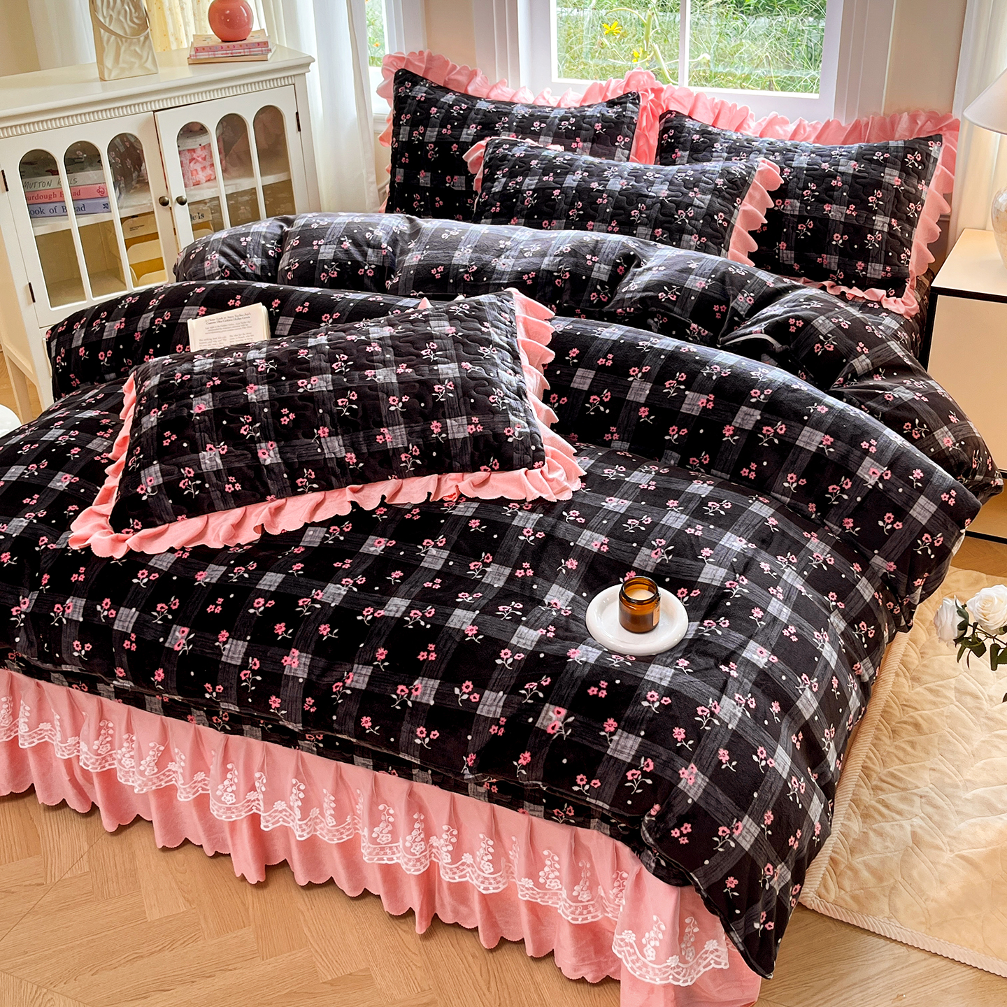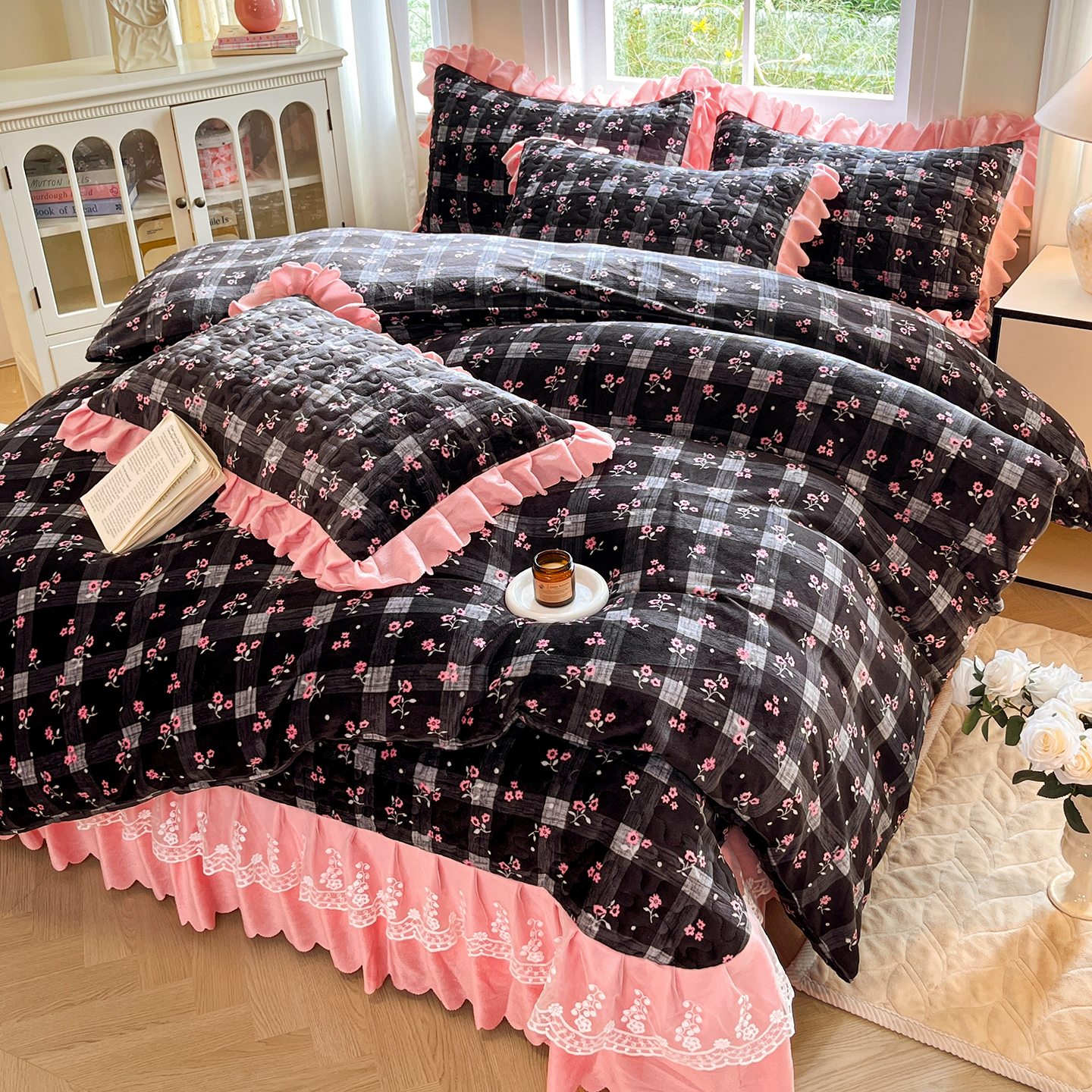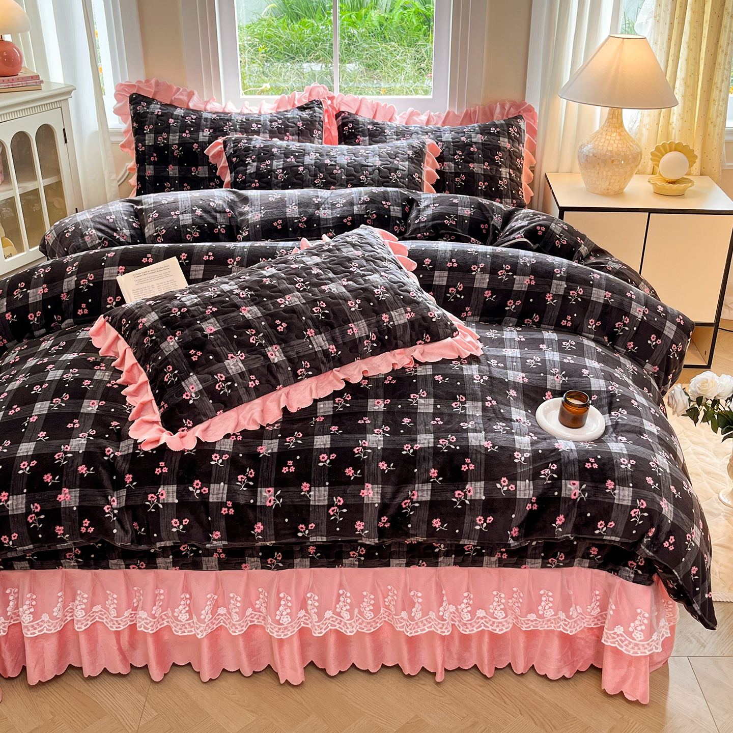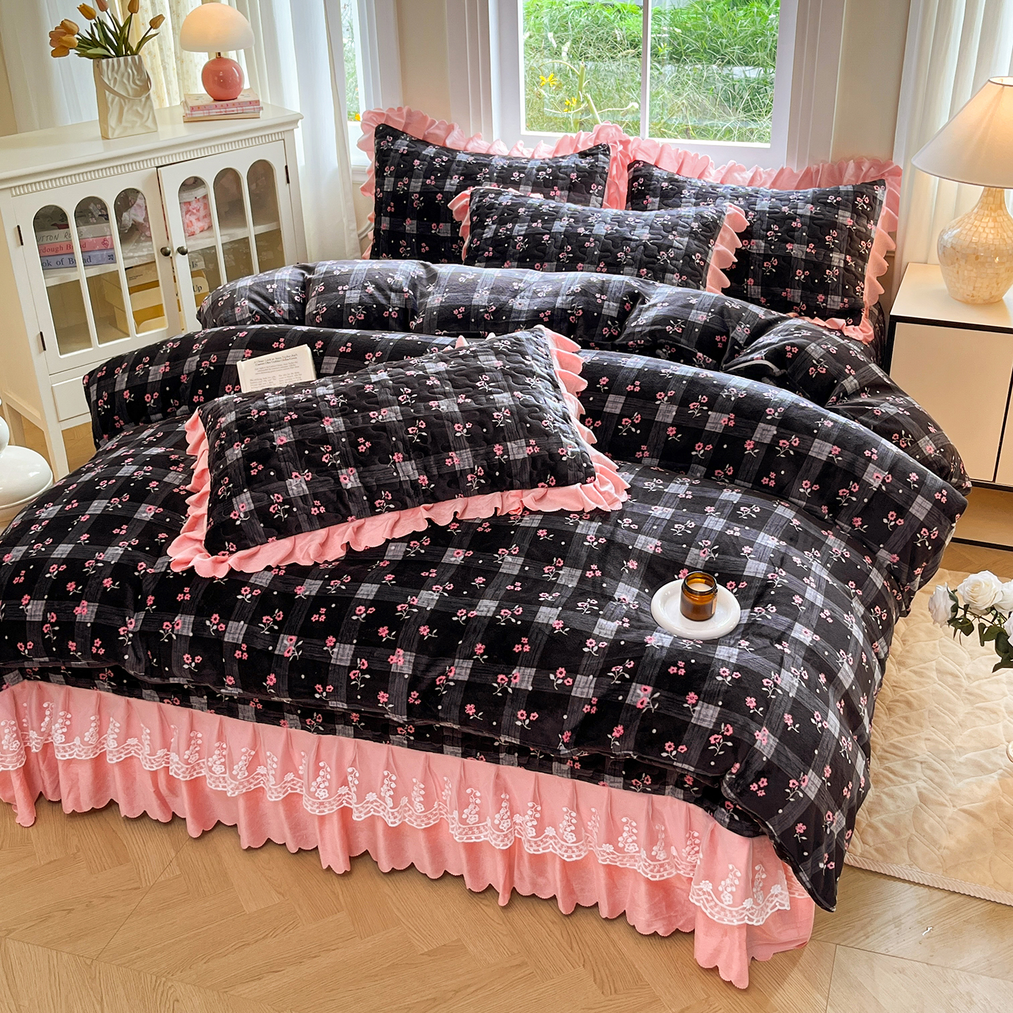 当前位置: 91家纺网 > 商品网购 > 床品套件 > 四件套 > 牛奶绒四件套 > 提花大世界 2025新款爆款高克重牛奶绒印花夹棉蕾丝花边床盖床三件四件套 黑茉香