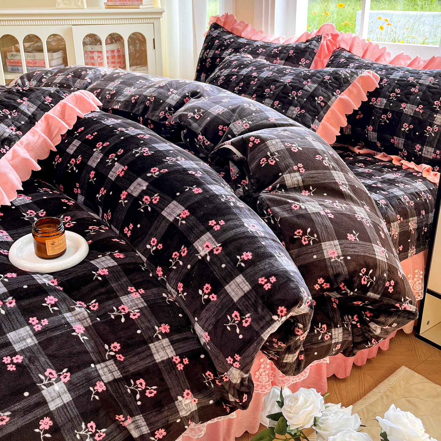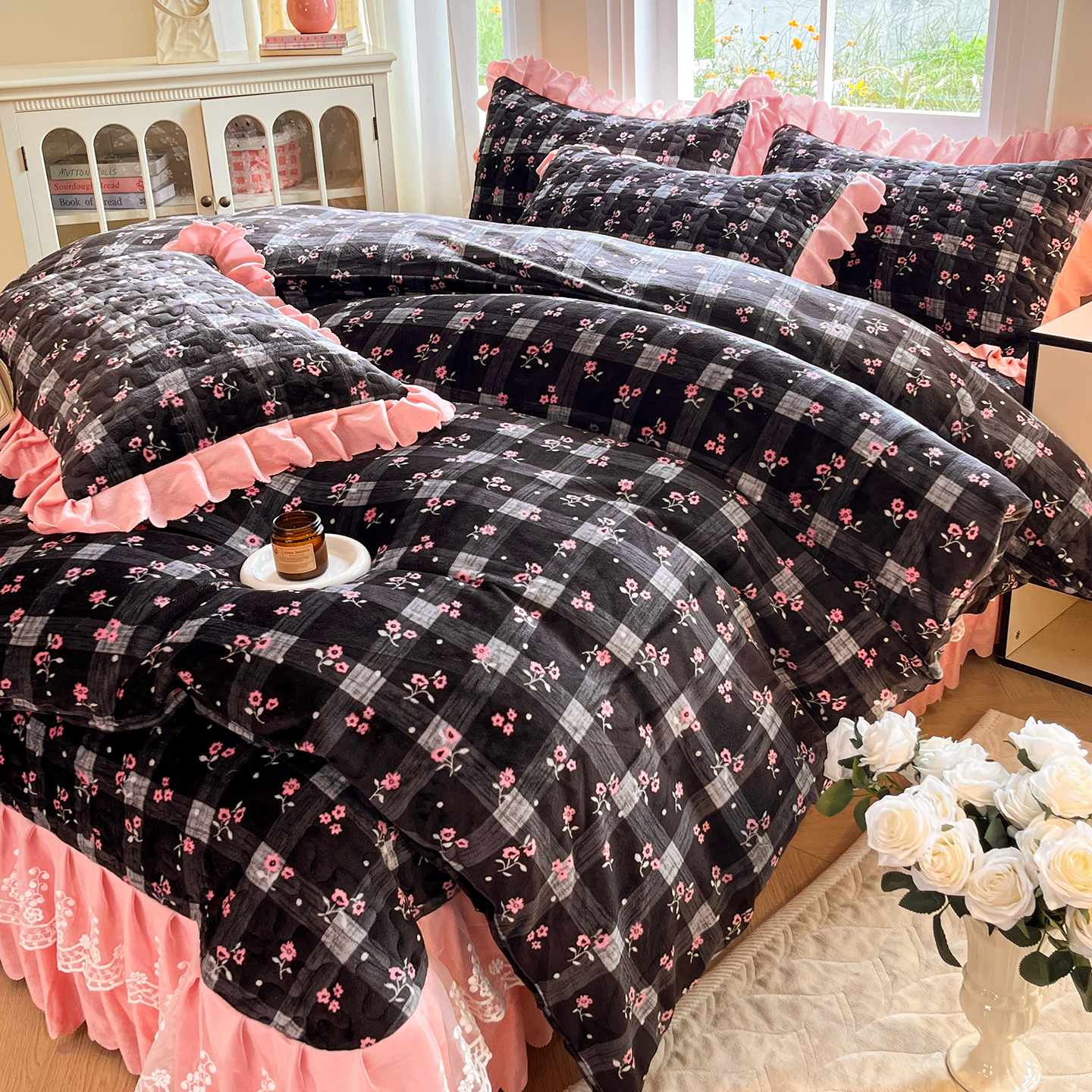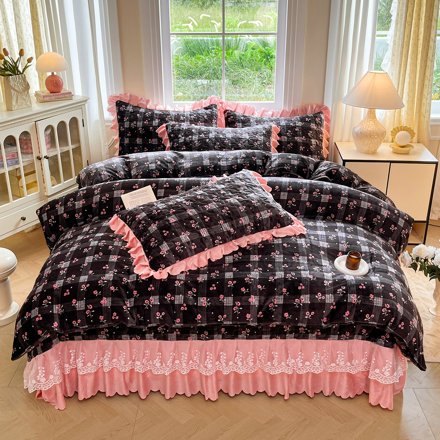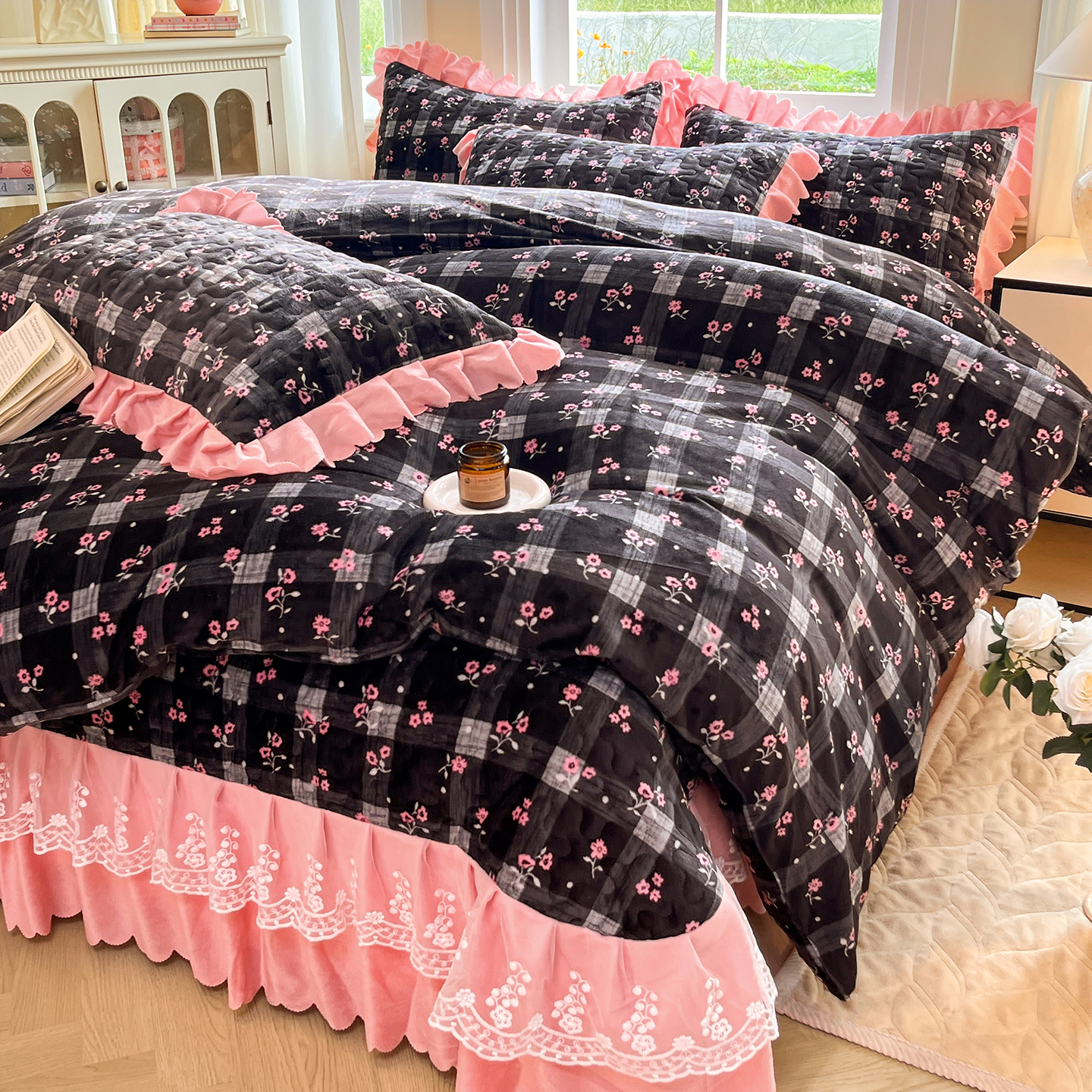 当前位置: 91家纺网 > 商品网购 > 床品套件 > 四件套 > 牛奶绒四件套 > 提花大世界 2025新款爆款高克重牛奶绒印花夹棉蕾丝花边床盖床三件四件套 黑茉香