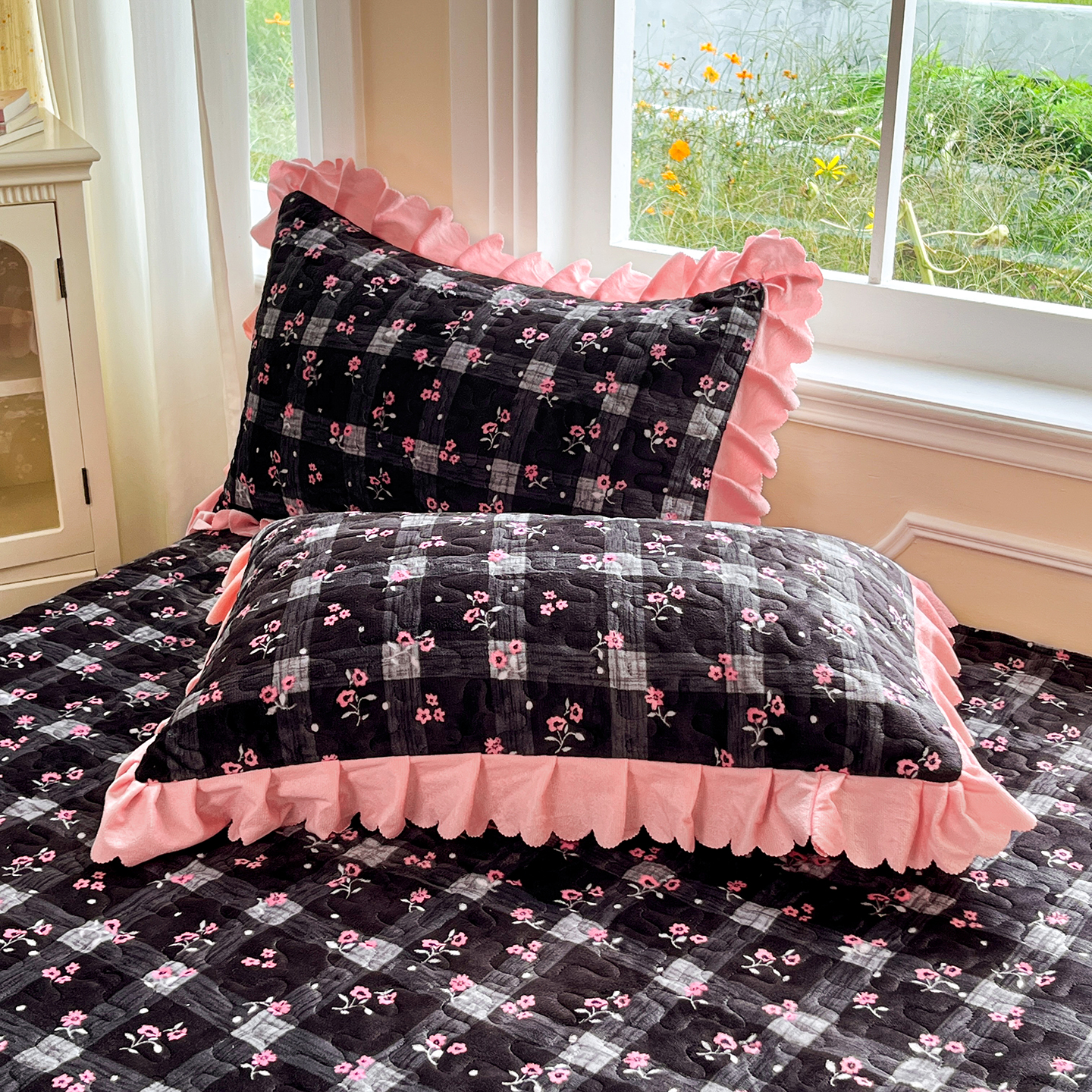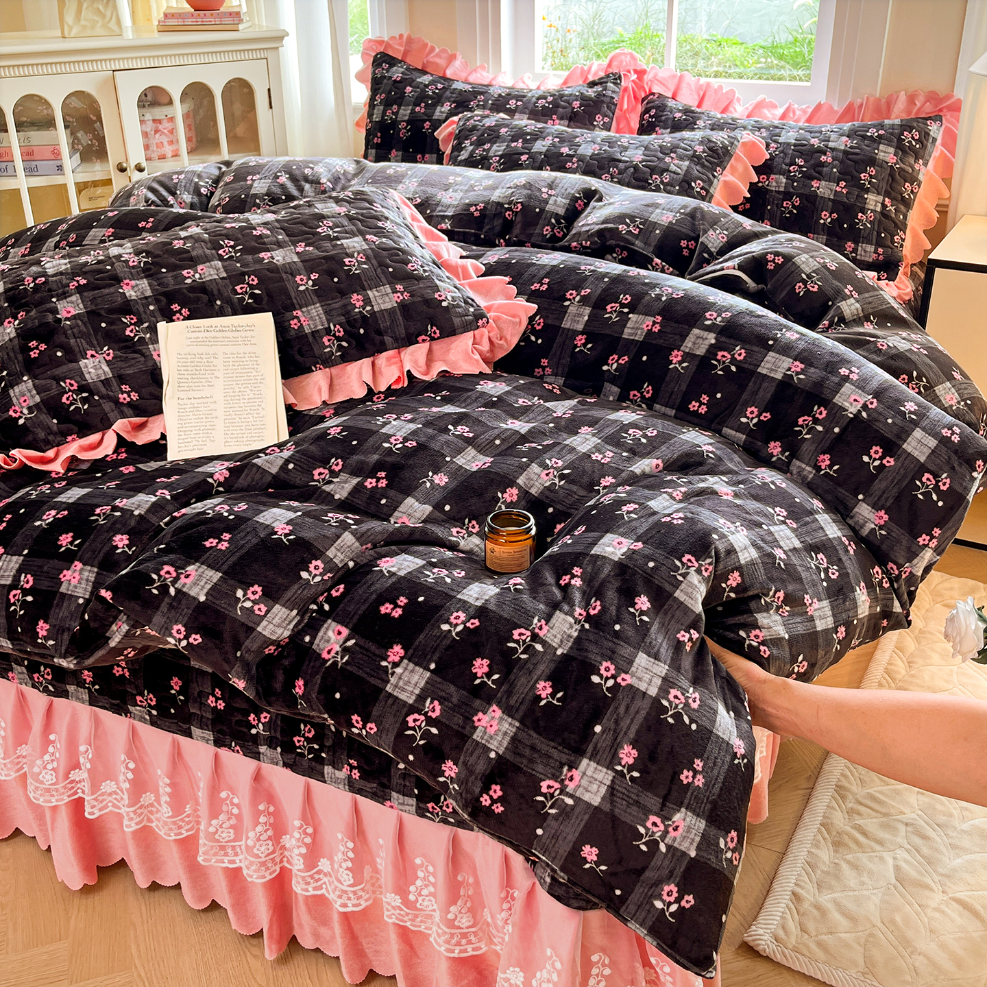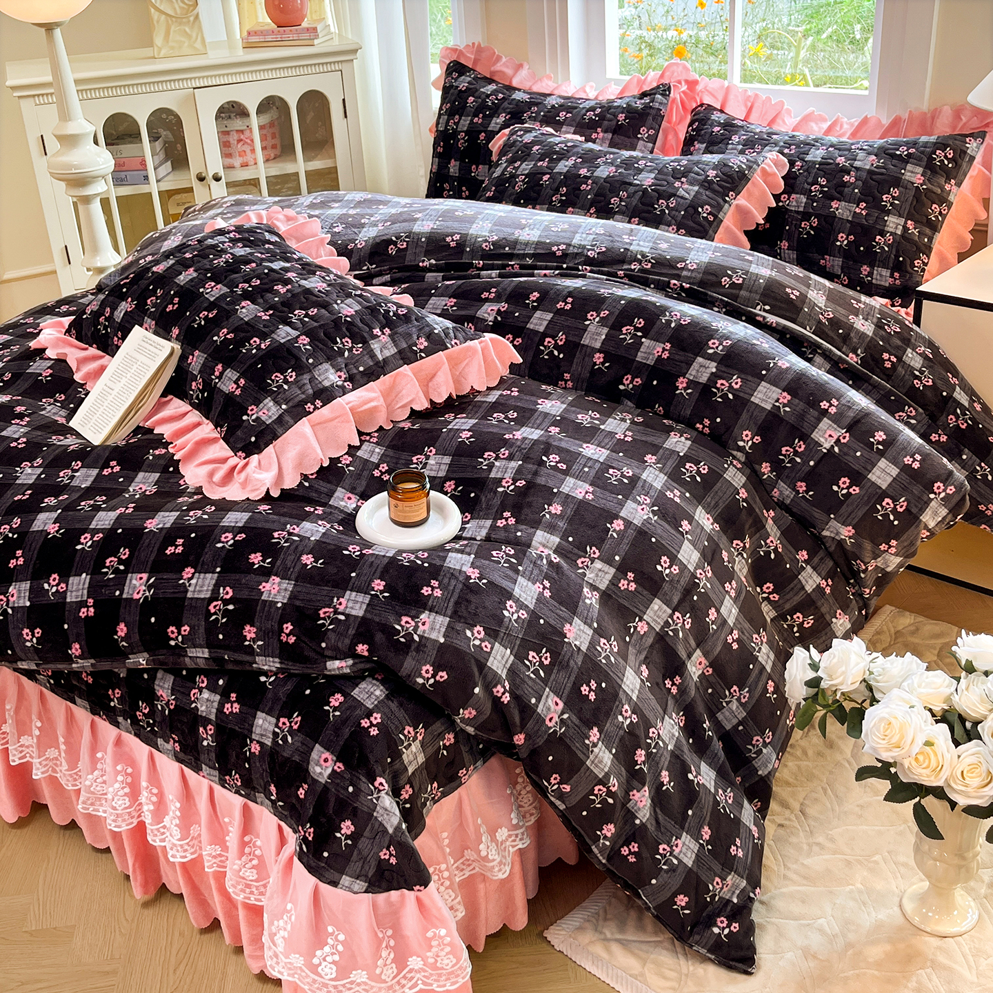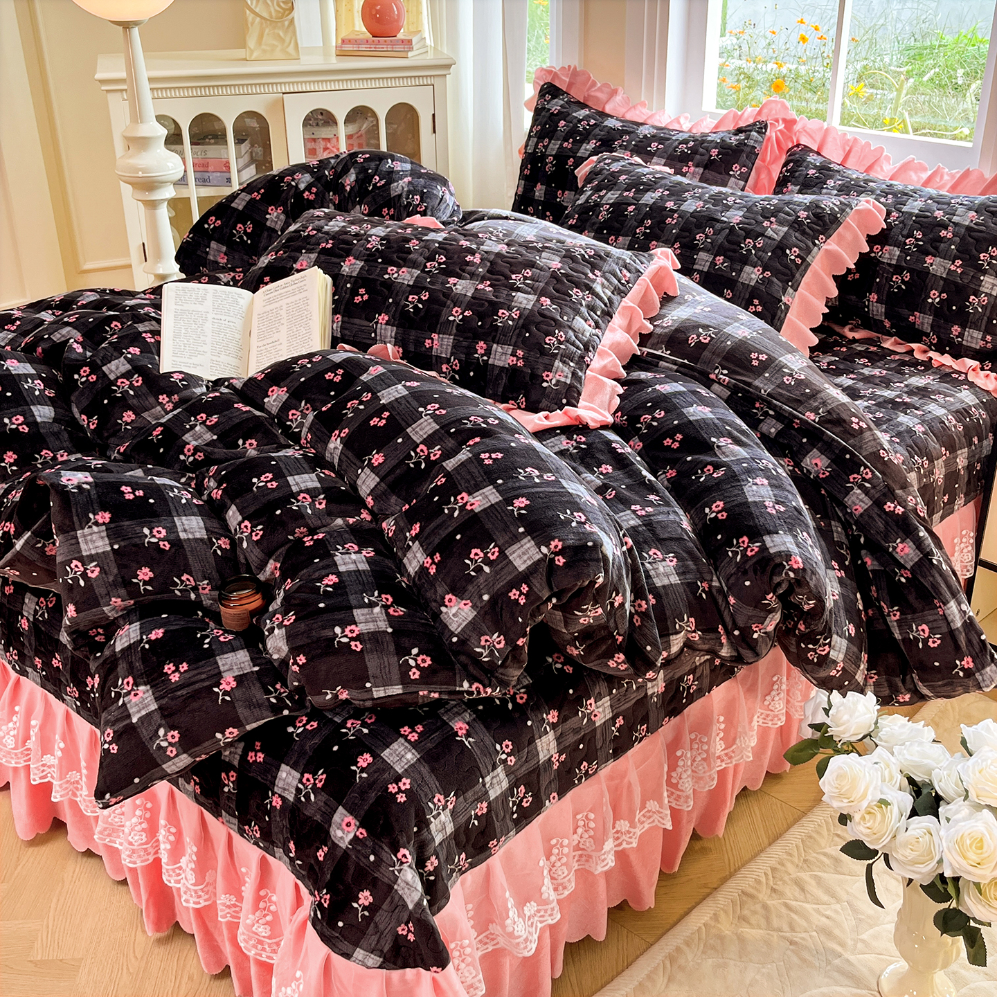 当前位置: 91家纺网 > 商品网购 > 床品套件 > 四件套 > 牛奶绒四件套 > 提花大世界 2025新款爆款高克重牛奶绒印花夹棉蕾丝花边床盖床三件四件套 黑茉香