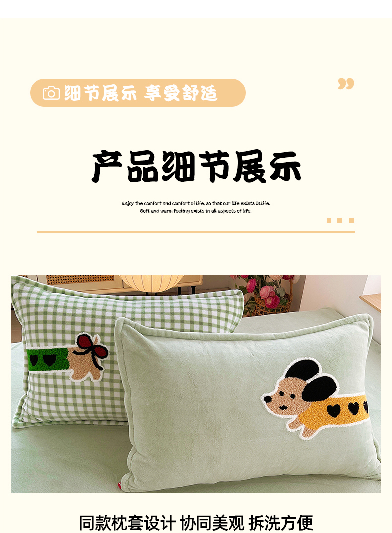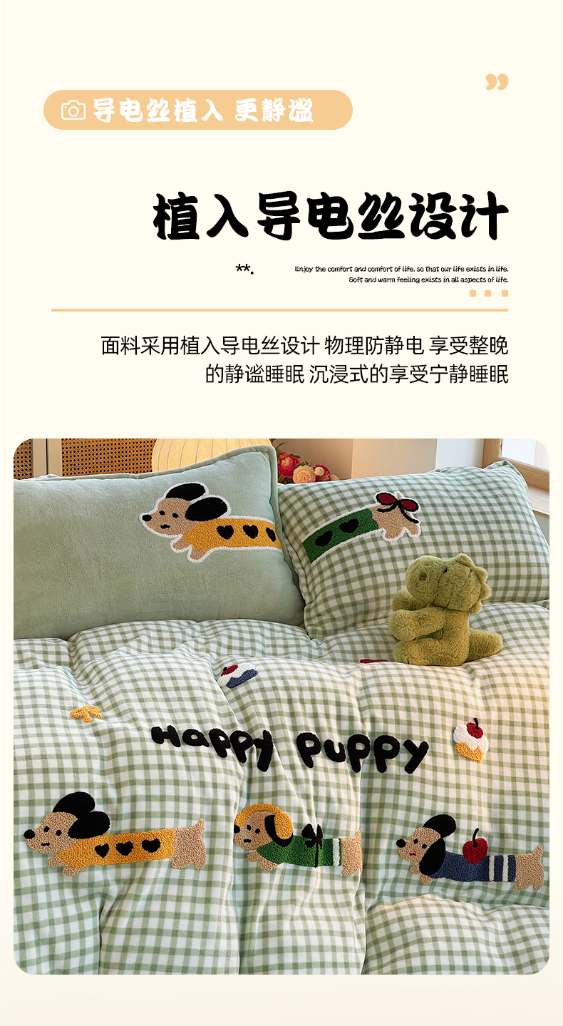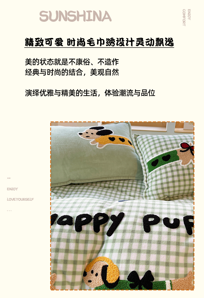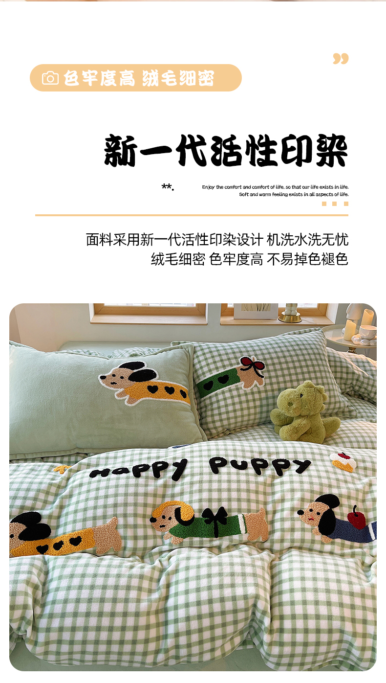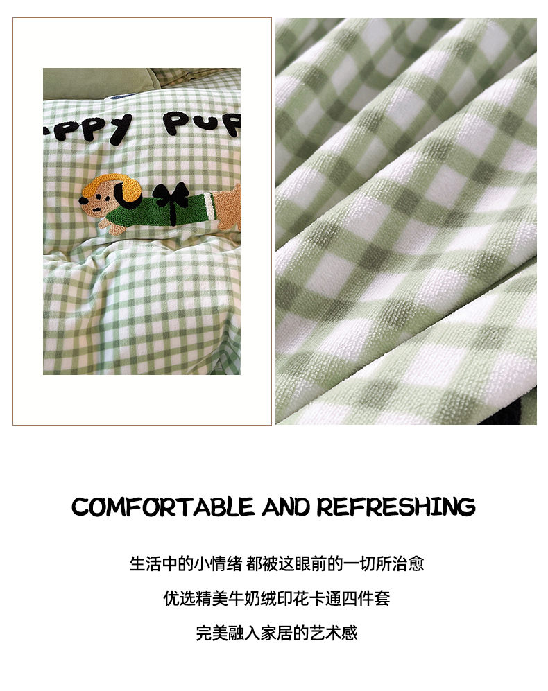 商品名称:炫拼家纺 2025新款高克重牛奶绒格子卡通毛巾绣加厚四件套-糖宝系列 糖宝-汪星日记