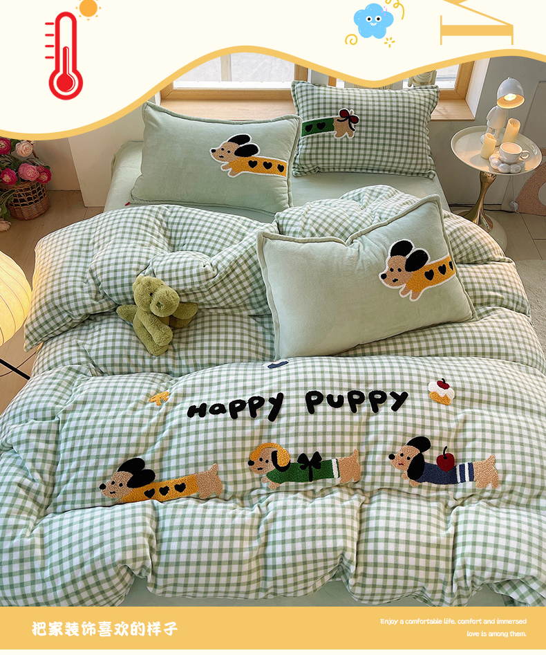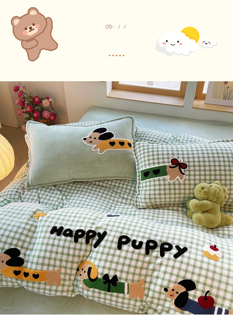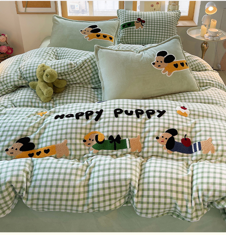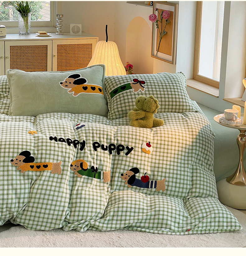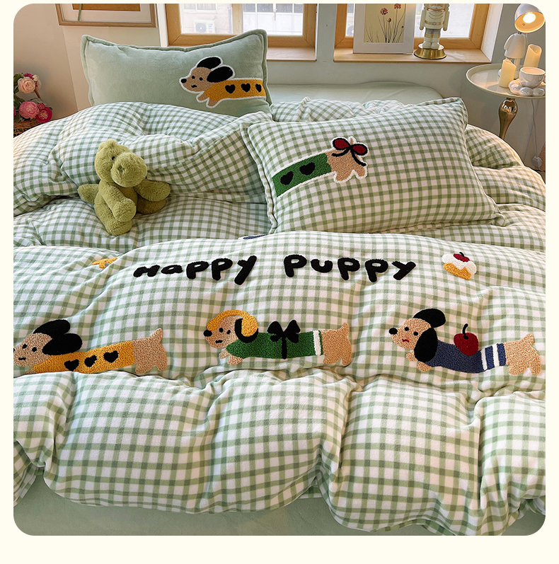 炫拼家纺 2025新款高克重牛奶绒格子卡通毛巾绣加厚四件套-糖宝系列 糖宝-汪星日记