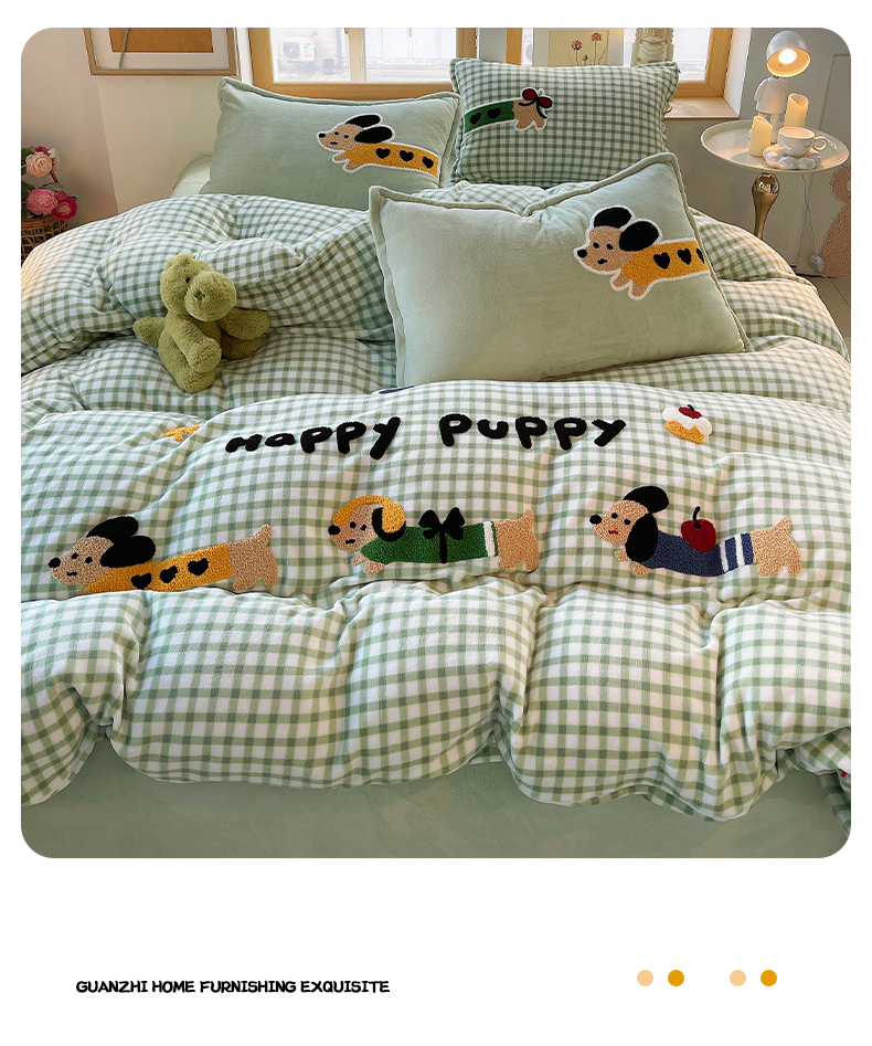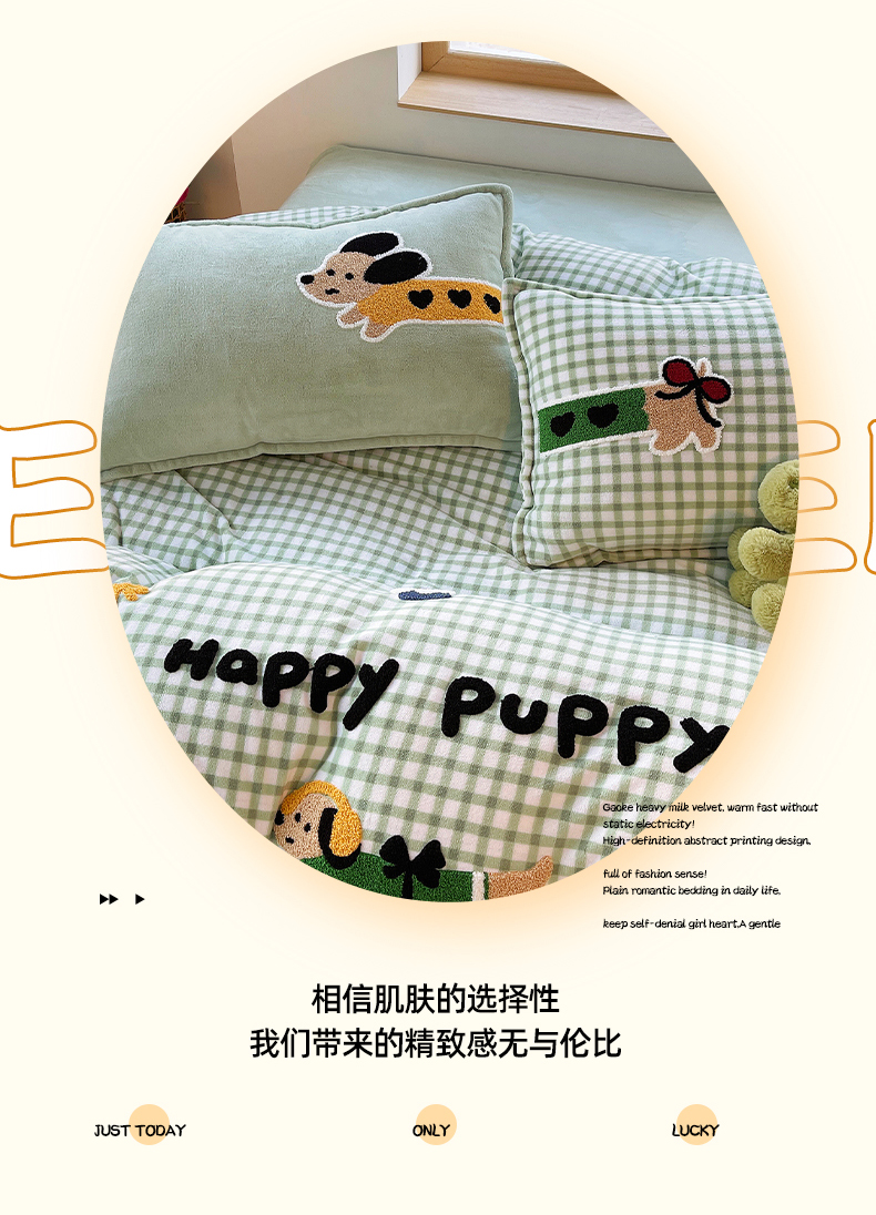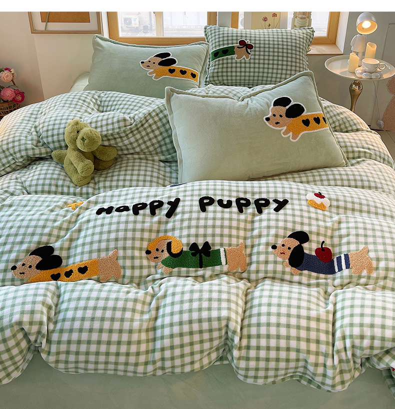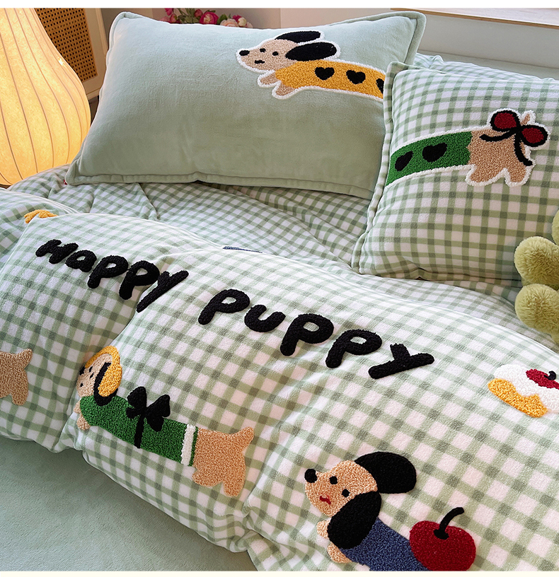 炫拼家纺 2025新款高克重牛奶绒格子卡通毛巾绣加厚四件套-糖宝系列 糖宝-汪星日记