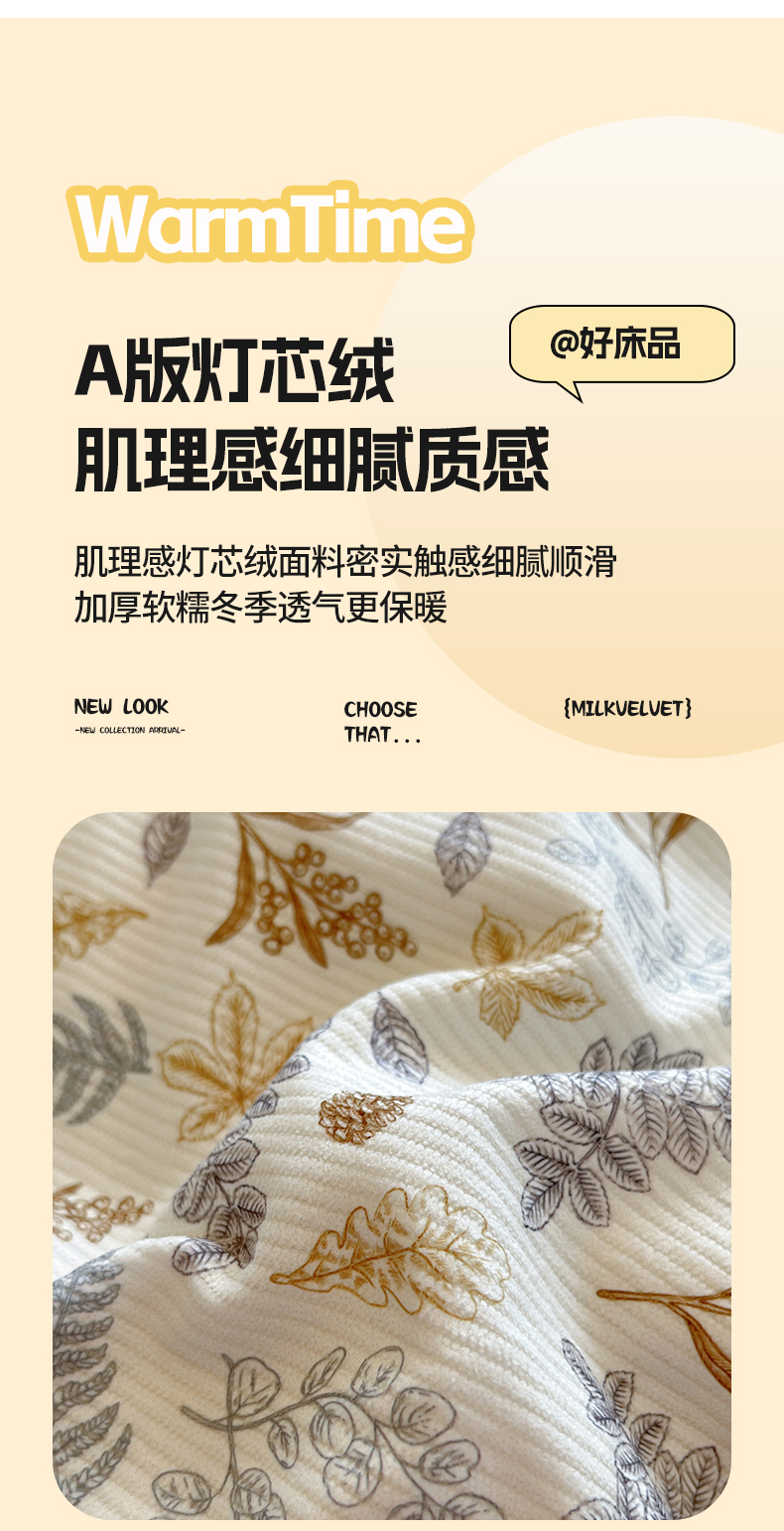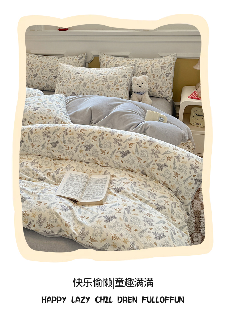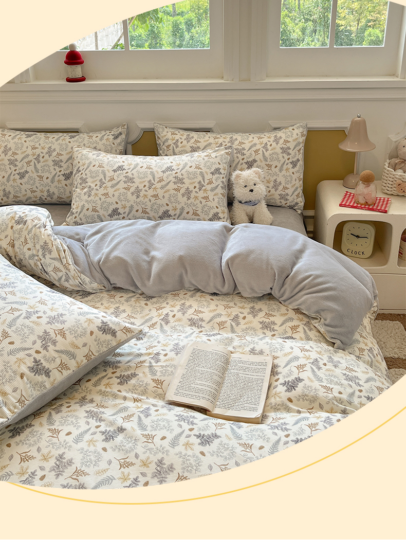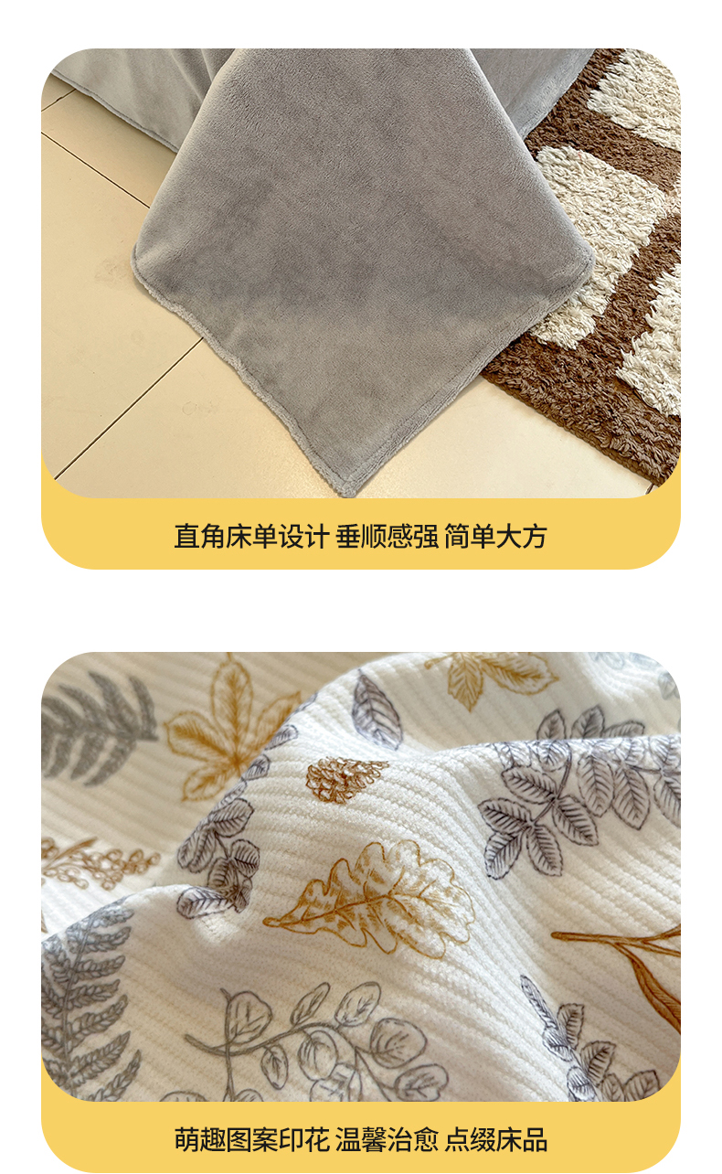 商品名称:羚羊语家纺 2025新款灯芯绒 温暖颂系列-印花牛奶绒四件套高克重简约卡通花卉提花加厚保暖床单床笠三件套(买家秀请联系客服!) 温暖颂-叶知秋
