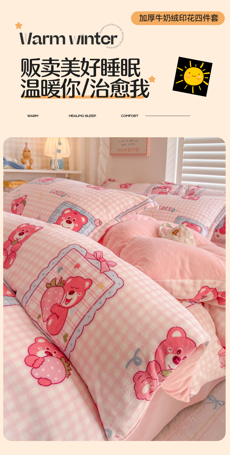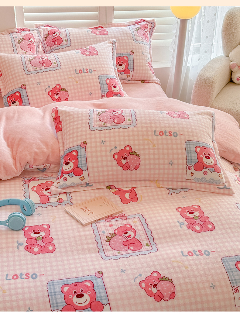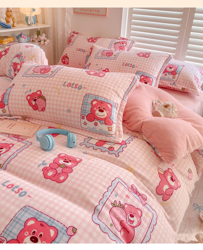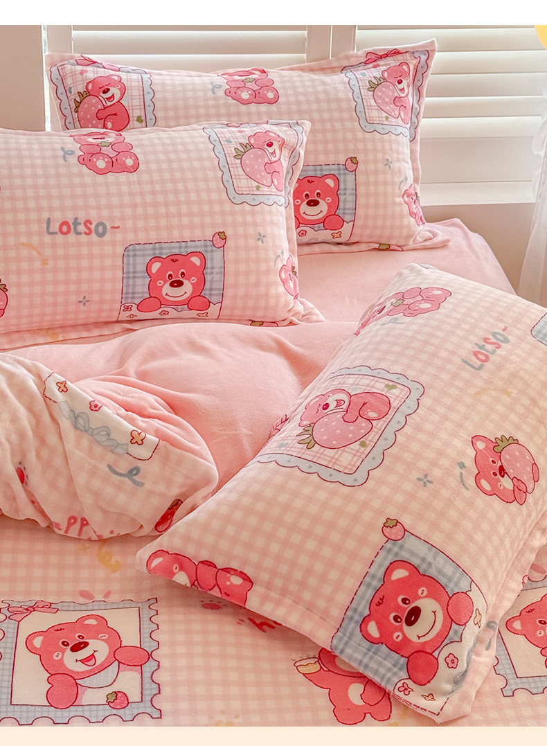 当前位置: 91家纺网 > 商品网购 > 床品套件 > 四件套 > 牛奶绒四件套 > 名兮家居 2025新款卡通时尚风高克重印花牛奶绒四件套 甜蜜熊仔