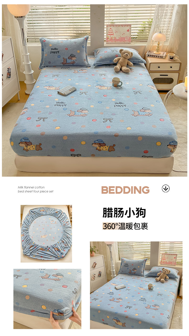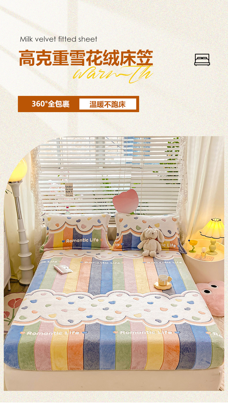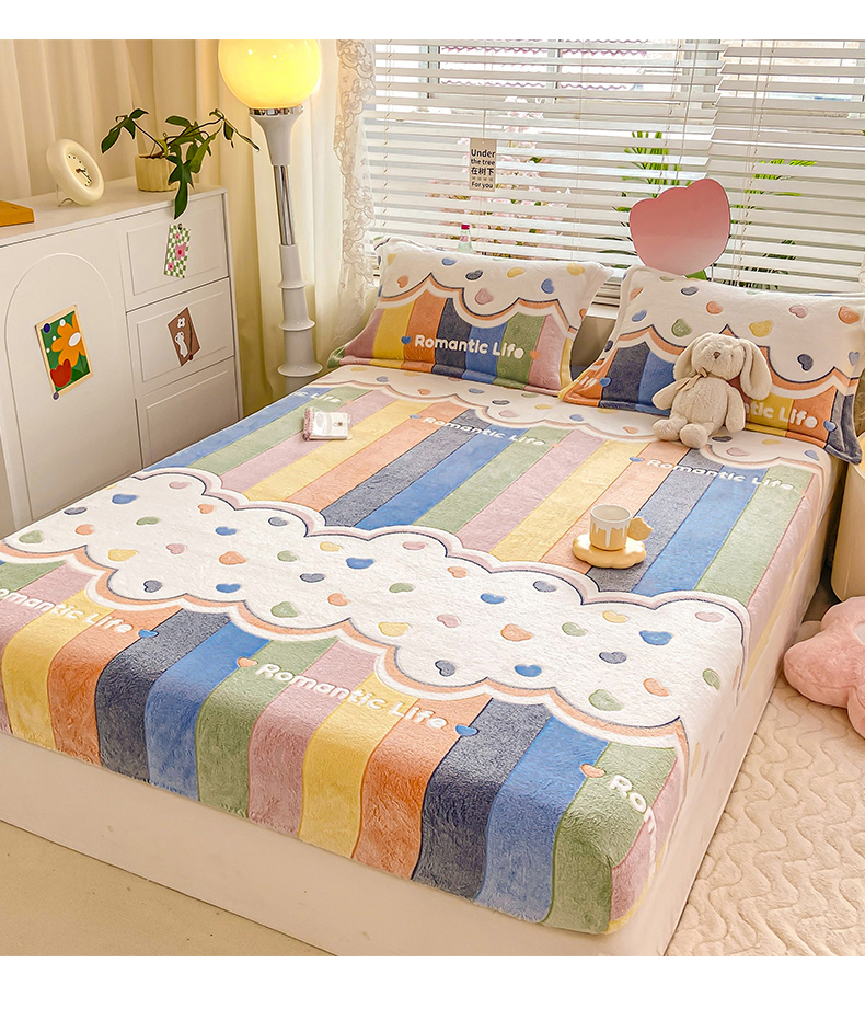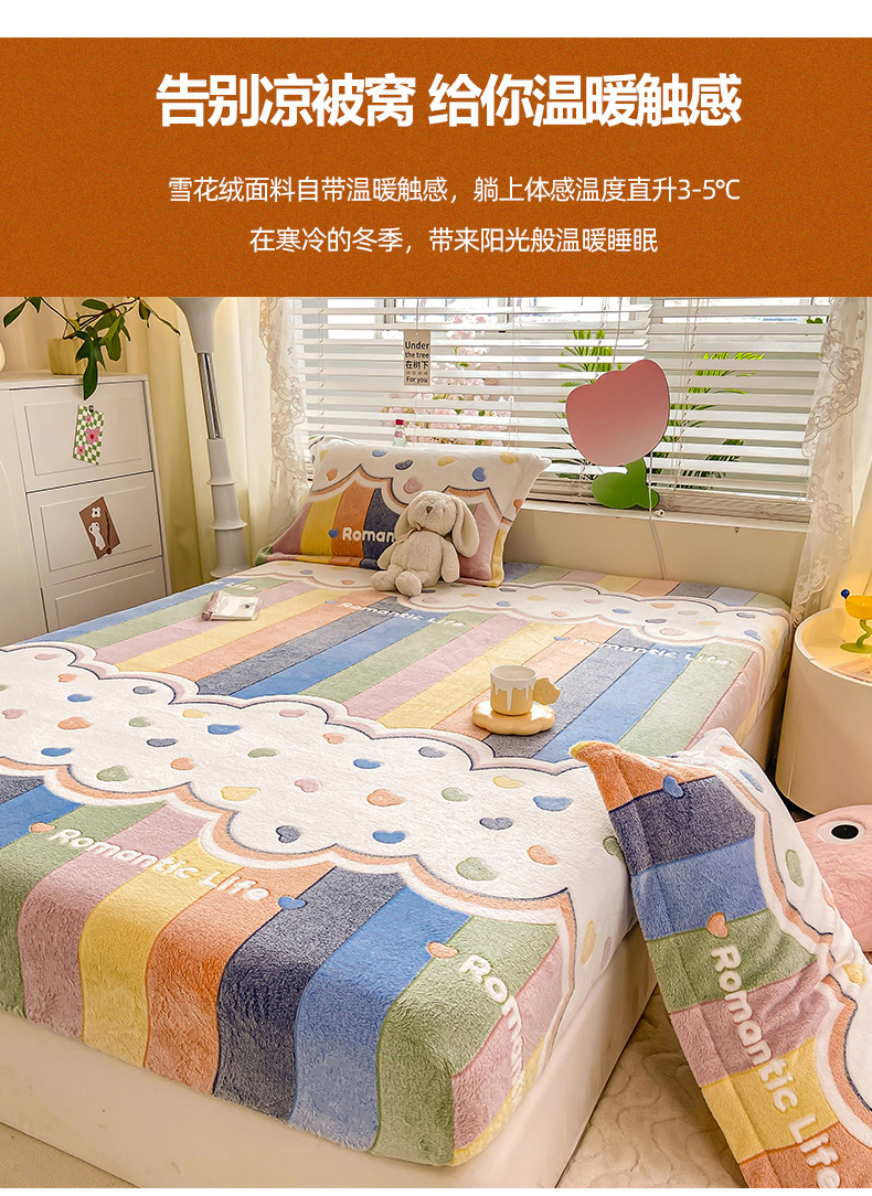(总)热卖爆款·雪花绒卡通床笠牛奶绒保暖床垫保护套绒枕套外贸跨境直播电商,彩虹,开心南瓜,腊肠小狗,罗马,花园兔,花海,小恐龙,星星熊,涂鸦小狗,繁花,嗨皮狗,草莓熊,彩色毛球,动物世界,蓝爱心