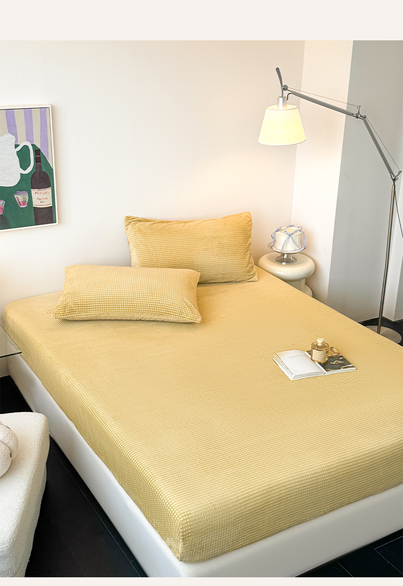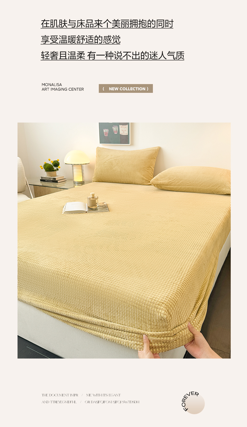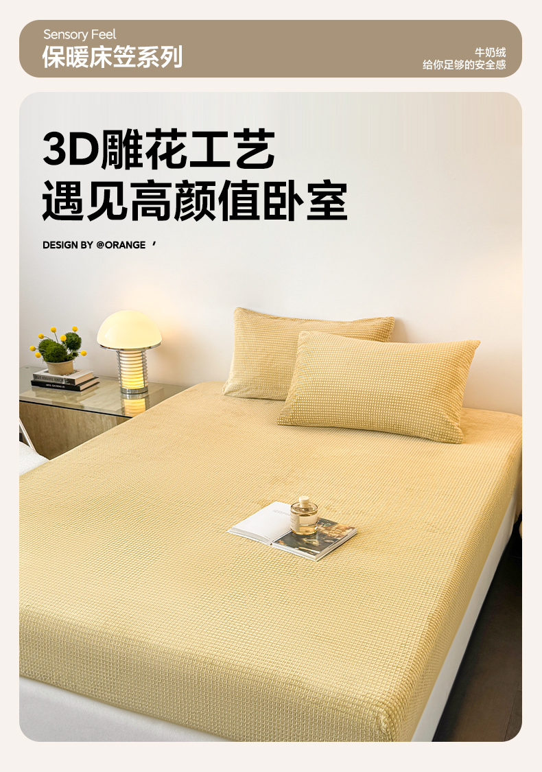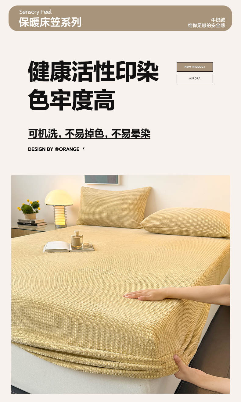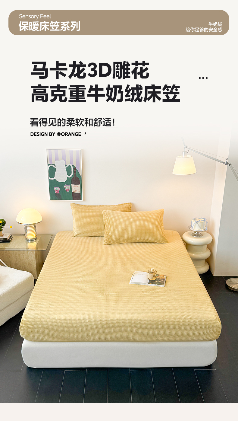 如一 2025新款全消光230克烂花牛奶绒马卡龙系列床笠枕套三件套 马卡龙-咖黄