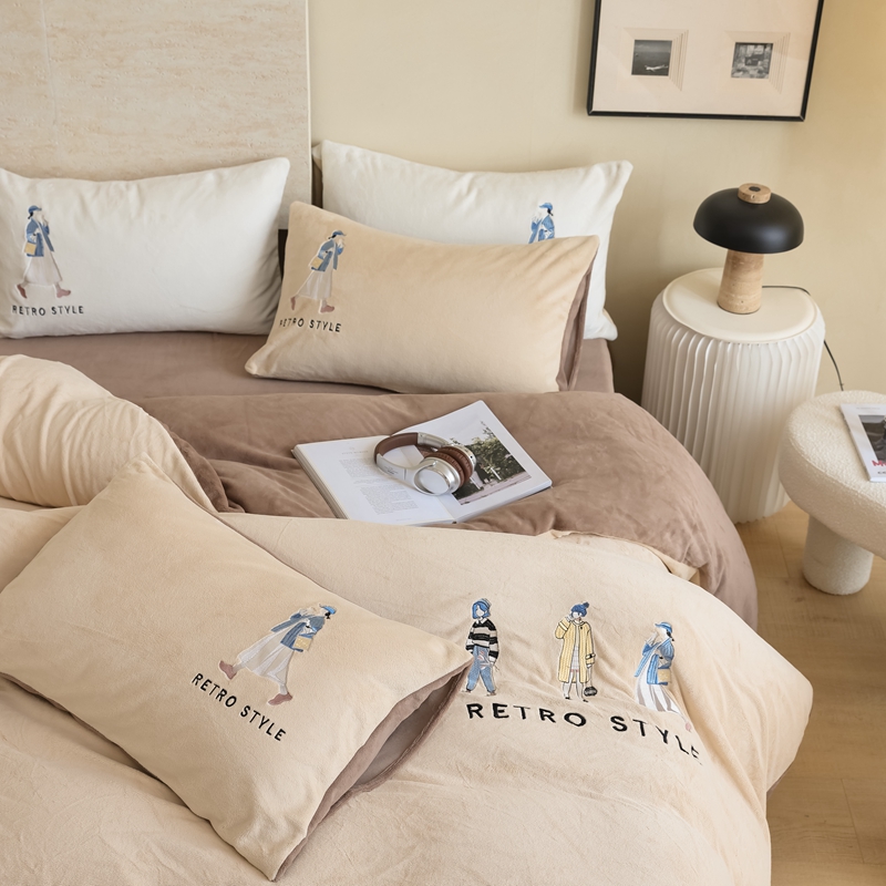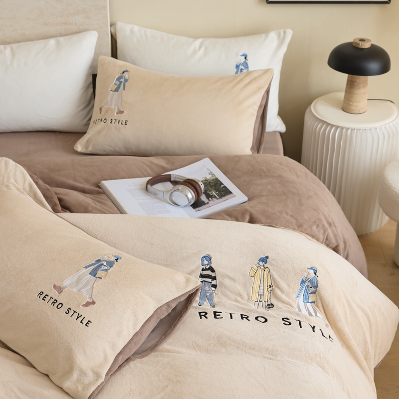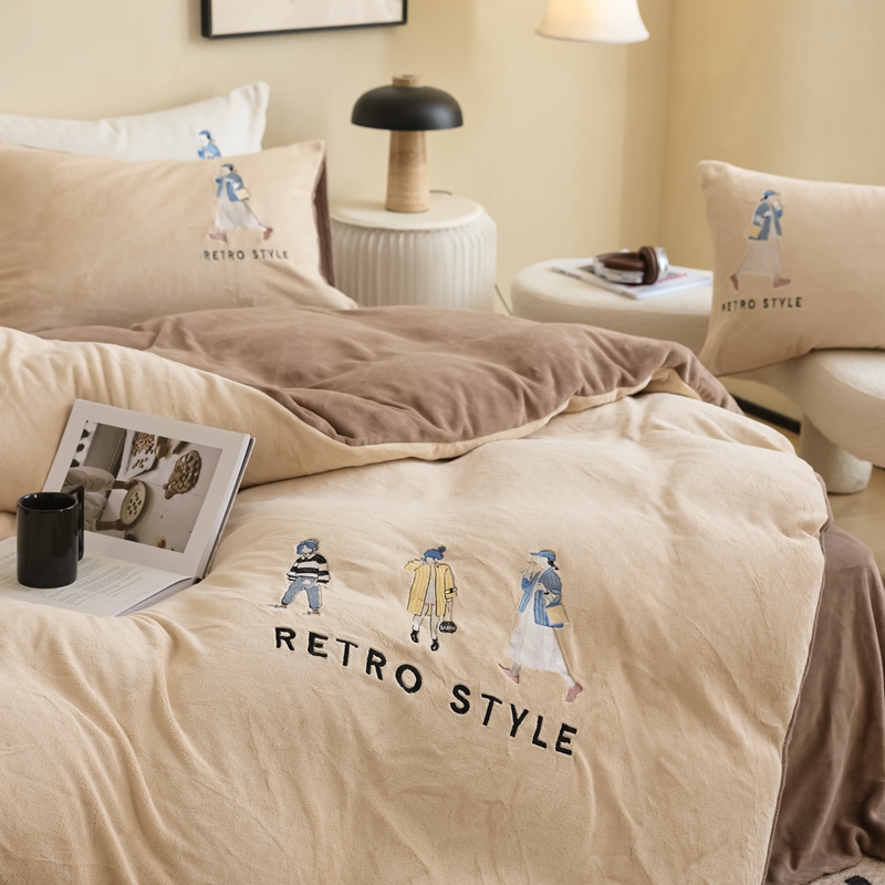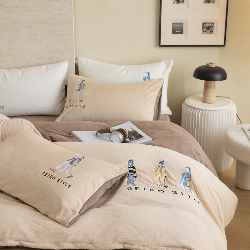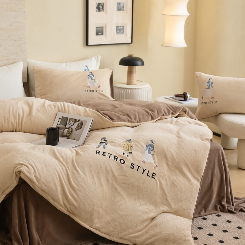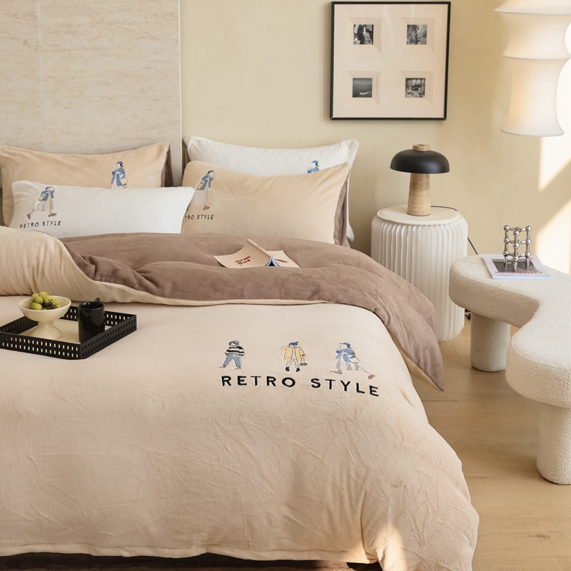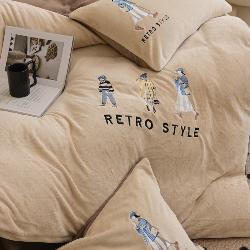 商品名称:121【牛奶绒刺绣四件套】2025新款毛毯被子四件套单件床单被套床笠珊瑚绒牛奶绒冬被法兰绒兔毛绒刺绣男孩-Boy系列场景二 baby-棕咖