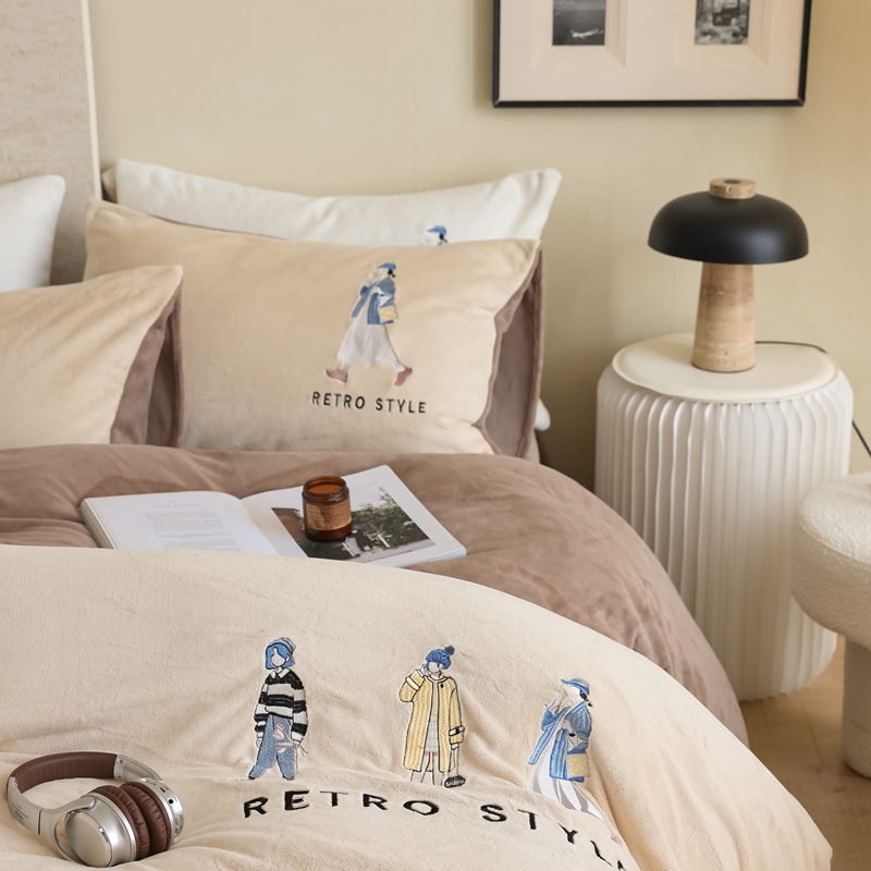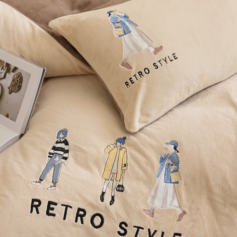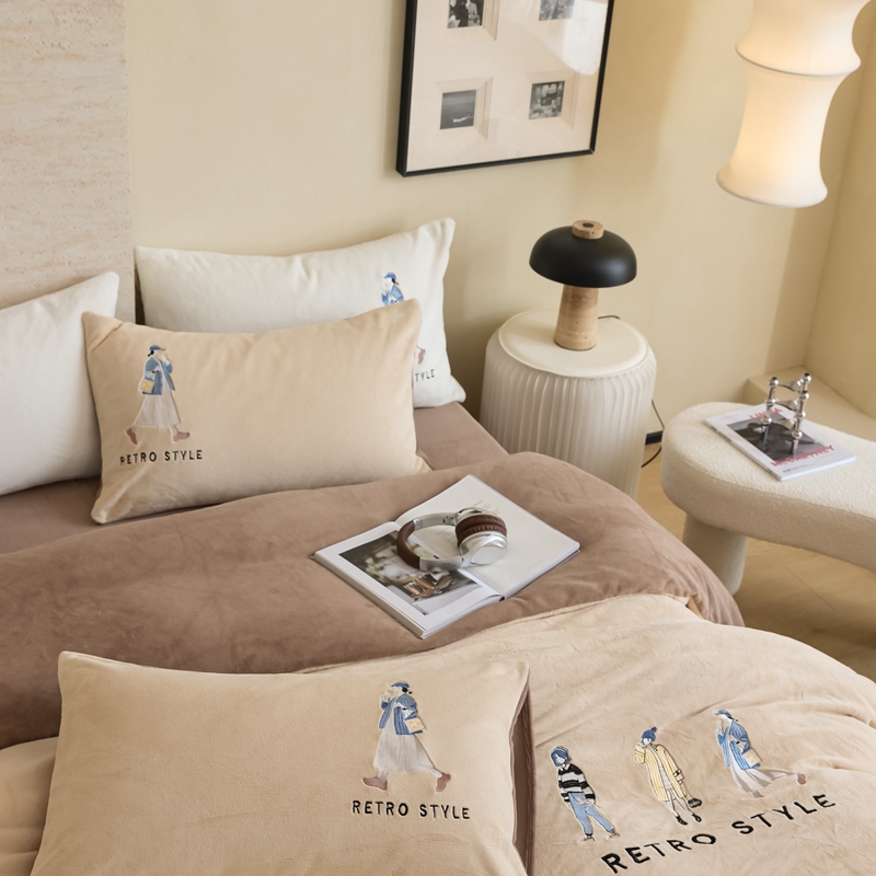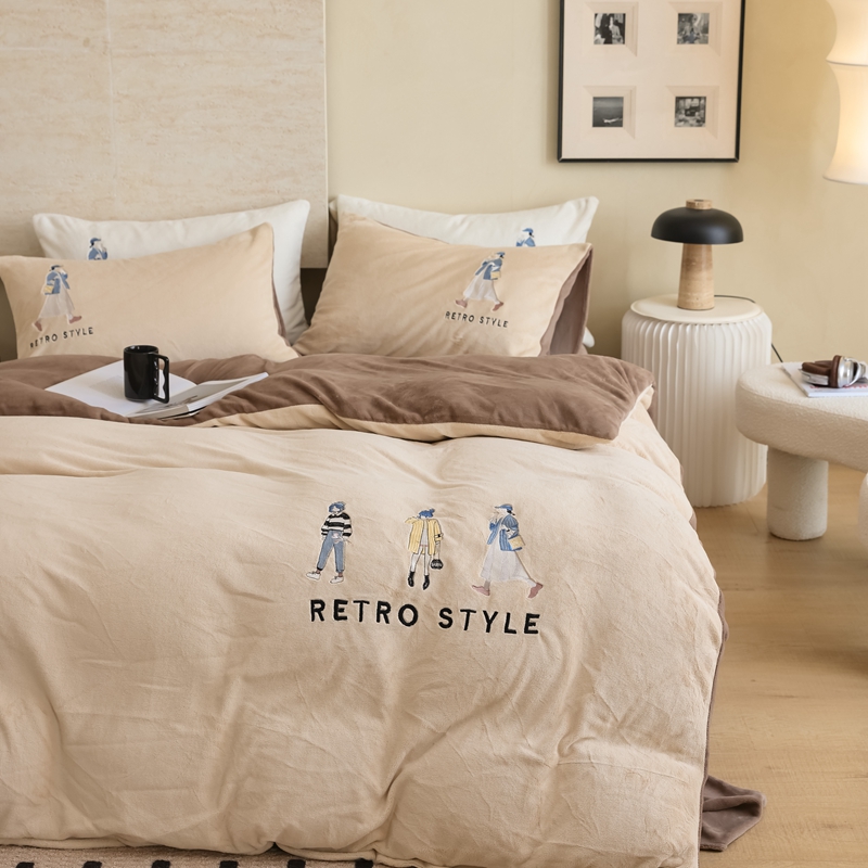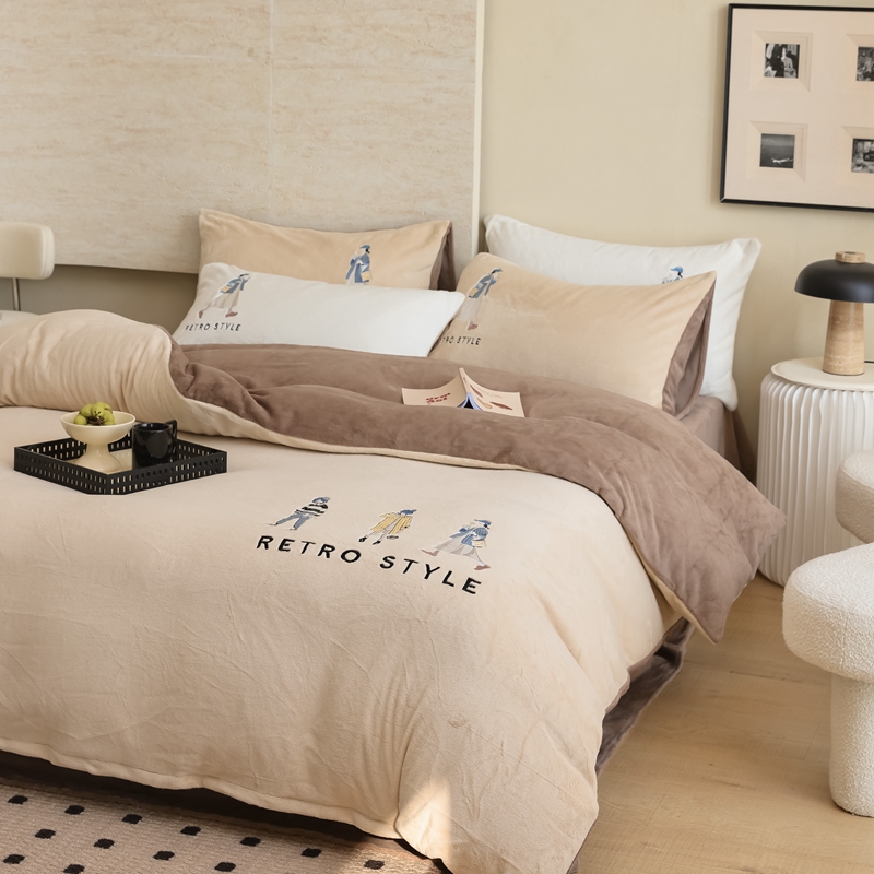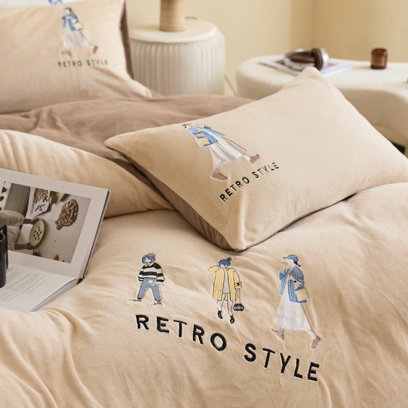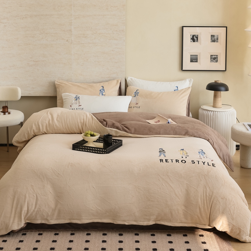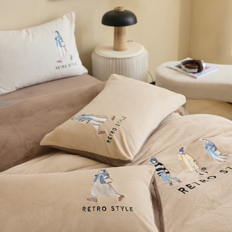 商品名称:121【牛奶绒刺绣四件套】2025新款毛毯被子四件套单件床单被套床笠珊瑚绒牛奶绒冬被法兰绒兔毛绒刺绣男孩-Boy系列场景二 baby-棕咖