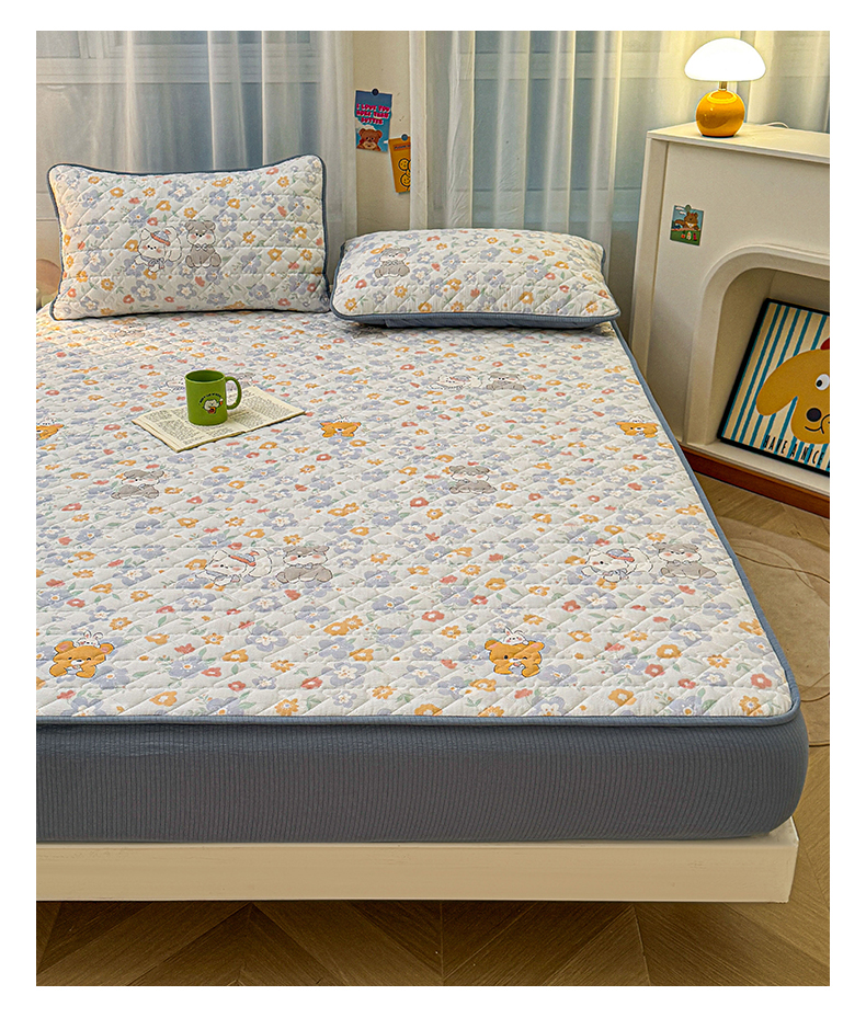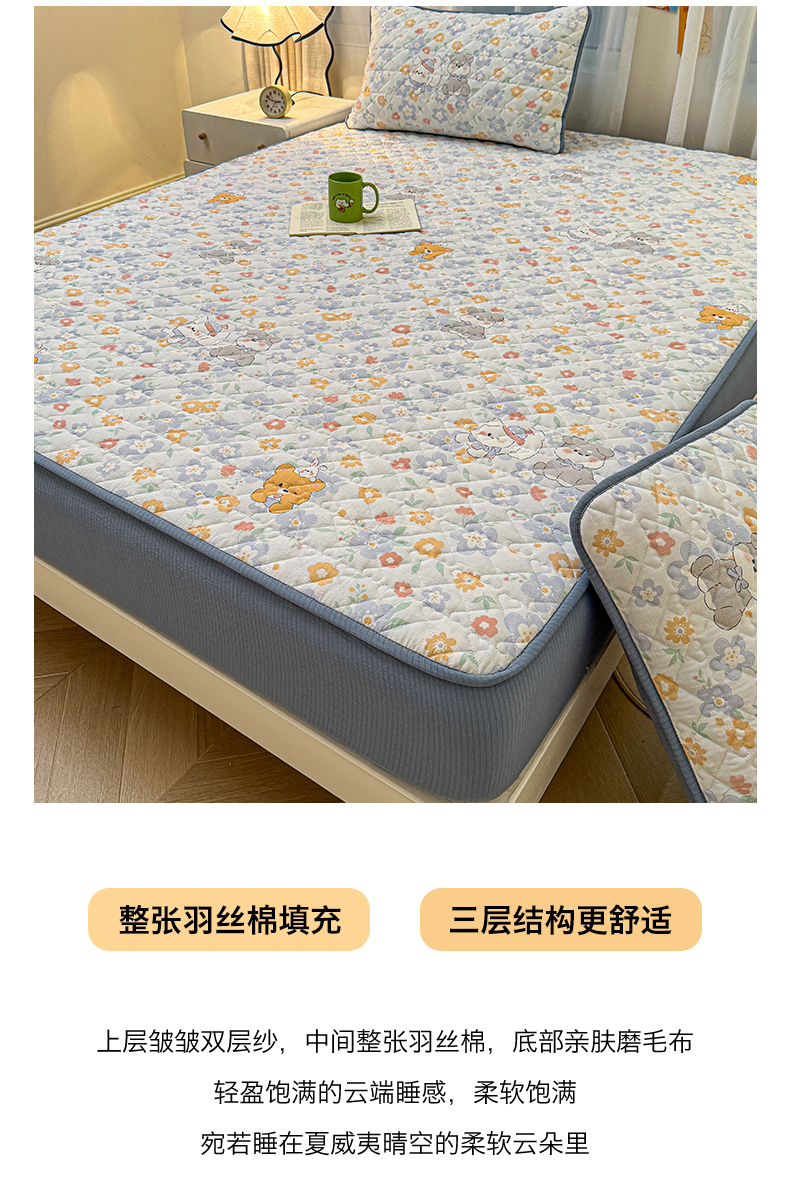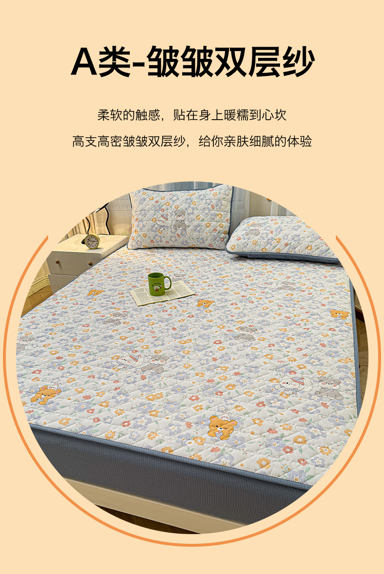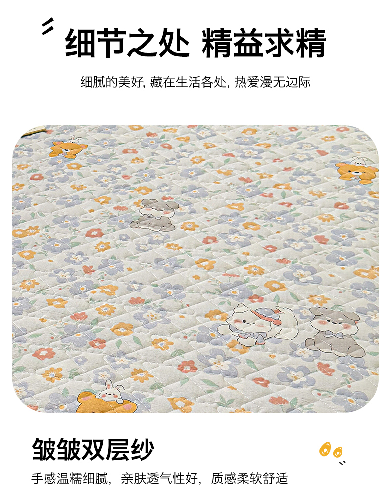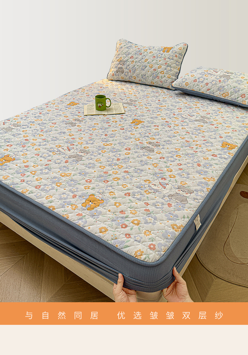 (总)雯豆家纺 2025新款复古风皱皱棉印花夹棉床笠三件套加厚床垫保护套,小南瓜,春日小狗,初夏,浪漫花语,爱尔蓝,初心,蝴蝶结小猫,花小愈,可爱TK,快乐萌宝,快乐时光,毛球团团,蘑菇仙子,奶萌小狗,小苍兰