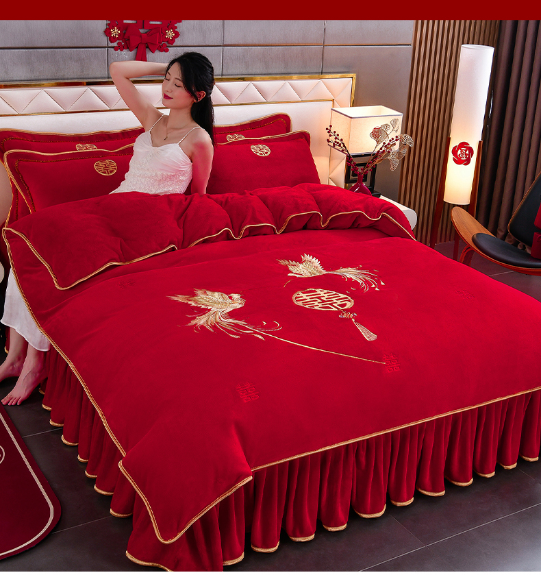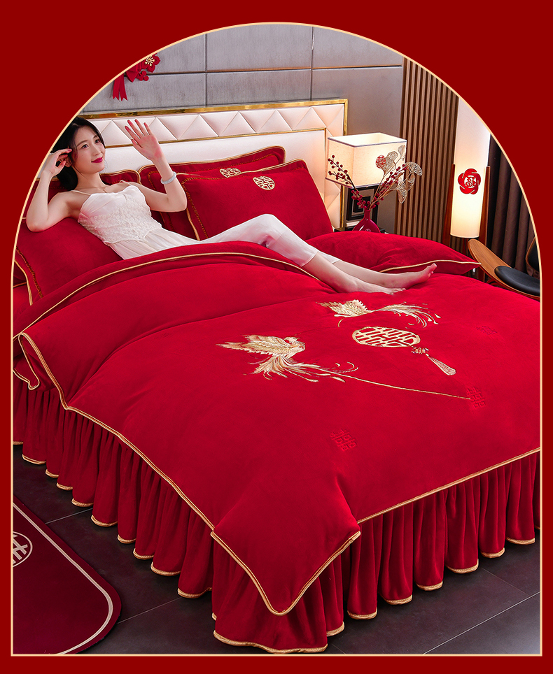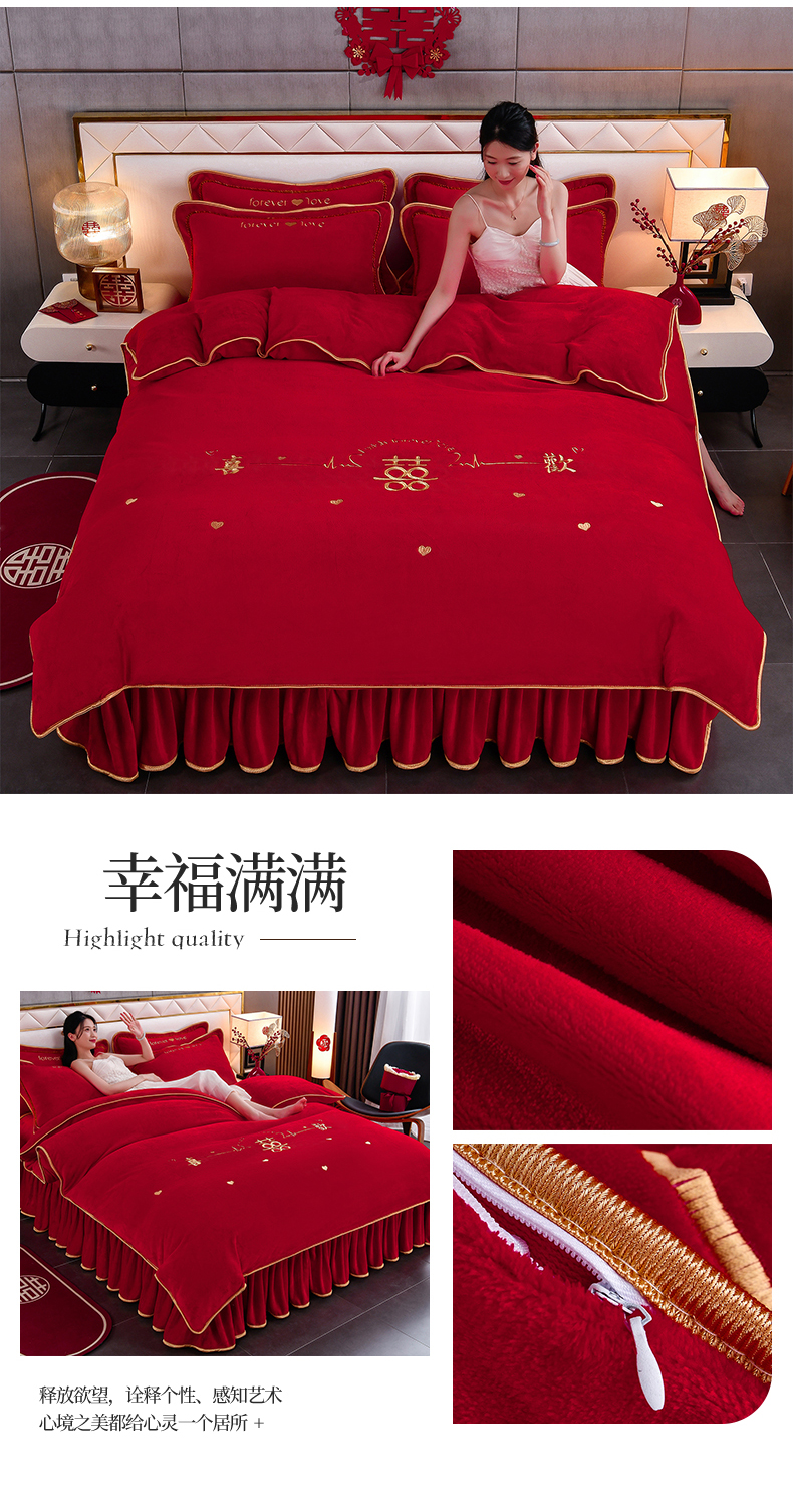居尚家纺 2025新款牛奶绒大红婚庆刺绣四件套 幸福满满