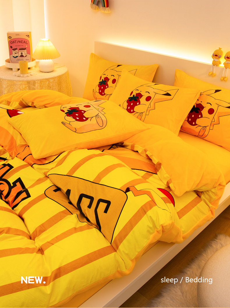 一电 2025外贸跨境电商儿童卡通床上四件套亲肤牛奶绒学生三件床单被套加大珊瑚宝宝卡通单被套 草莓皮卡丘