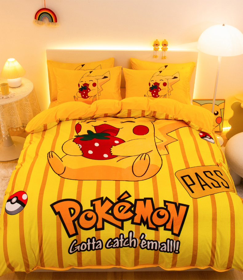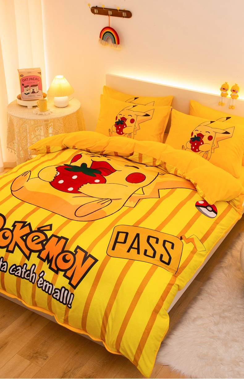 商品名称:一电 2025外贸跨境电商儿童卡通床上四件套亲肤牛奶绒学生三件床单被套加大珊瑚宝宝卡通单被套 草莓皮卡丘