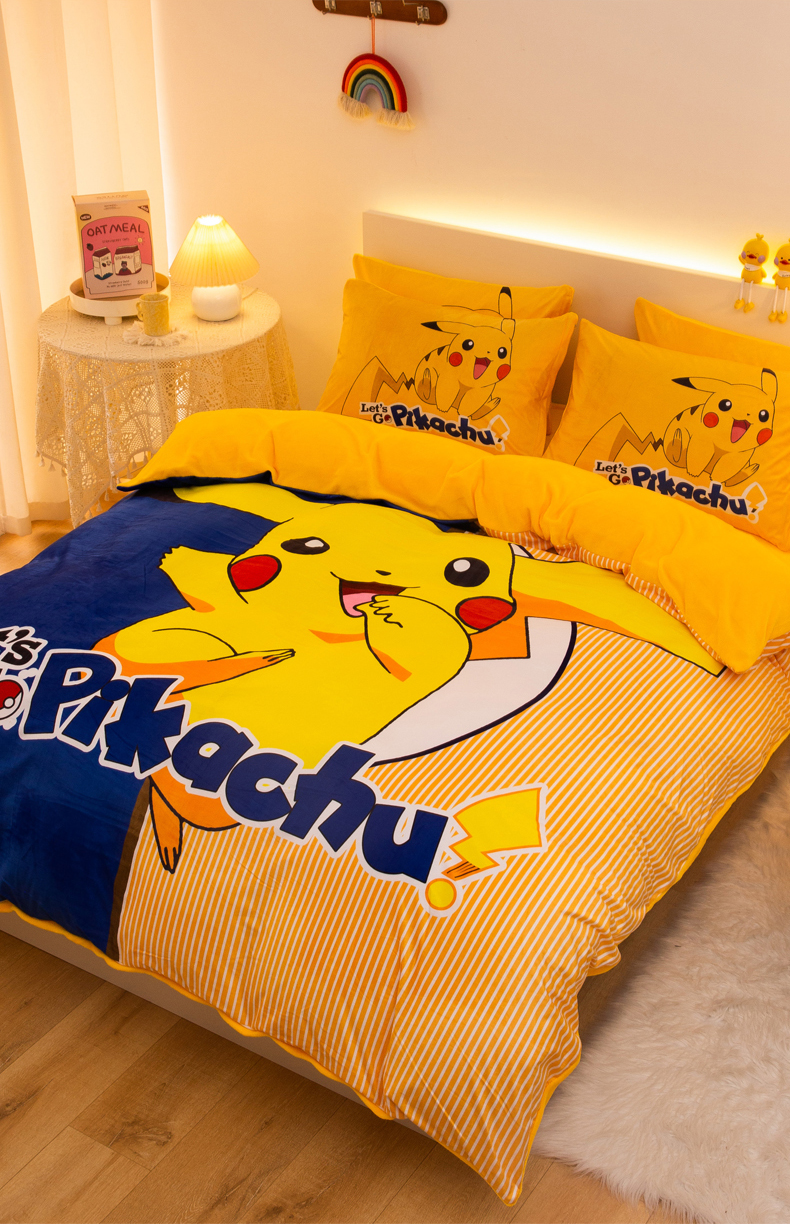 一电 2025外贸跨境电商儿童卡通床上四件套亲肤牛奶绒学生三件床单被套加大珊瑚宝宝卡通单被套 淘气皮卡丘