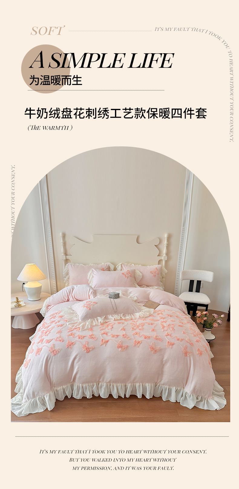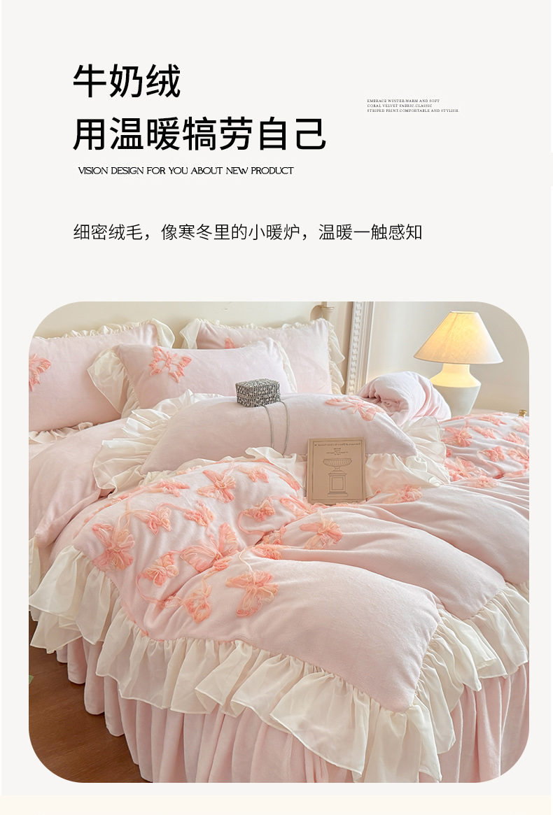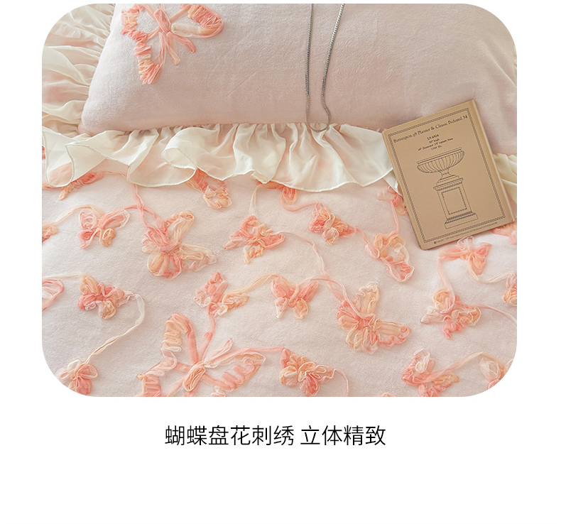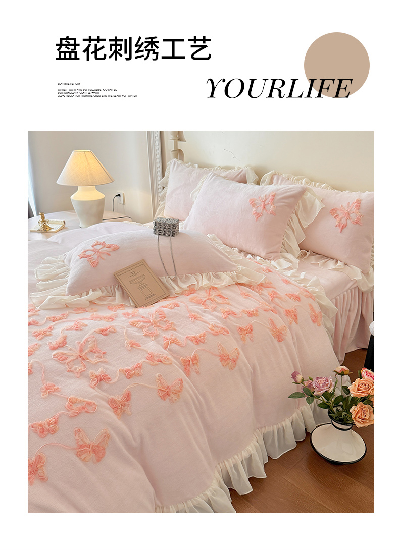 商品名称:(总)富盛家纺 2025新款牛奶绒床裙款盘花刺绣四件套韩版法式公主风--梦洛伊系列