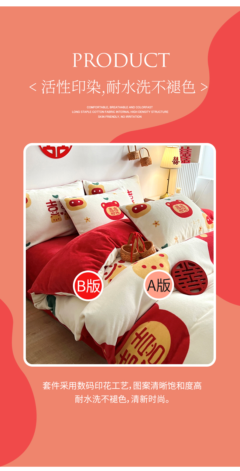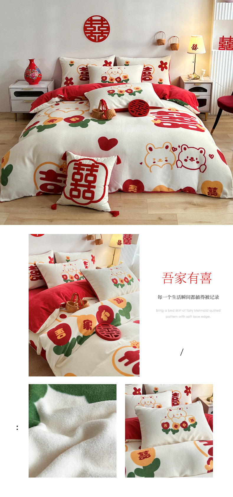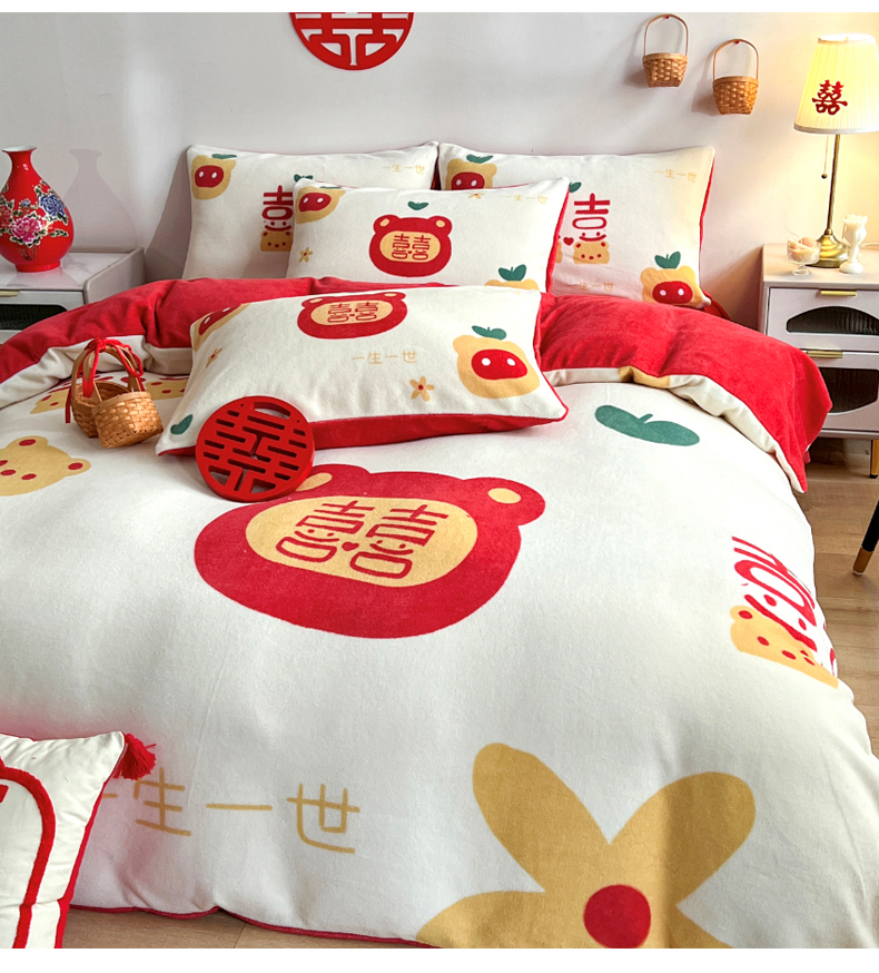 商品名称:一电 2025新款网红花婚庆牛奶绒四件套结婚喜被大红色新婚被罩婚嫁妆被套床单 一生一世