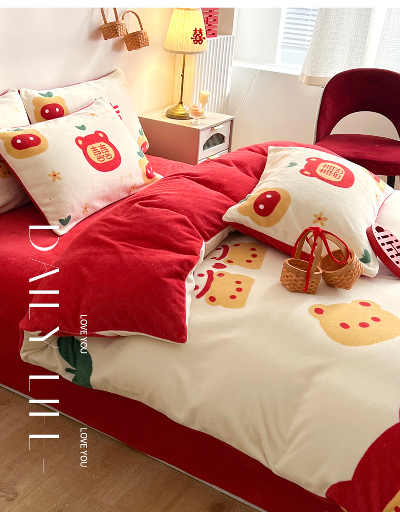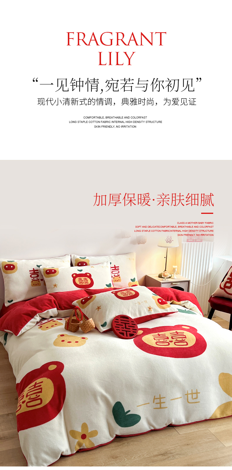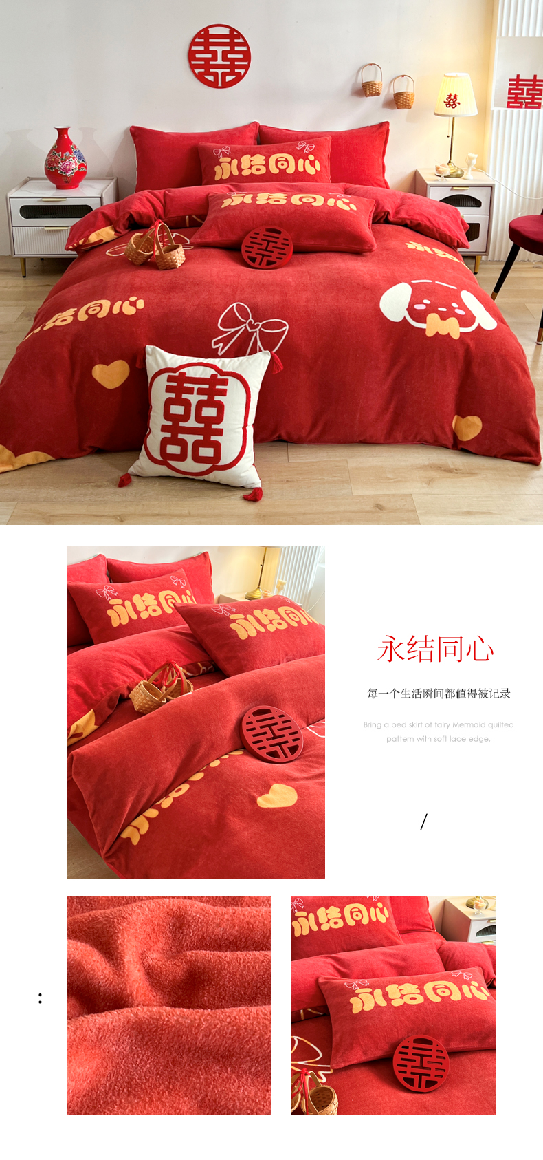 一电 2025新款网红花婚庆牛奶绒四件套结婚喜被大红色新婚被罩婚嫁妆被套床单 一生一世