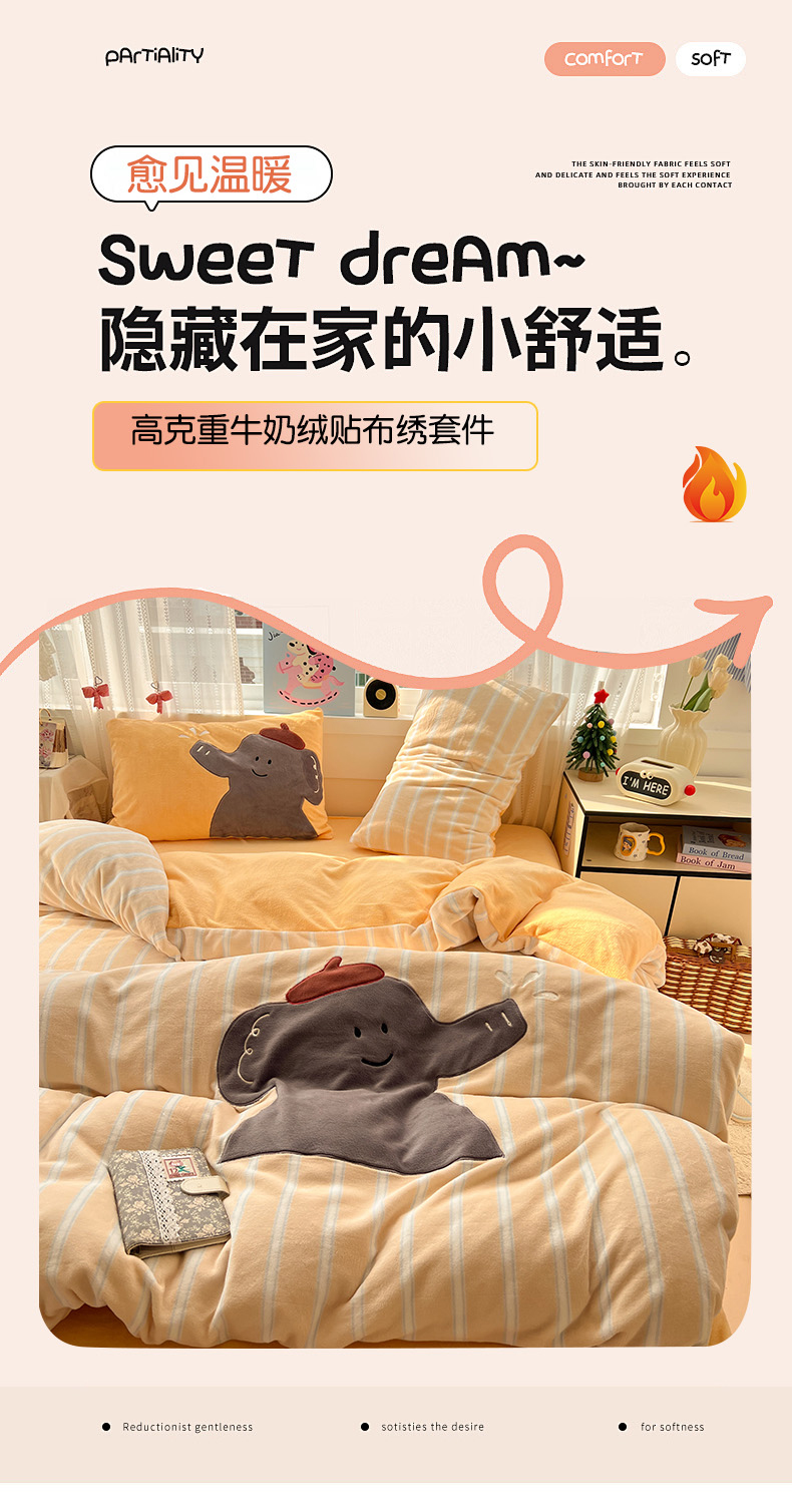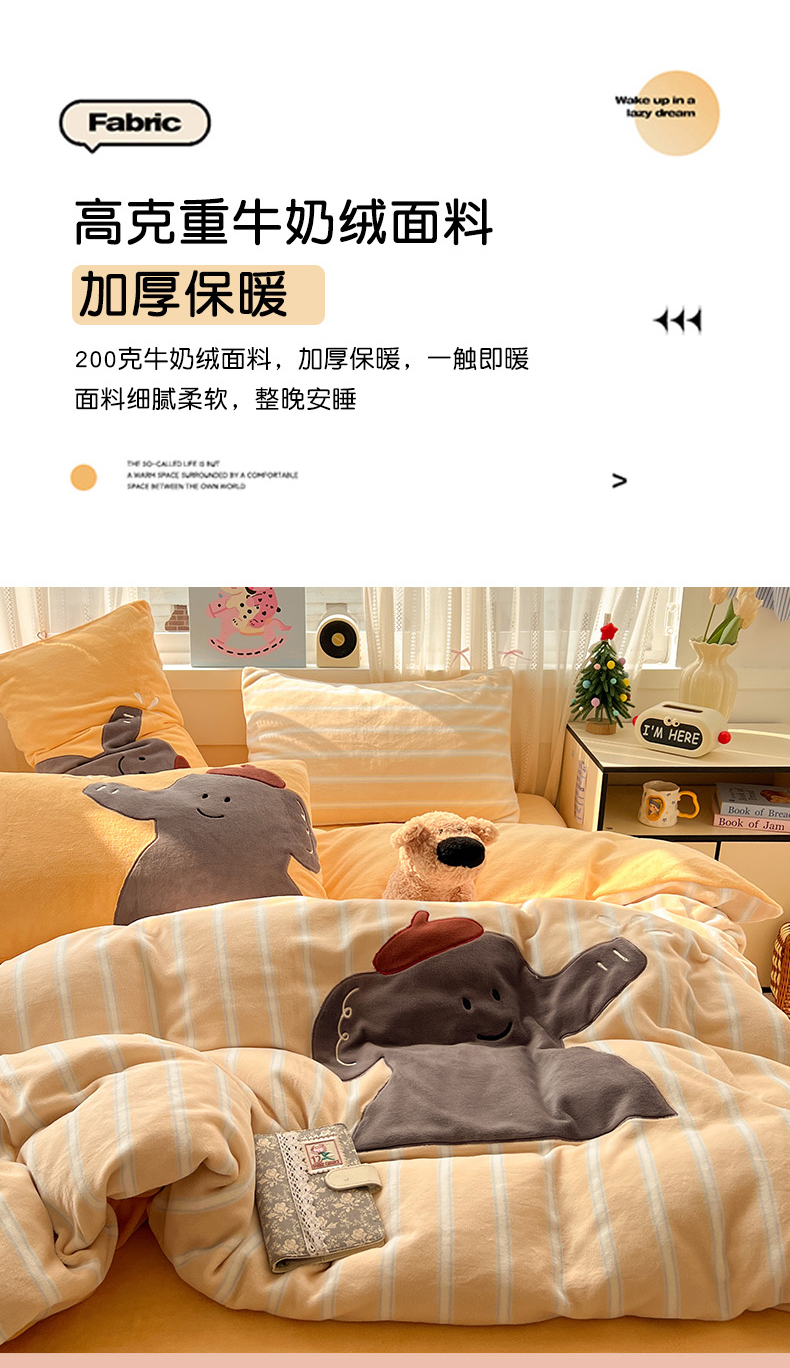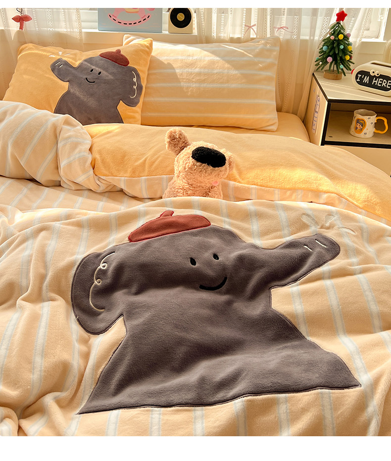 品乐家纺 2025秋冬新款高克重牛奶绒贴布绣四件套 条纹小象-黄