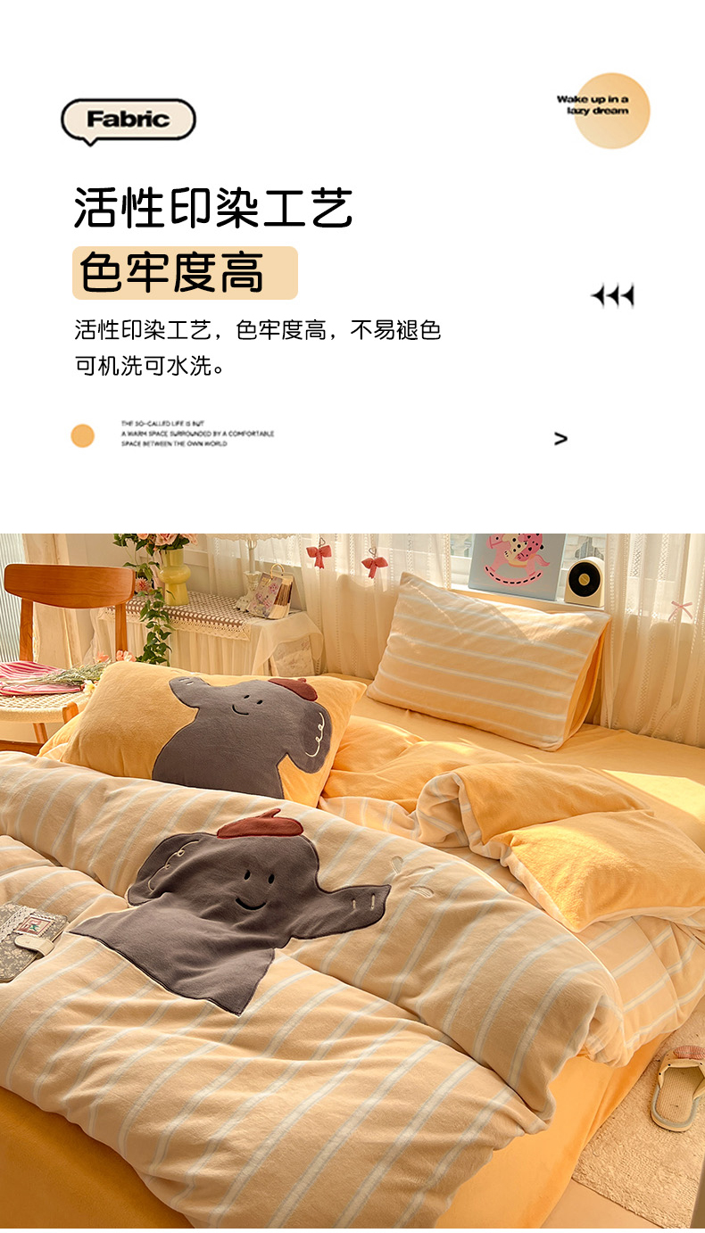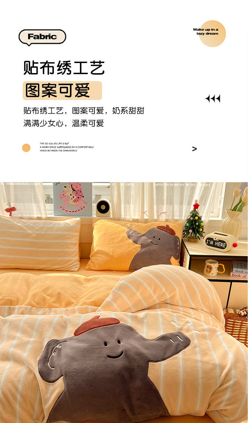 商品名称:品乐家纺 2025秋冬新款高克重牛奶绒贴布绣四件套 条纹小象-黄