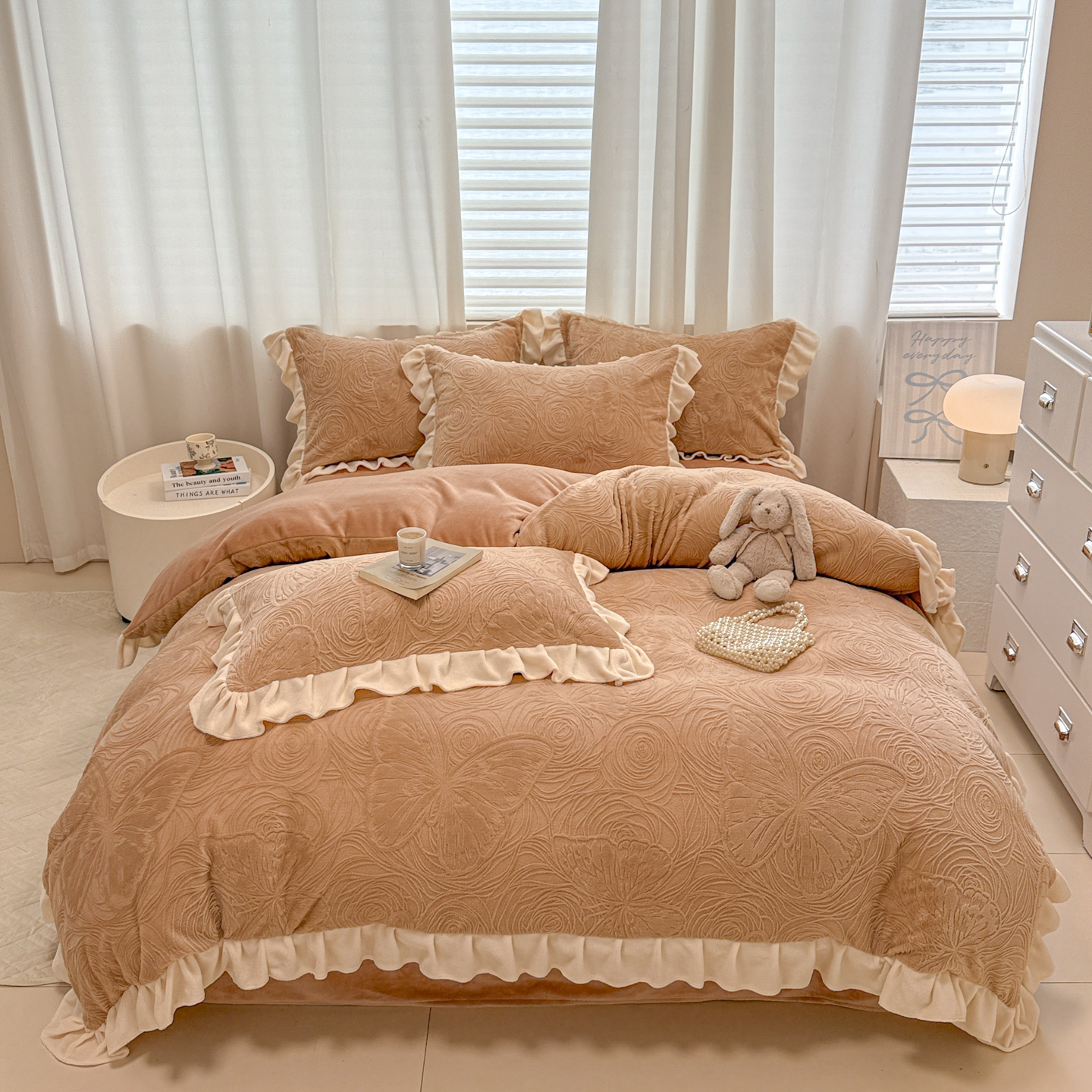 懒猫家纺 2025新款亲肤舒适牛奶绒四件套-千寻花语系列 千寻花语-奶杏