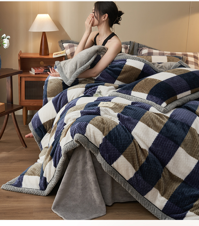 早晨家纺 2025新款豆豆款菠萝格提花四件套 豆豆绒-大方格蓝