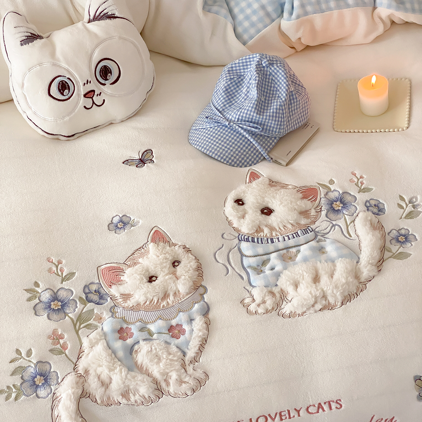(总)星野 2025新款高克重牛奶绒贴布刺绣四件套-喵花细语