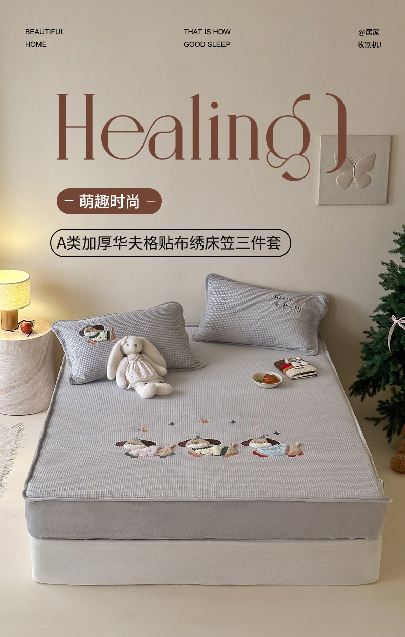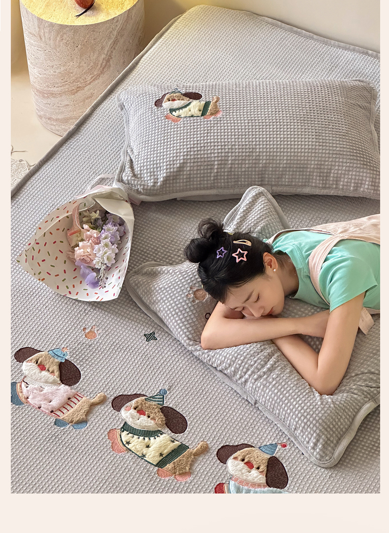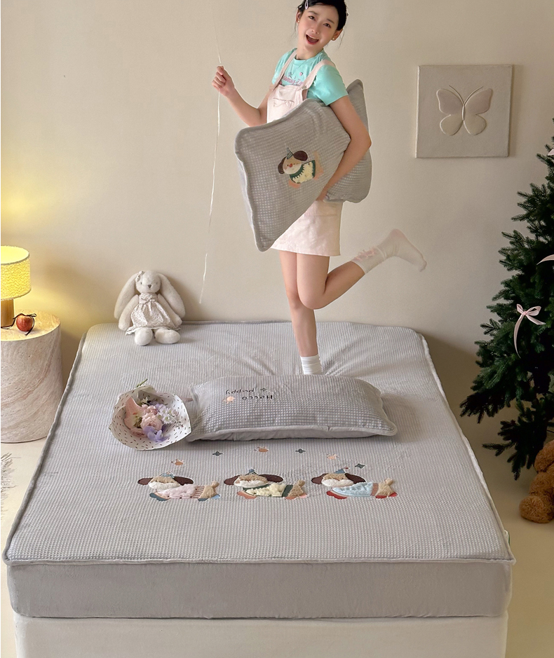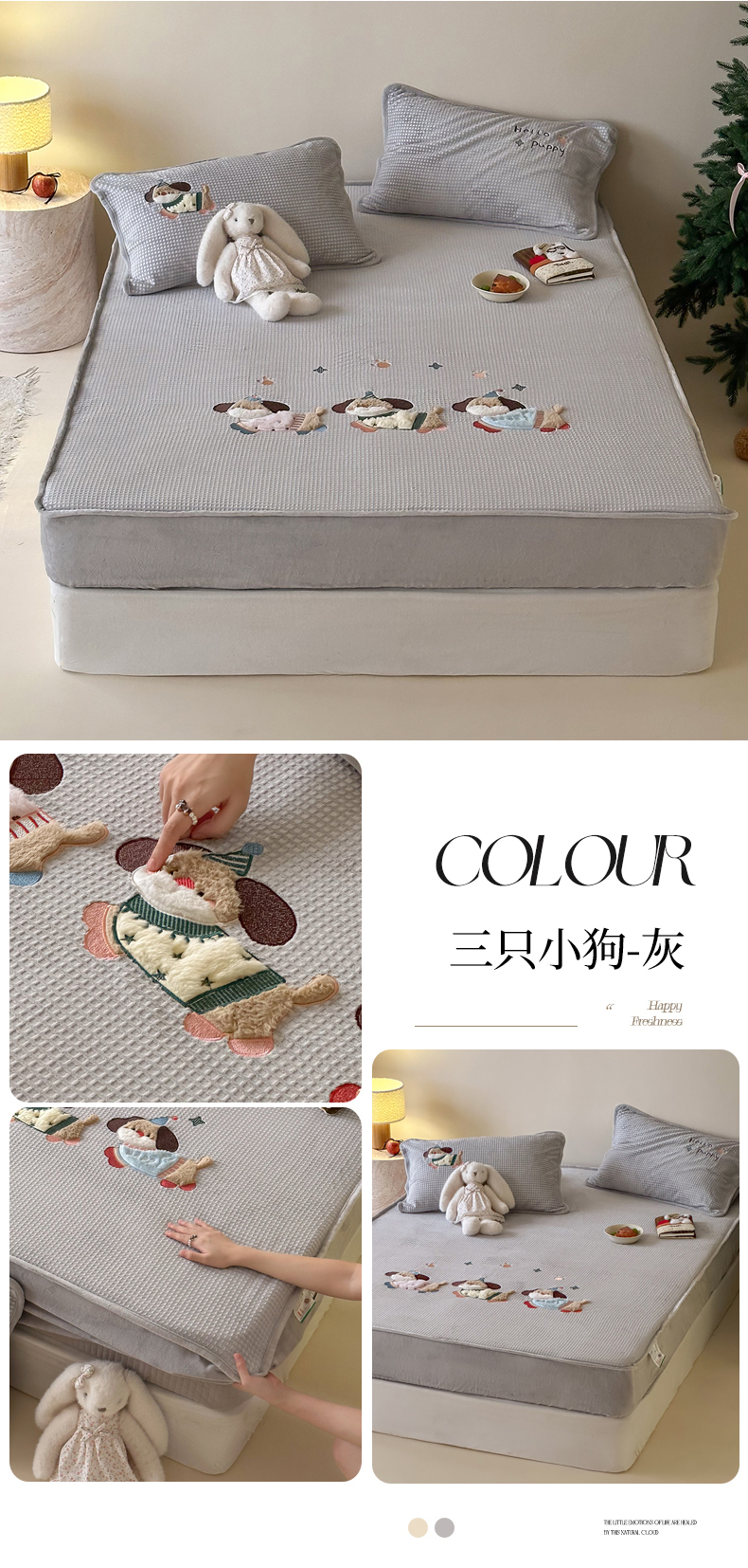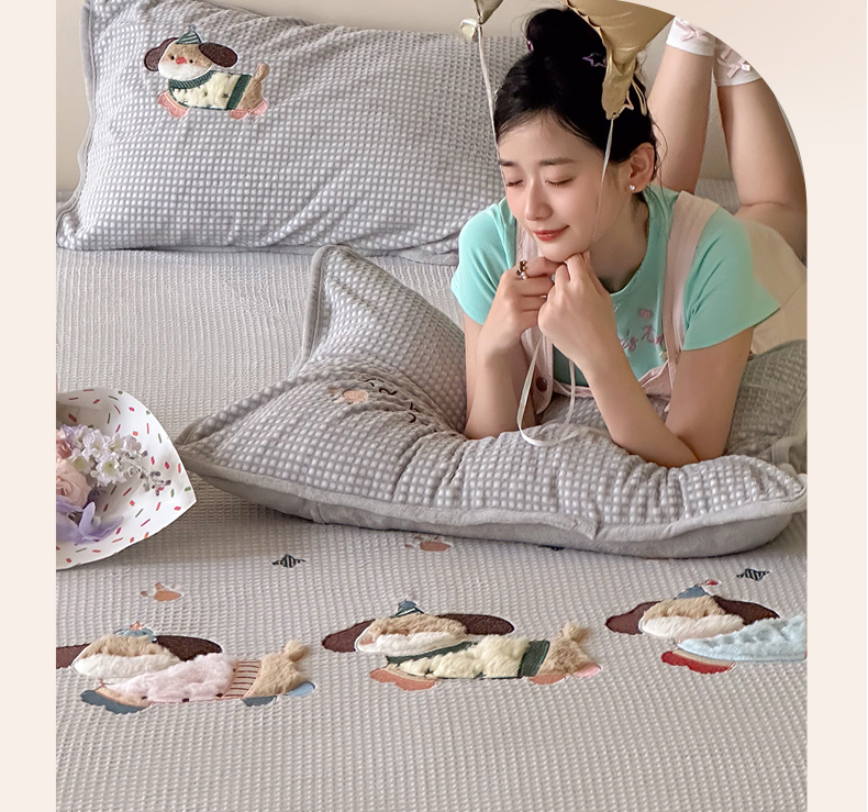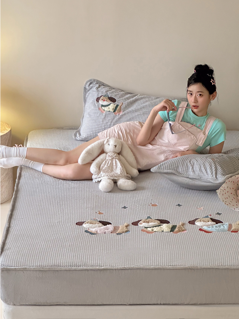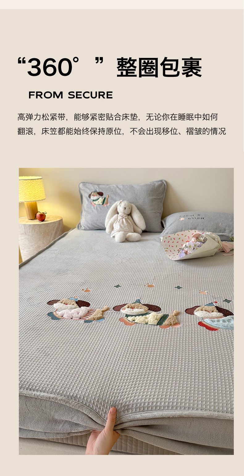 商品名称:Sweet dreams甜梦 2025新款华夫格绒兔毛贴布床笠三件套 三只小狗灰