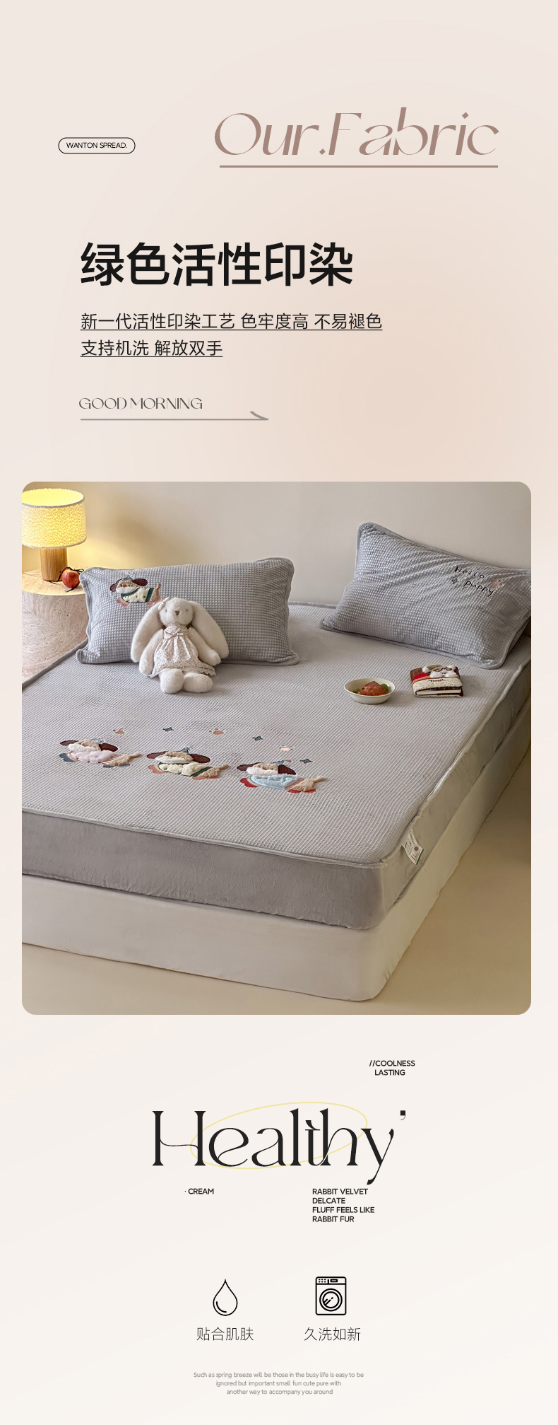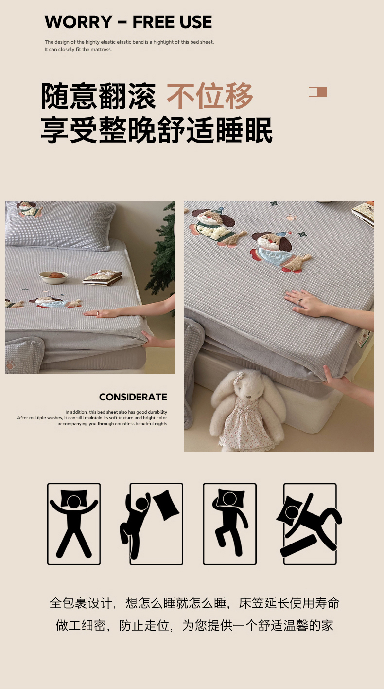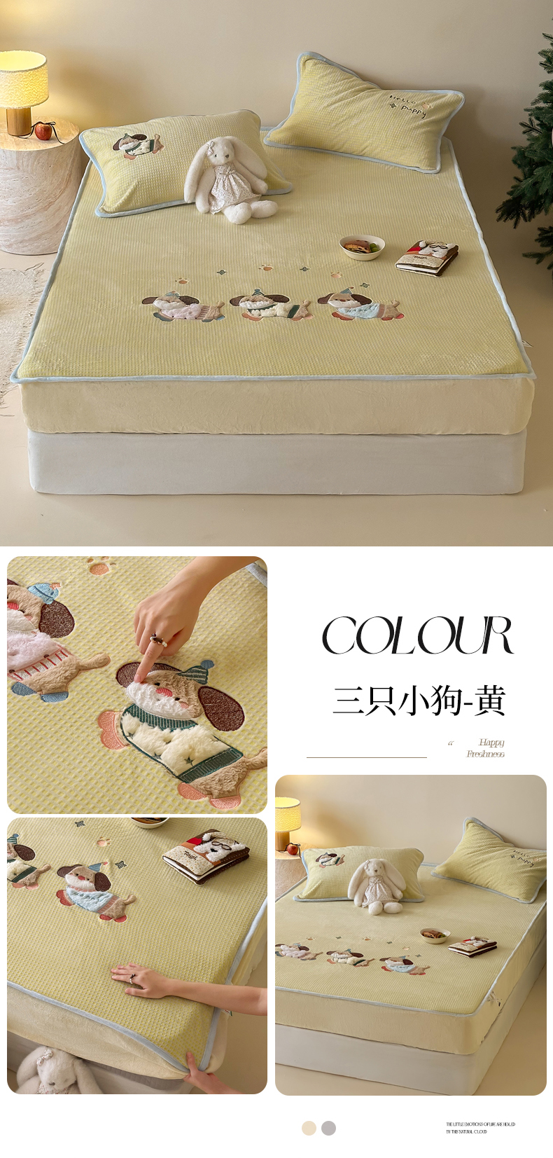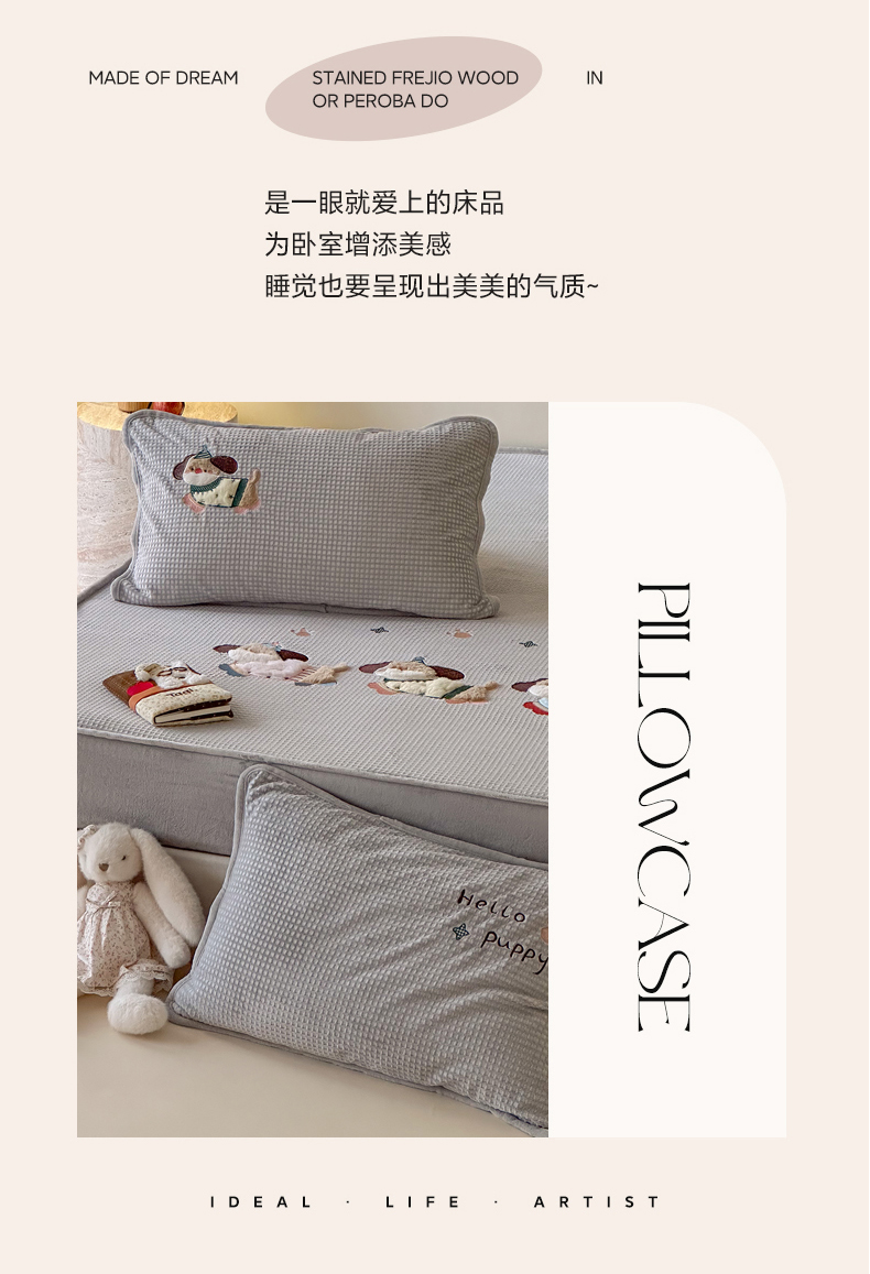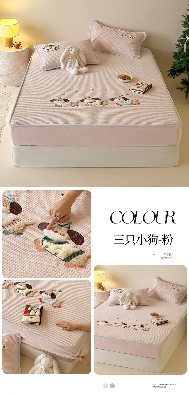 商品名称:Sweet dreams甜梦 2025新款华夫格绒兔毛贴布床笠三件套 三只小狗灰