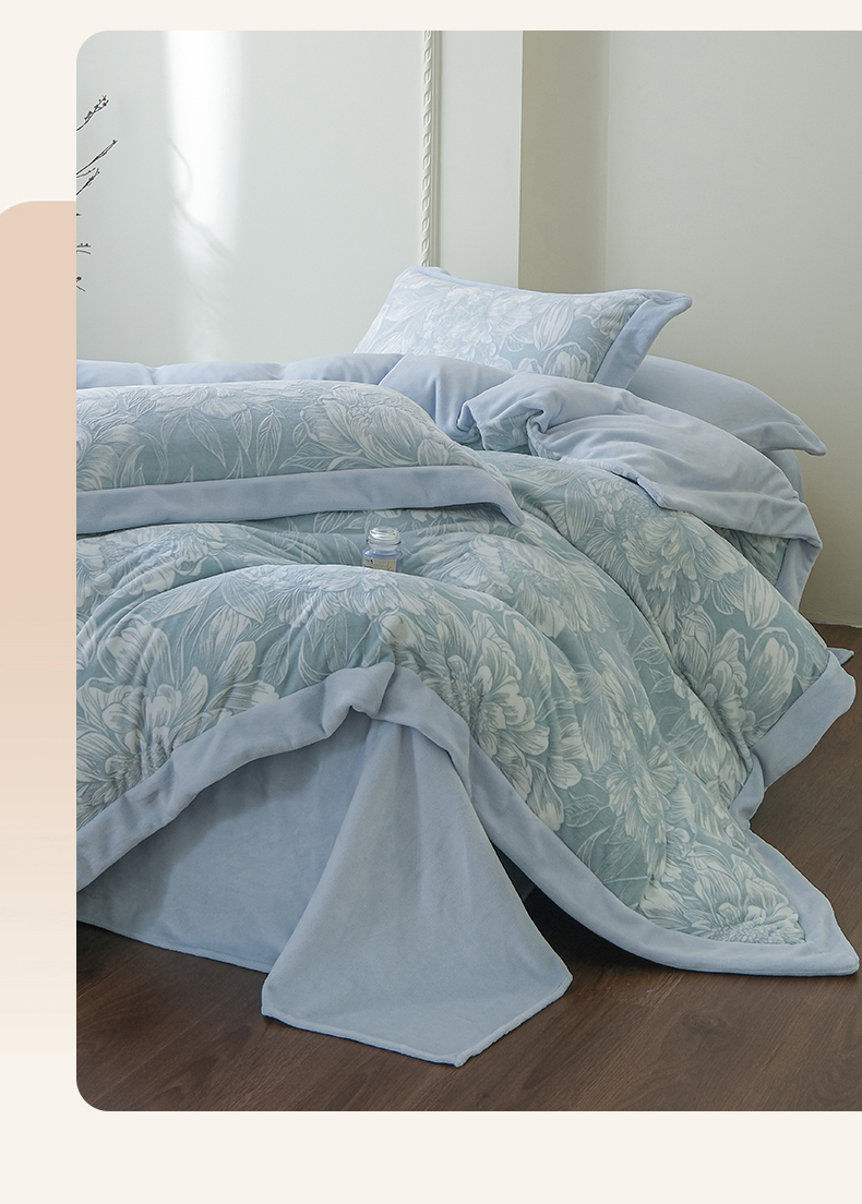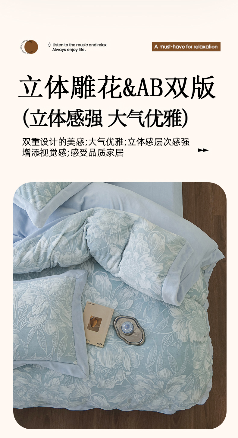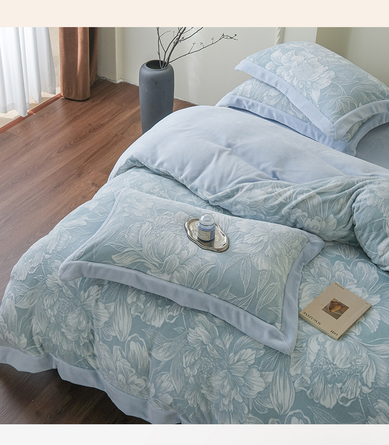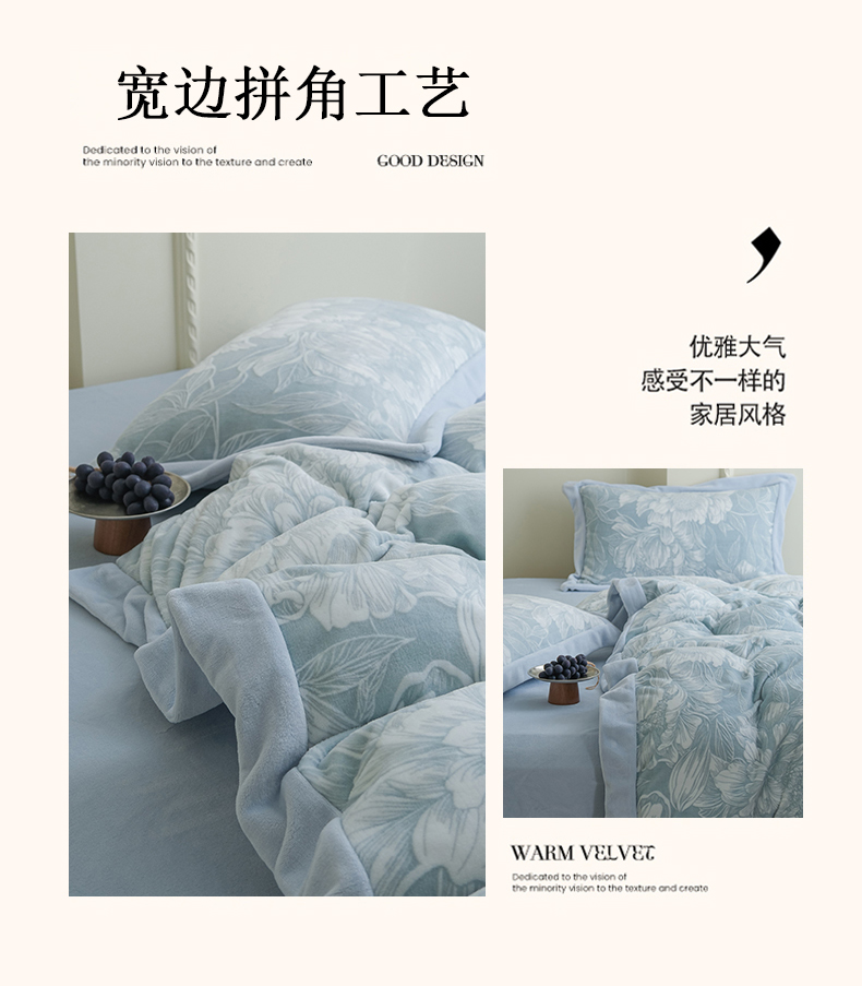 米奈家居 2025新款立体雕花拼角款牛奶绒四件套 花间集-蓝