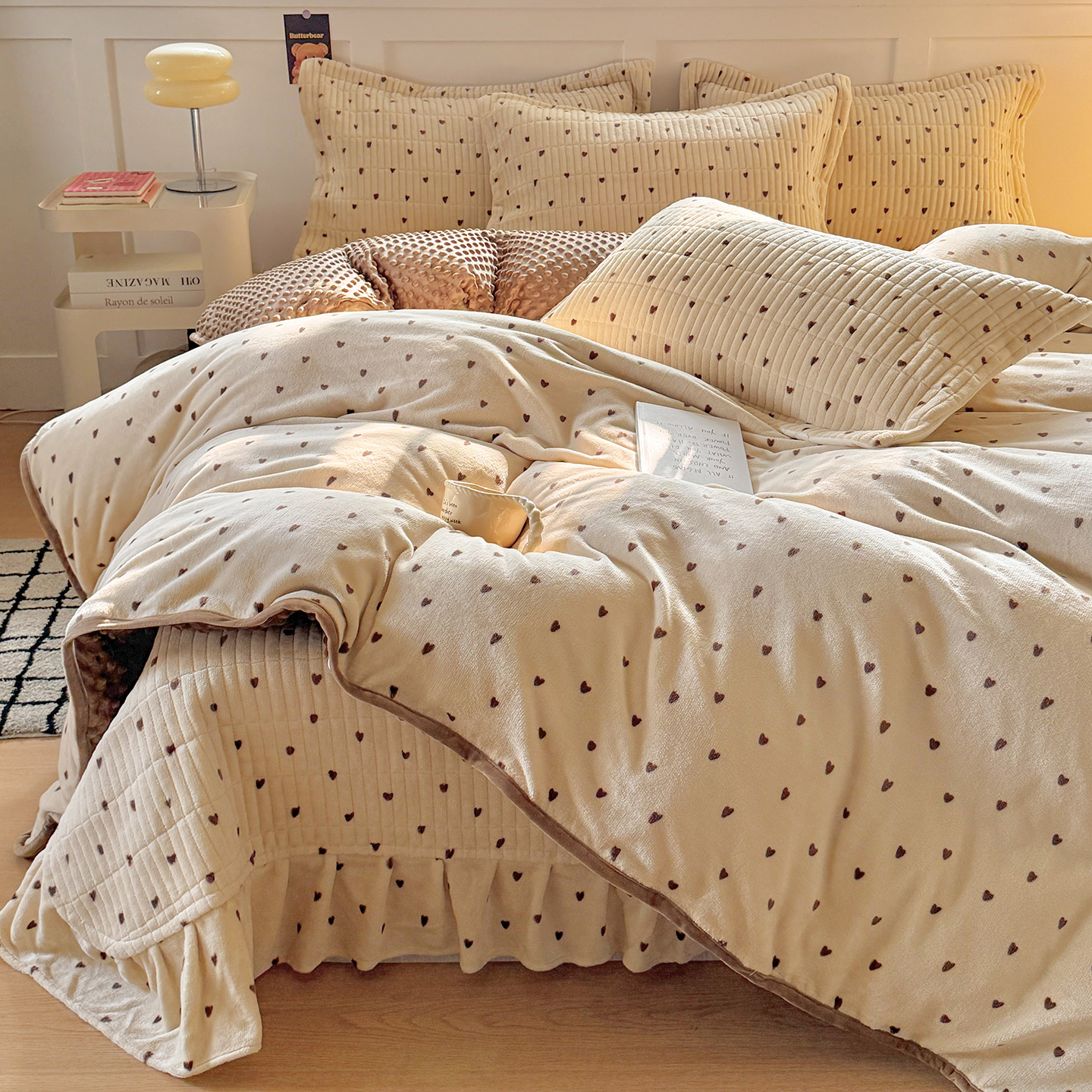 (总)欧尚 2025新款牛奶绒花边床盖四件套,粉点点,花小玉,咖色小心心,蓝点点,慕然,仙女粉,仙女紫