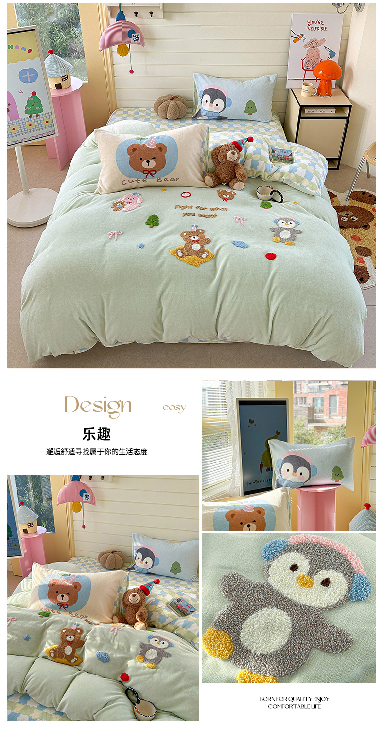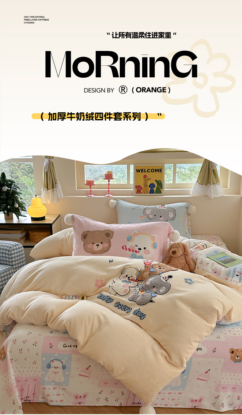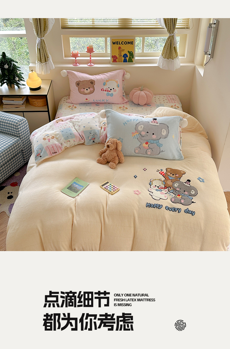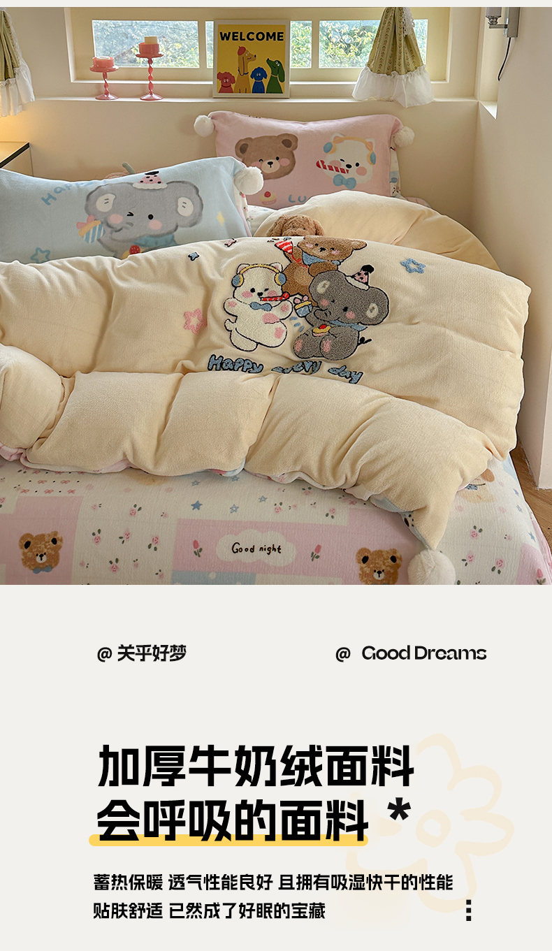 (总)眠屿家纺 2025新款加厚牛奶绒贴布绣四件套,棒球熊,动物朋友,欢乐音乐