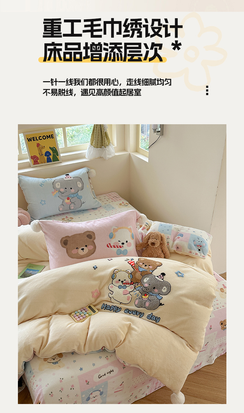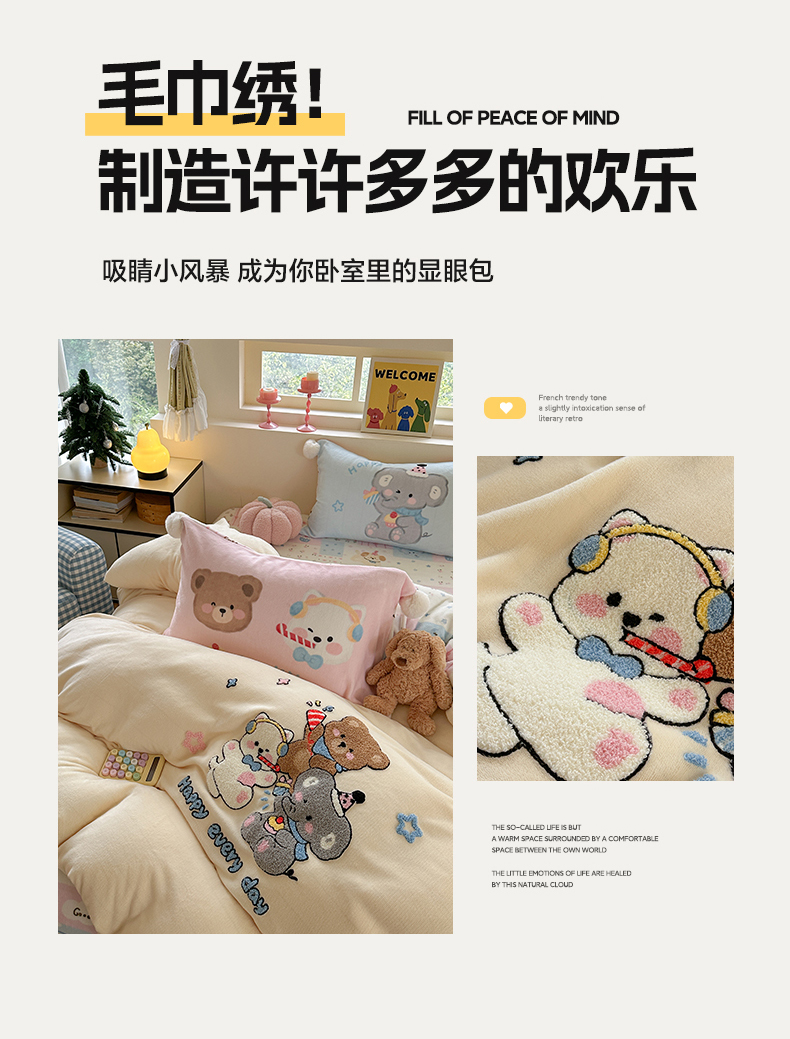 (总)眠屿家纺 2025新款加厚牛奶绒毛巾绣四件套,乐趣,面包狗,玩偶,玩泡泡