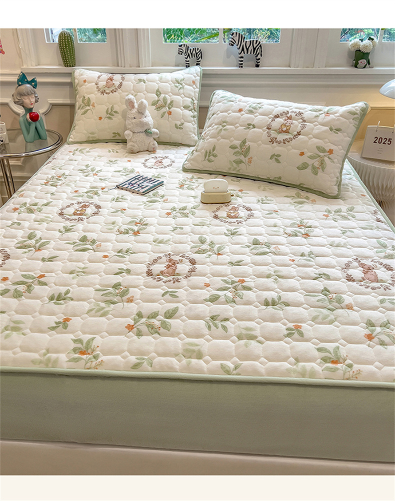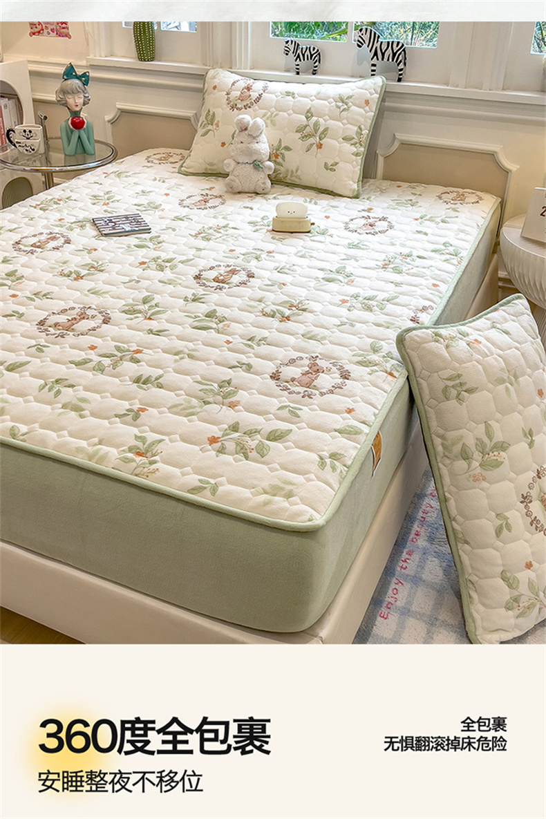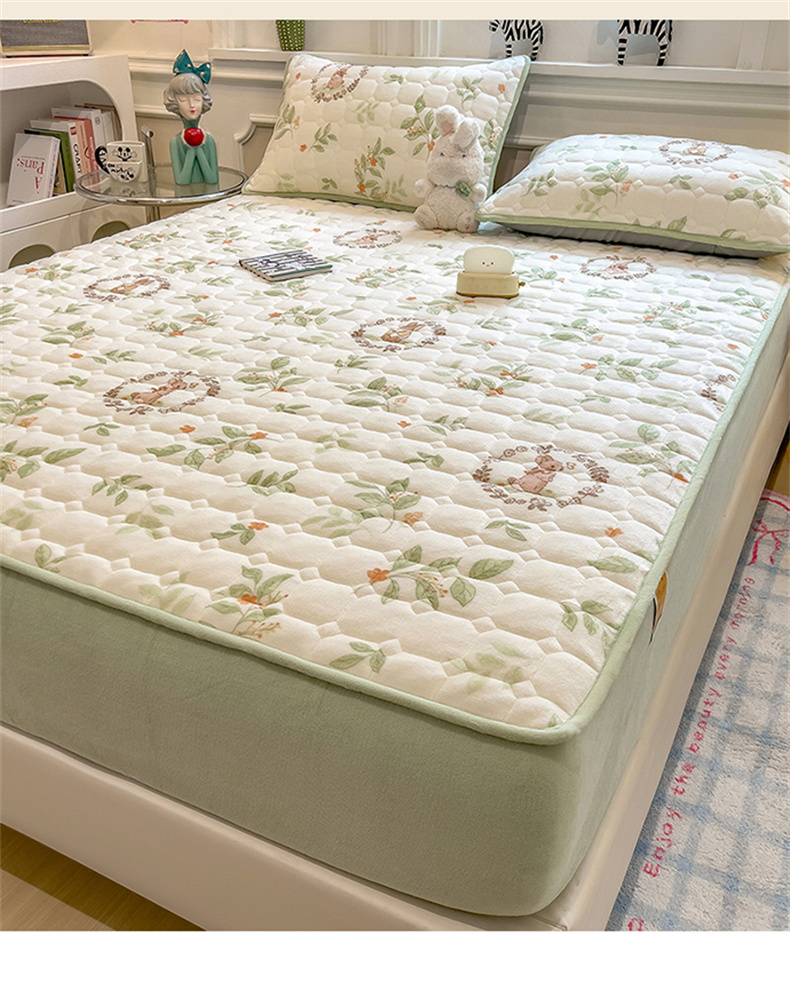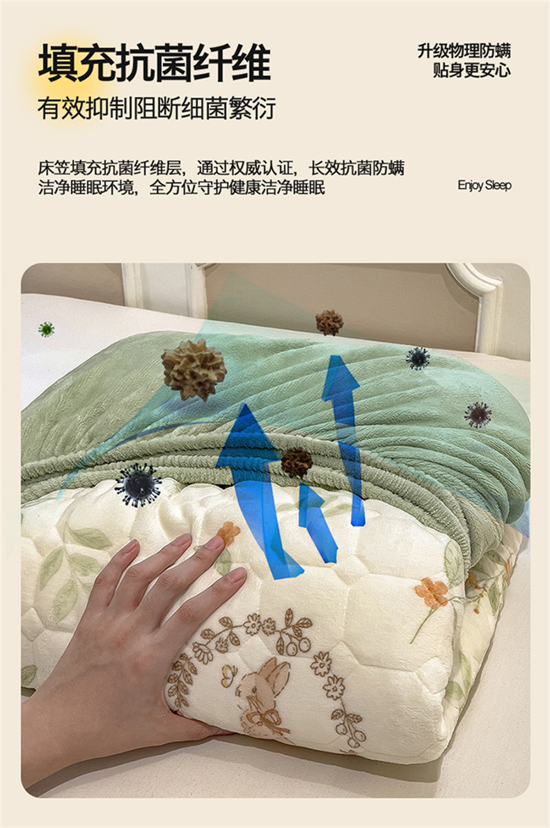商品名称:布卢姆床垫 2025新款A类抗菌印花牛奶绒夹棉床笠 叶畔兔语