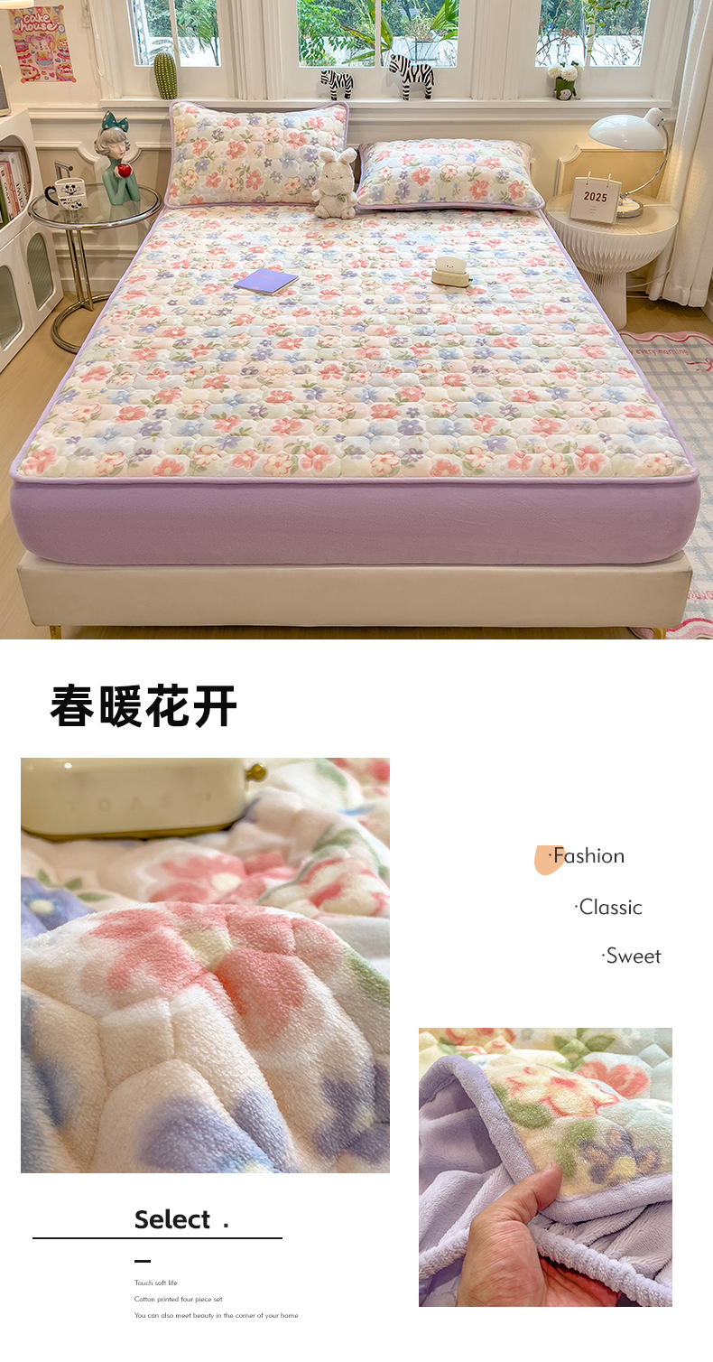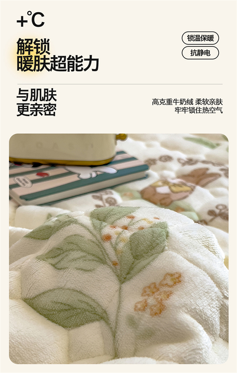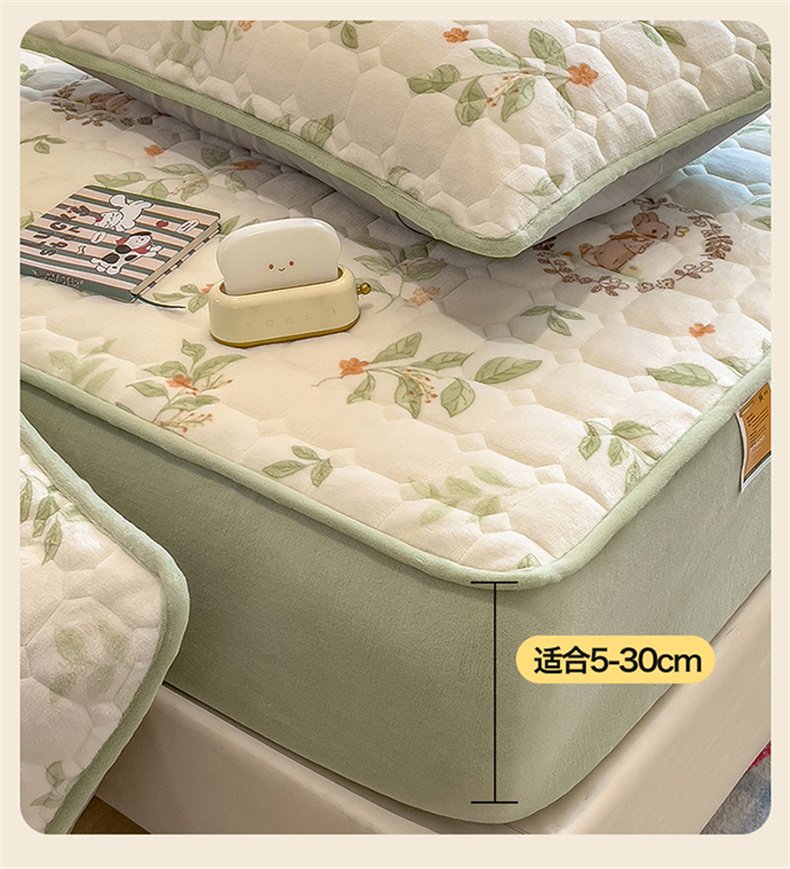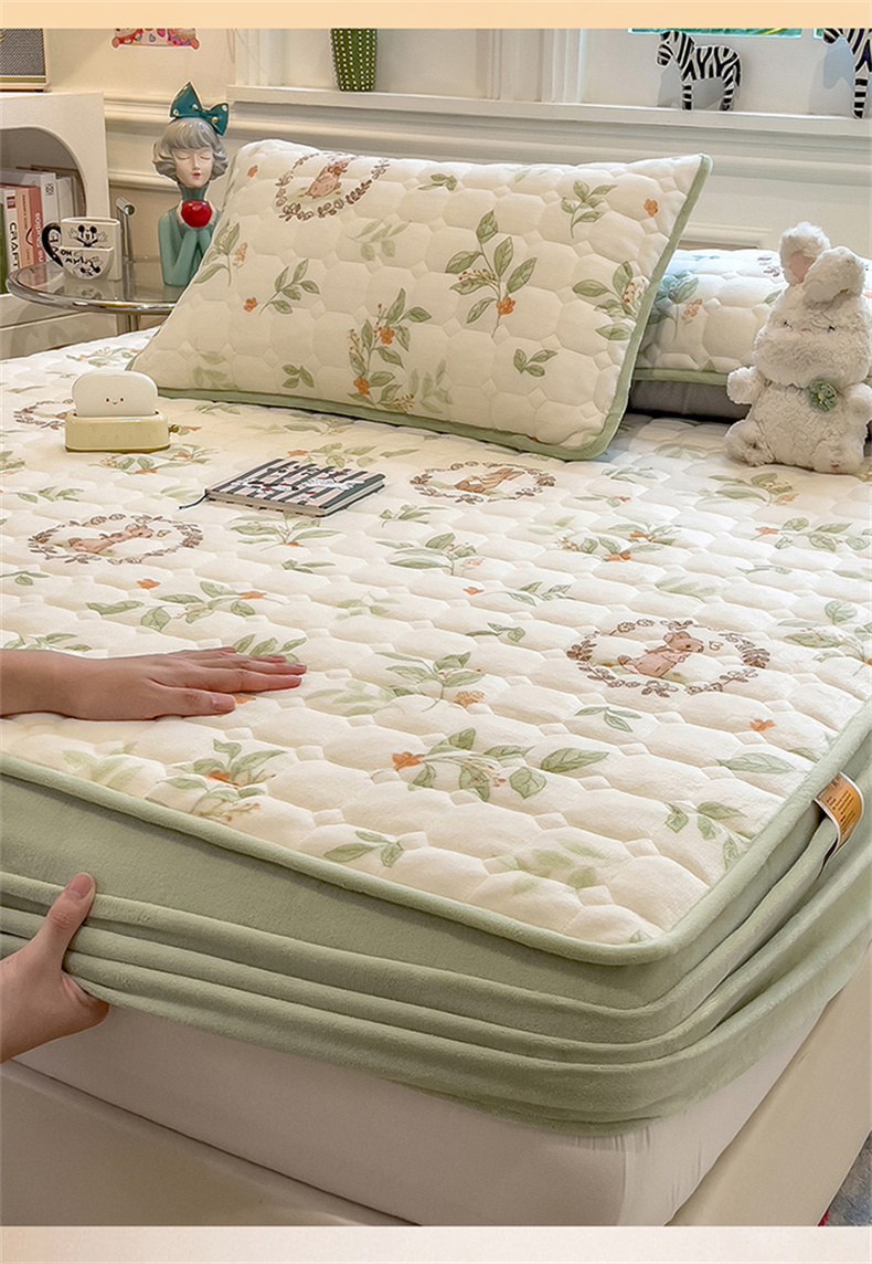 商品名称:布卢姆床垫 2025新款A类抗菌印花牛奶绒夹棉床笠 叶畔兔语