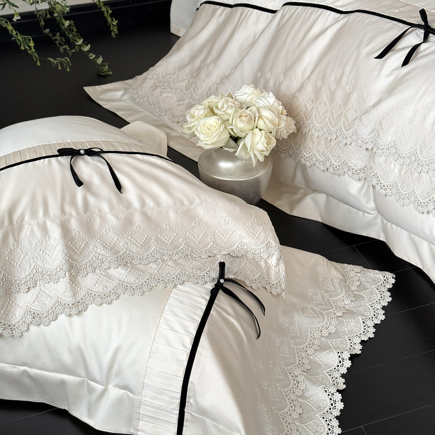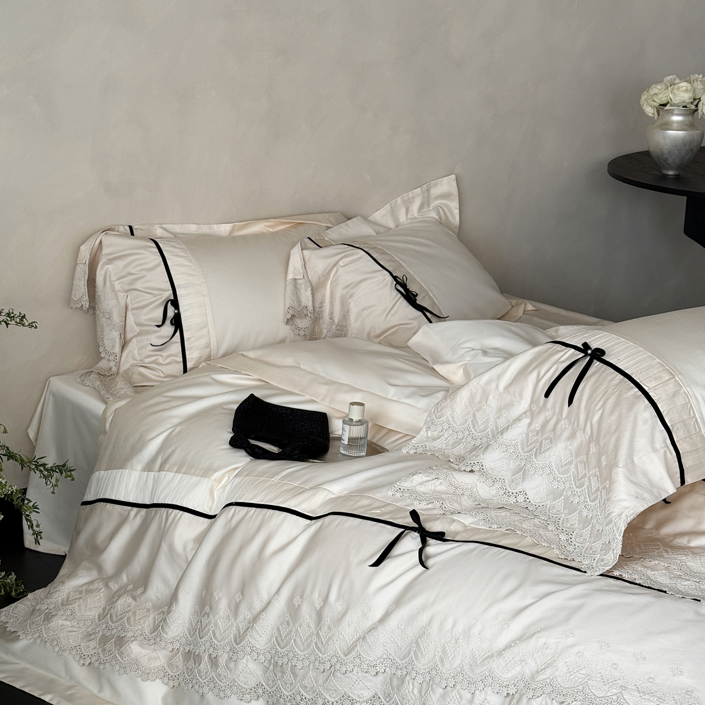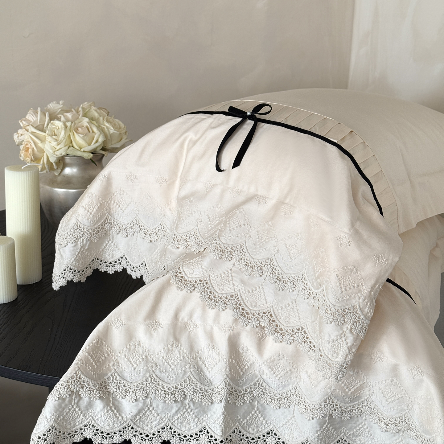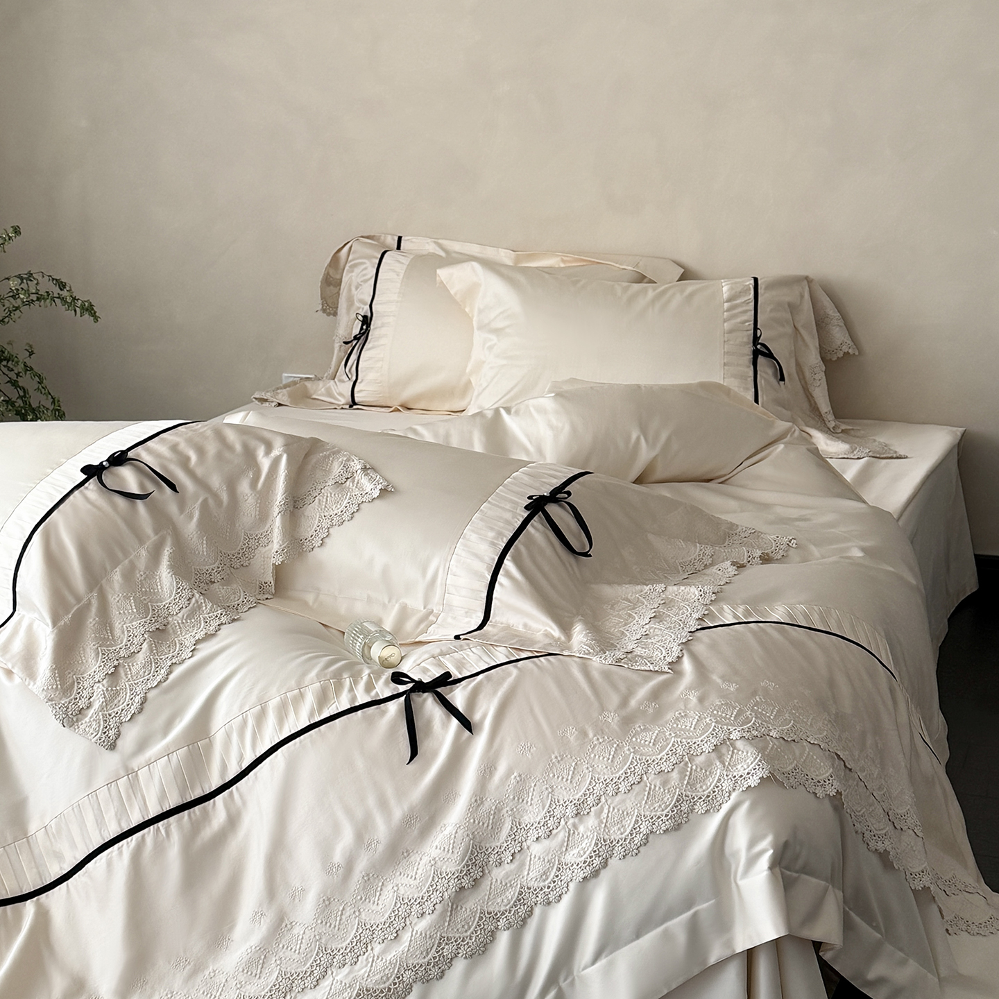 (总)佳汐蓝 2025春夏新品双层皱皱纱刺绣+织带+荷叶边四件套--白茶花,奶白,曲奇