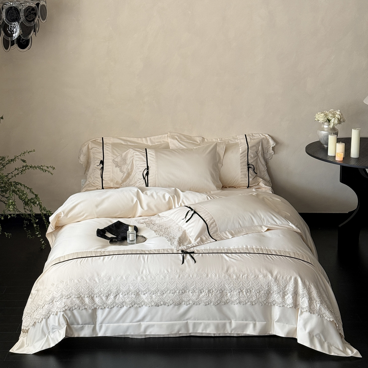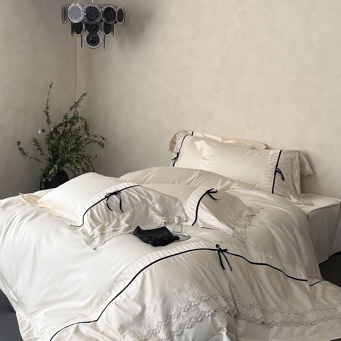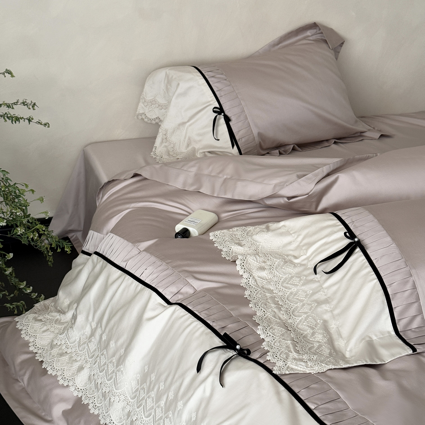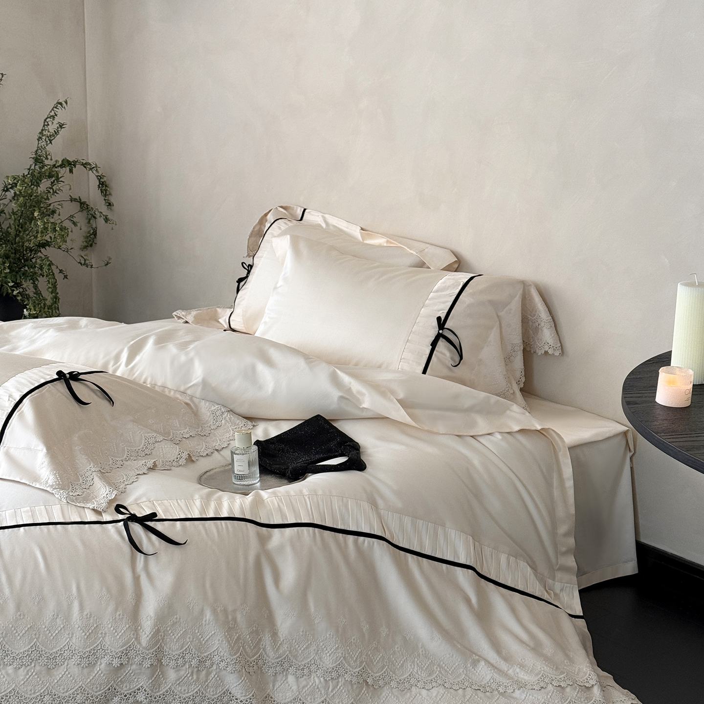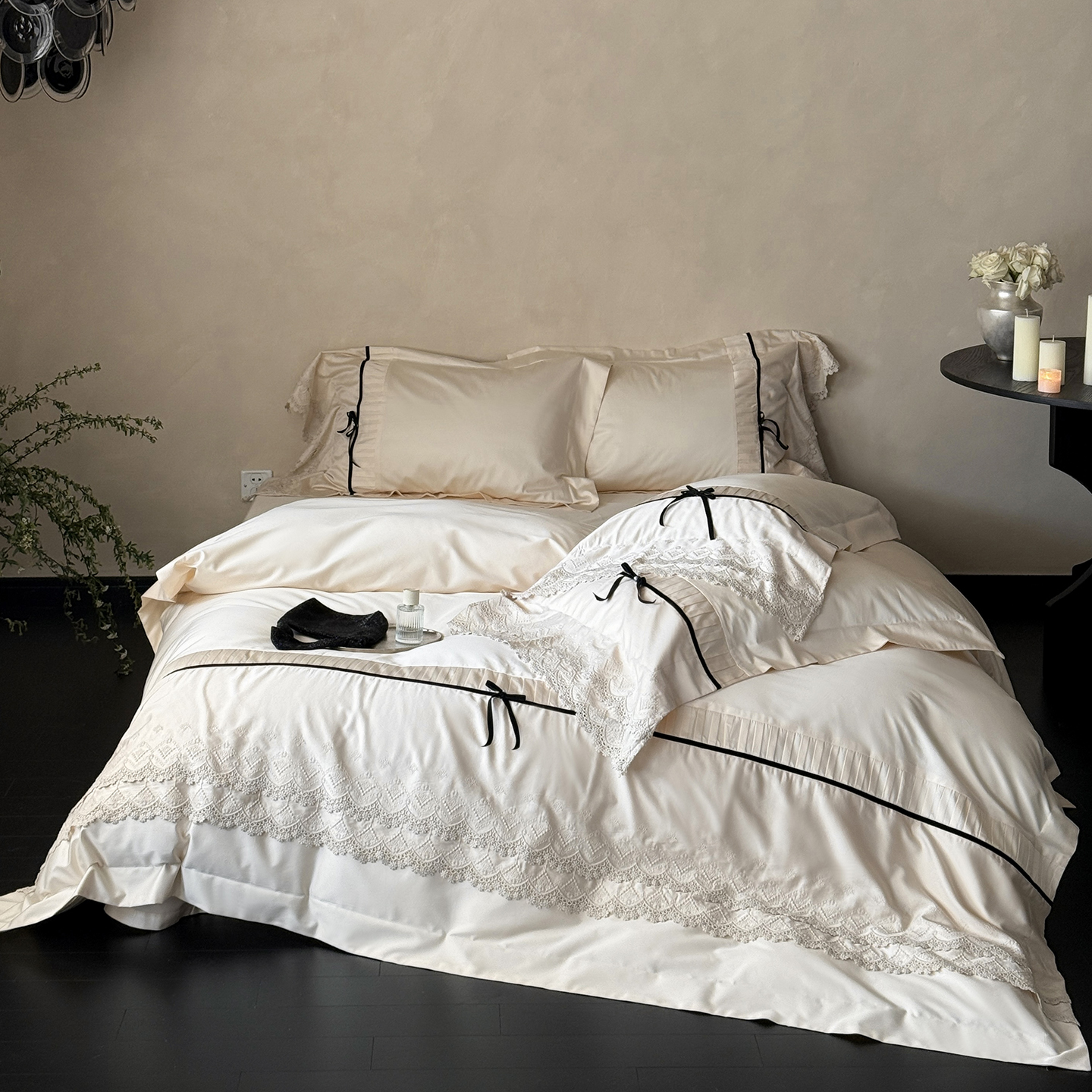 (总)佳汐蓝 2025春夏新品双层皱皱纱刺绣+织带+荷叶边四件套--白茶花,奶白,曲奇