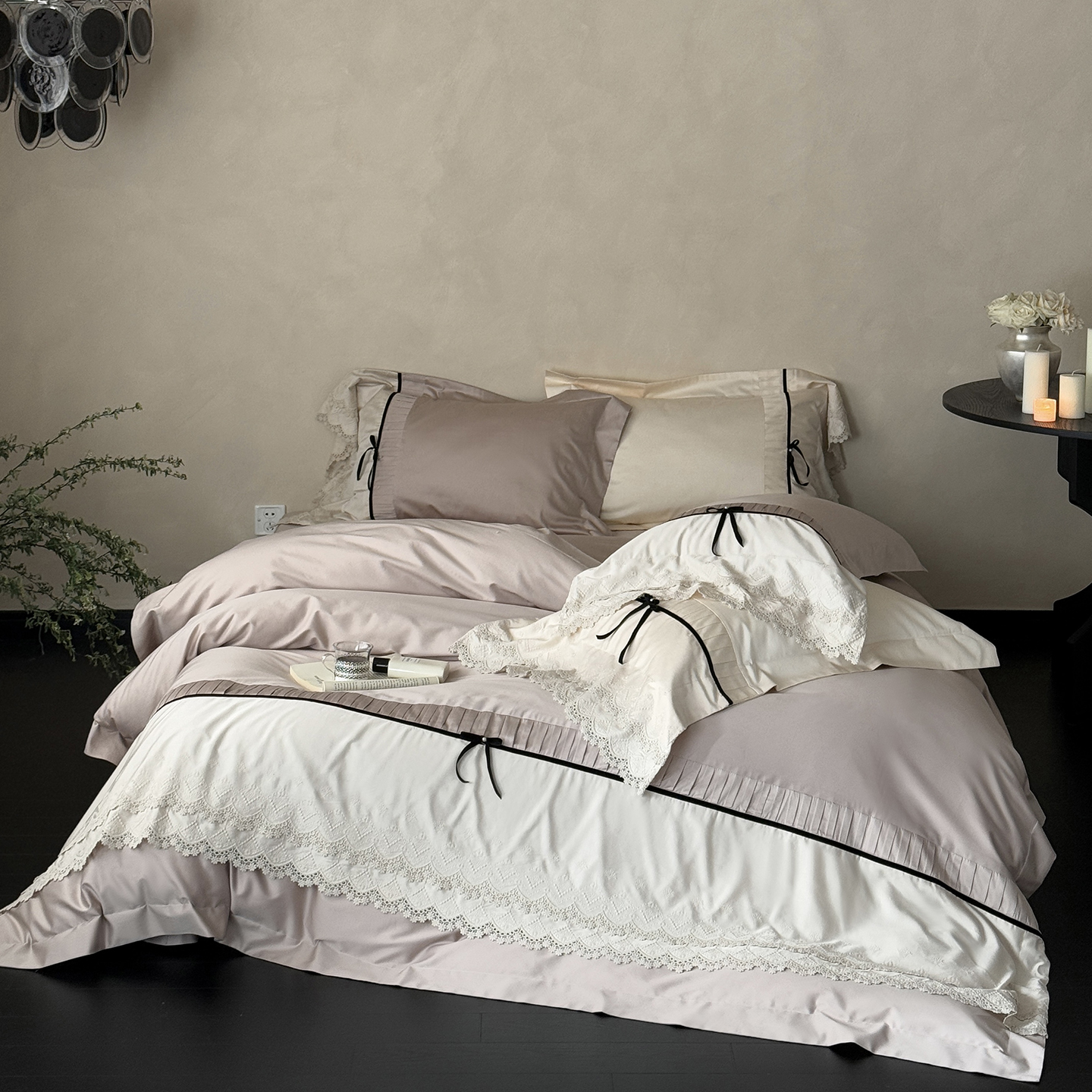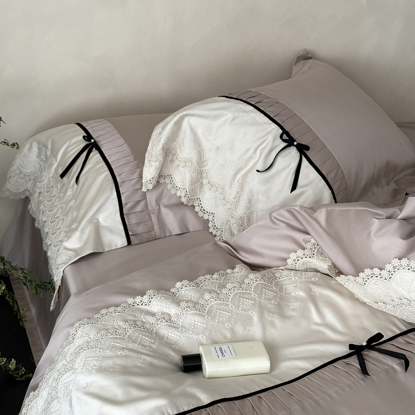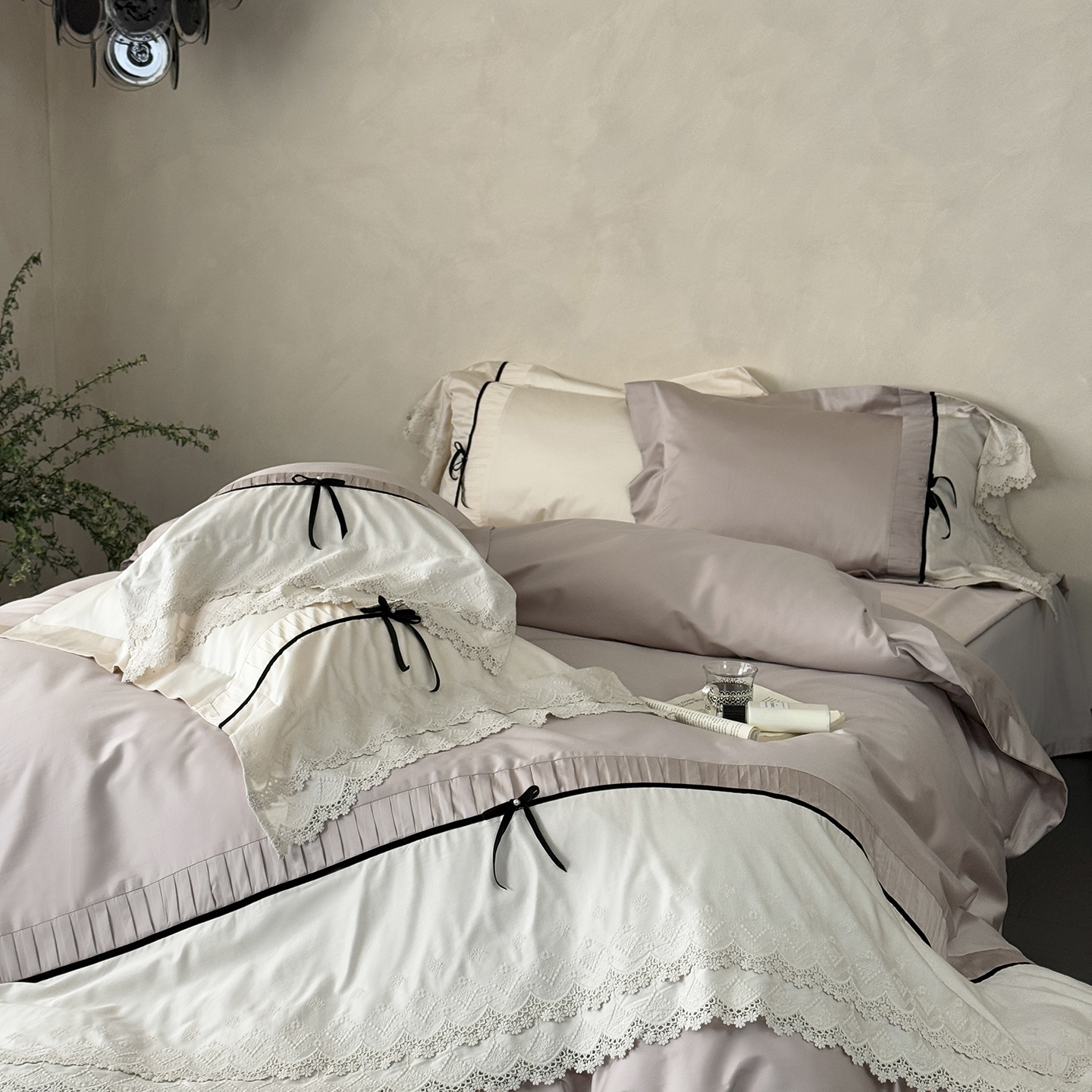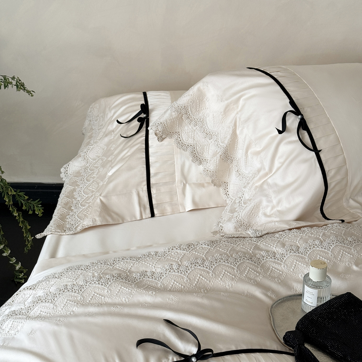 (总)佳汐蓝 2025春夏新品双层皱皱纱刺绣+织带+荷叶边四件套--白茶花,奶白,曲奇