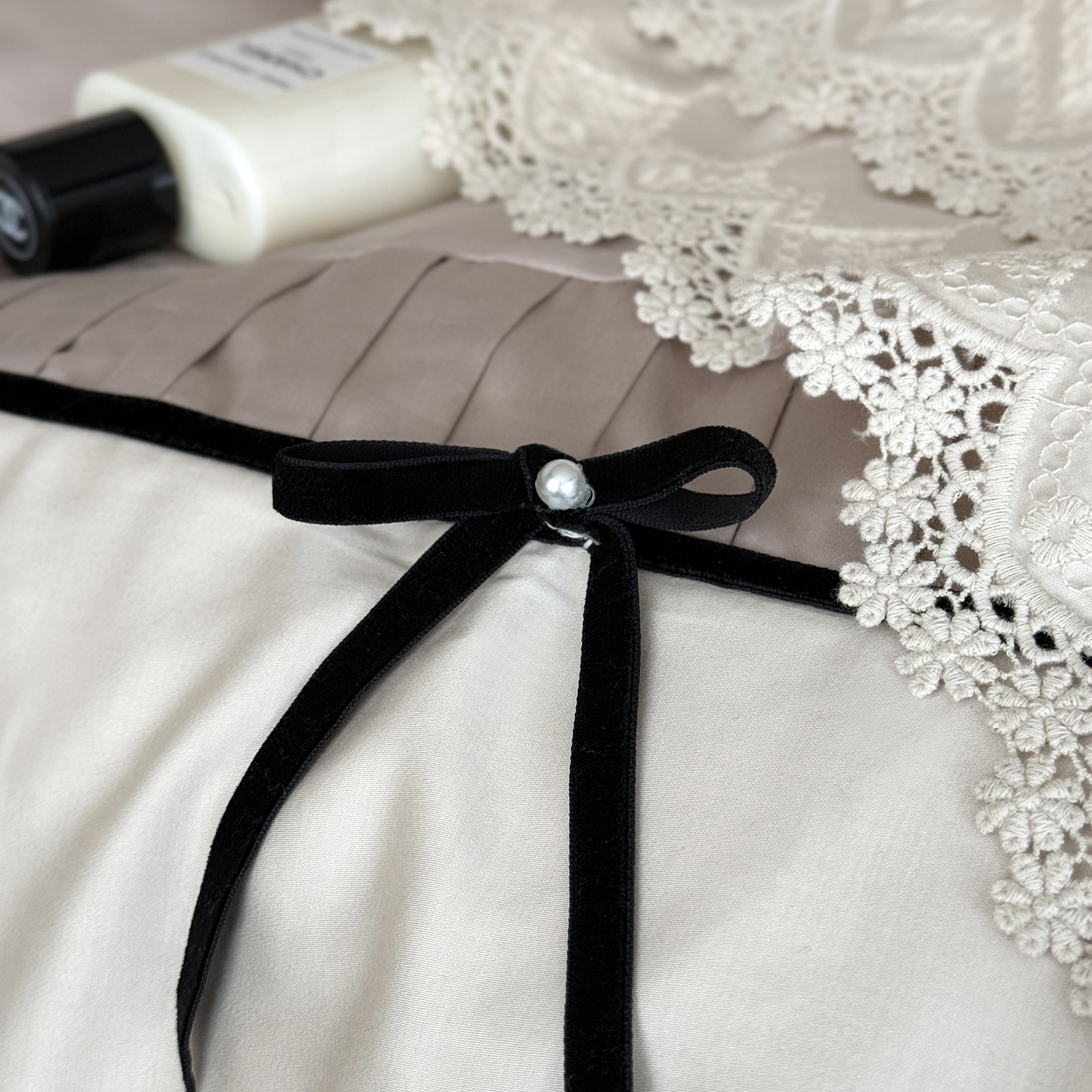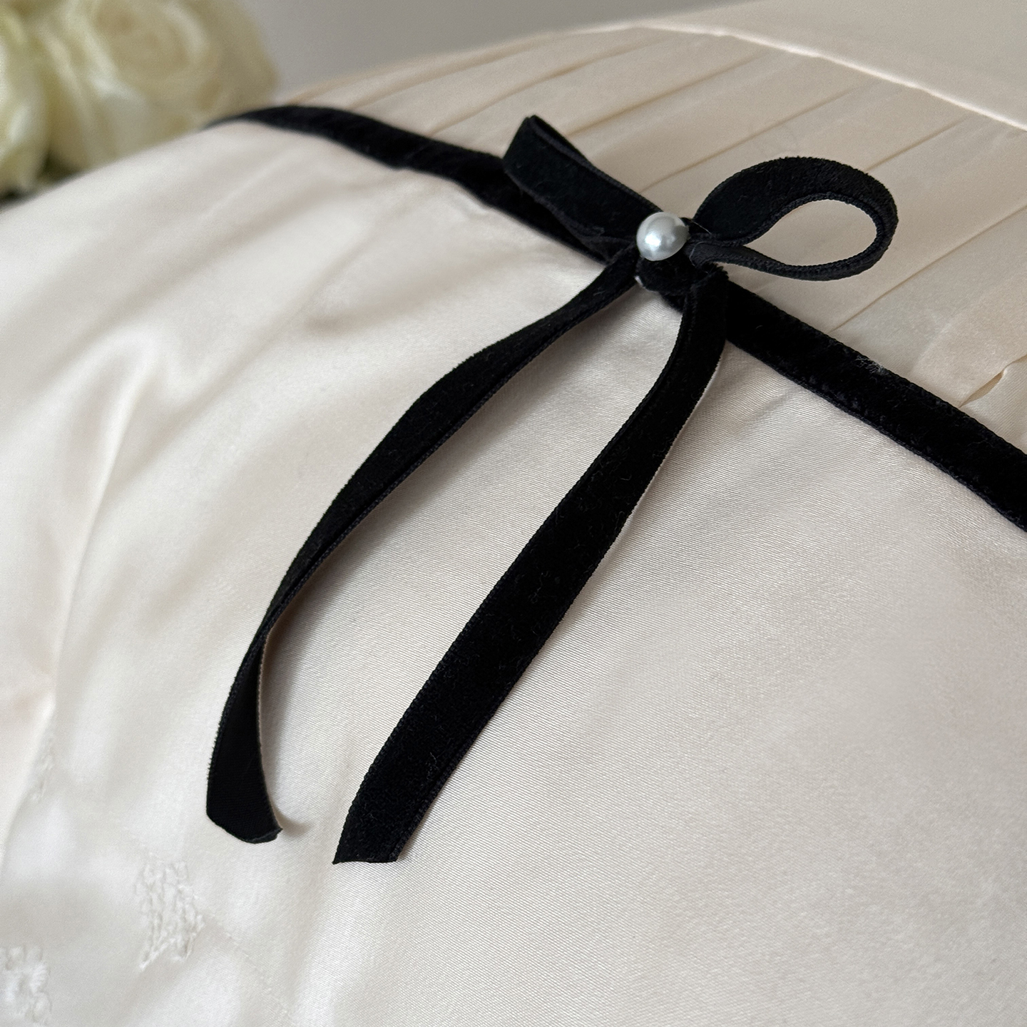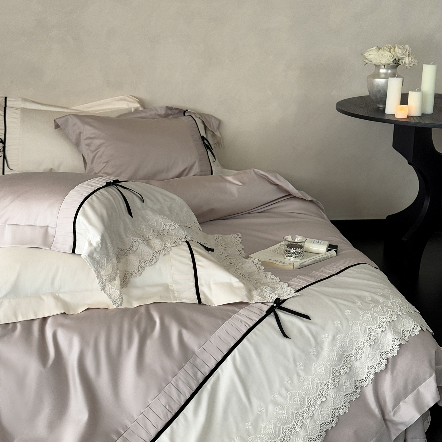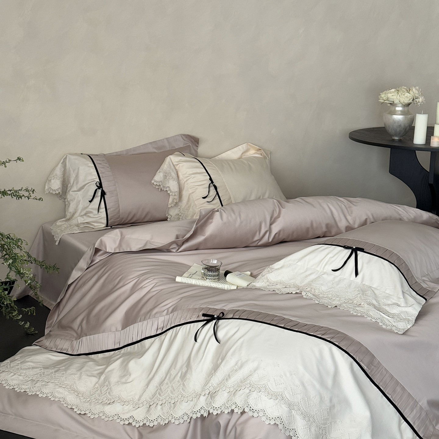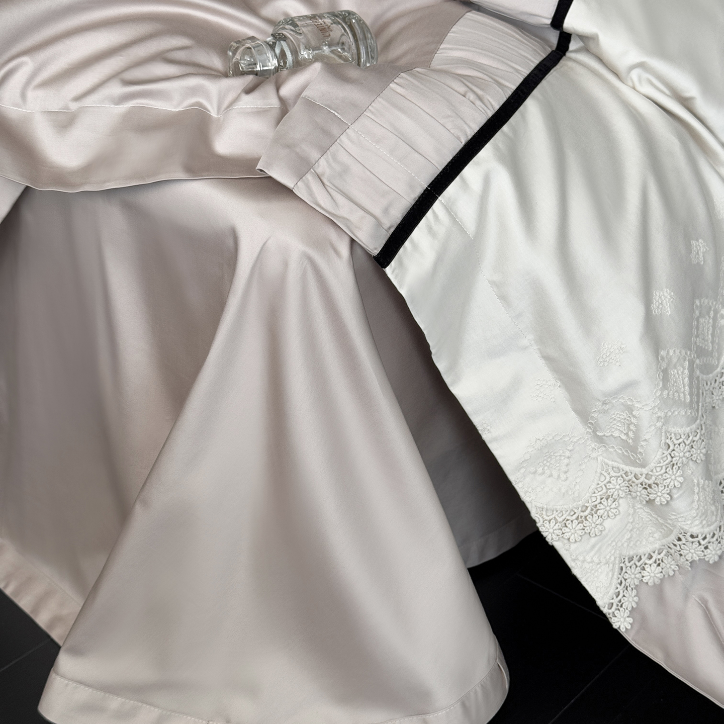 (总)佳汐蓝 2025春夏新品双层皱皱纱刺绣+织带+荷叶边四件套--白茶花,奶白,曲奇