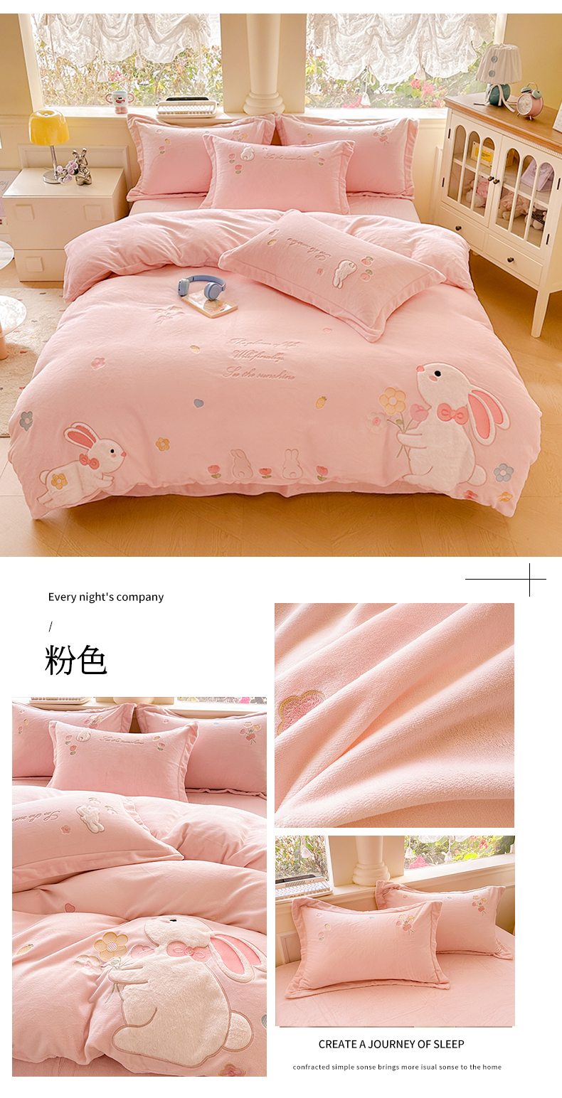 商品名称:金绣美居 2025新款牛奶绒毛绒贴布绣花保暖四件套-森系小兔 森系小兔-粉色