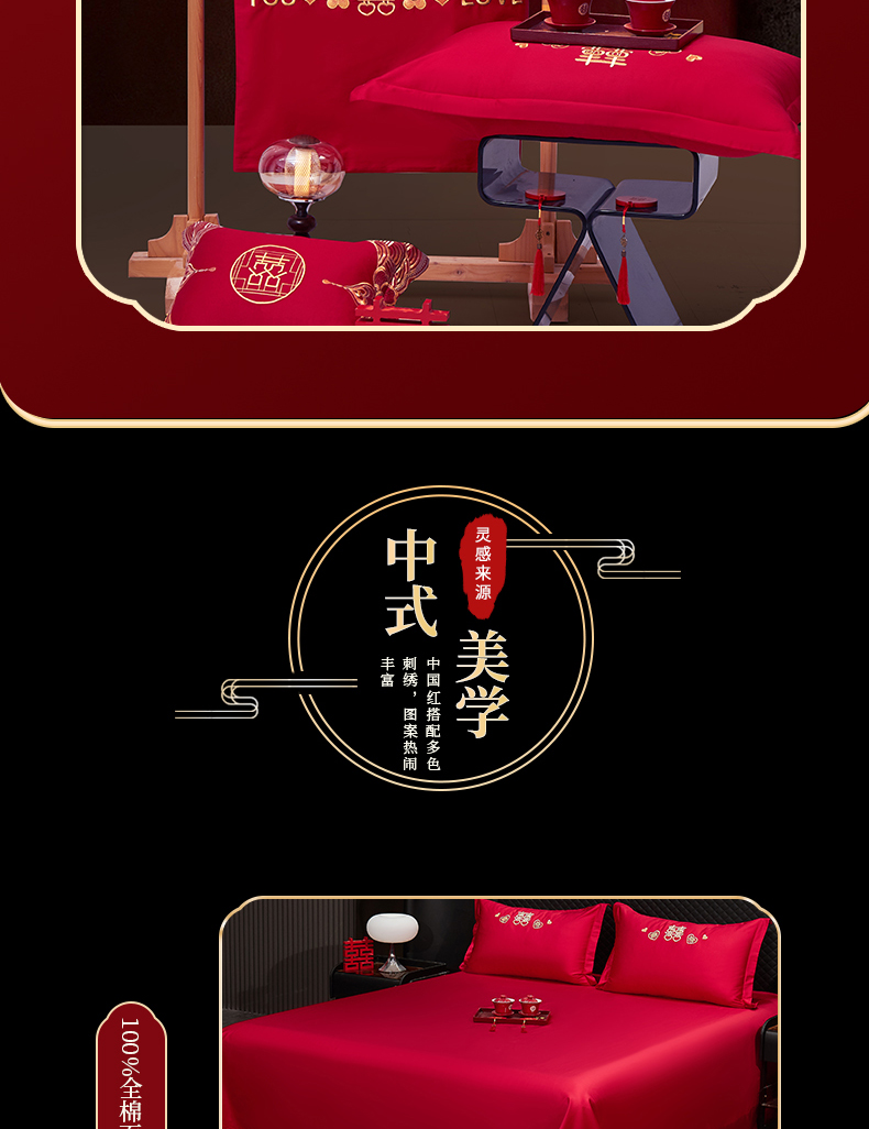 浩情国际婚庆供货中心 2026新款100%全棉纯棉新中式刺绣大红结婚婚庆四件套多件套 HQ-百年好合