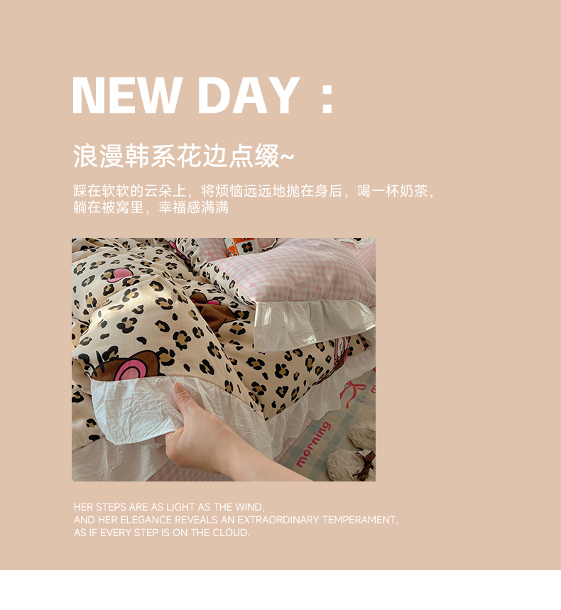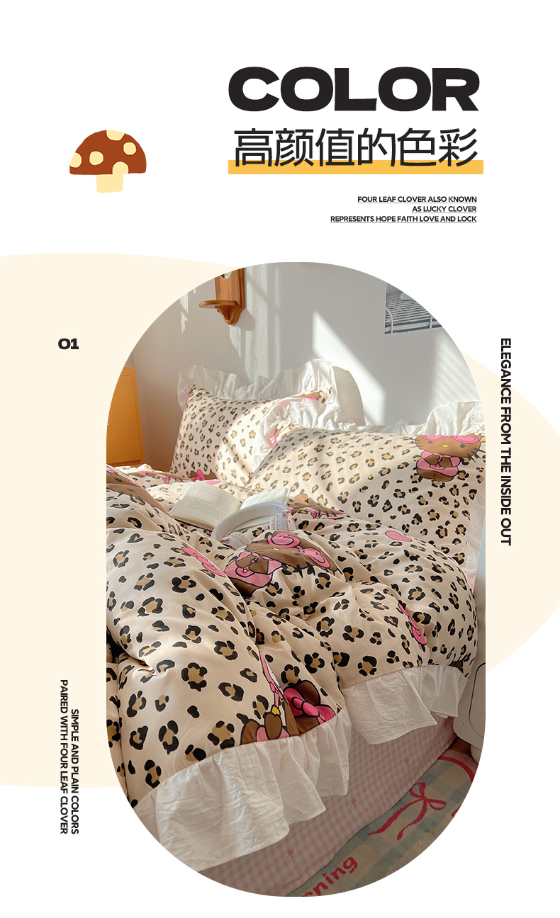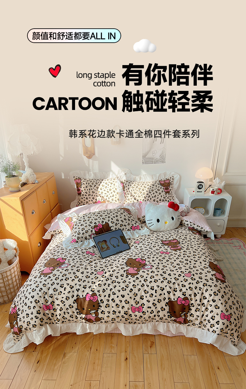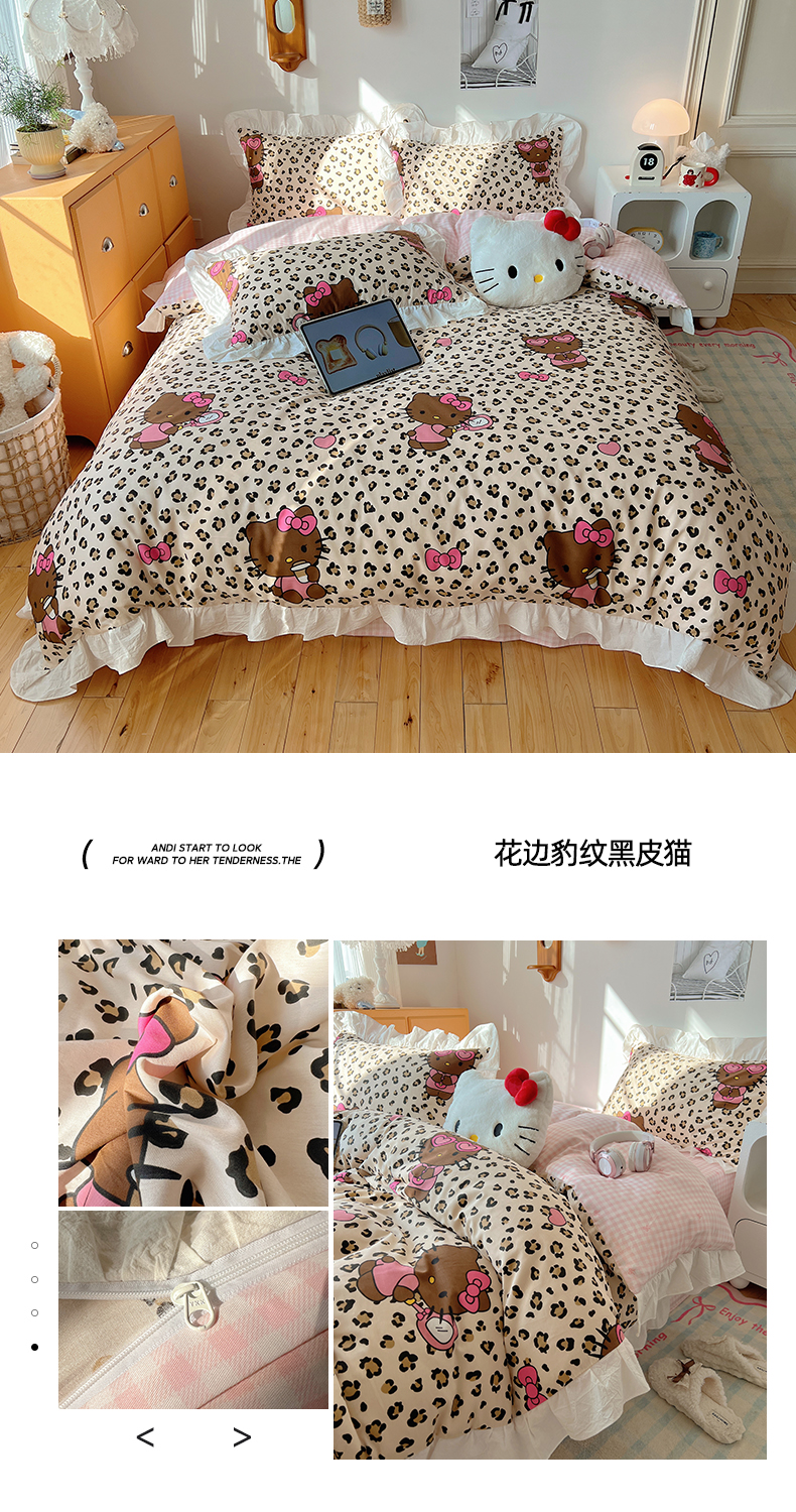 商品名称:六巷胡同 2026春夏新款韩系可爱风花边款卡通全棉四件套(第一系列) 花边豹纹黑皮猫
